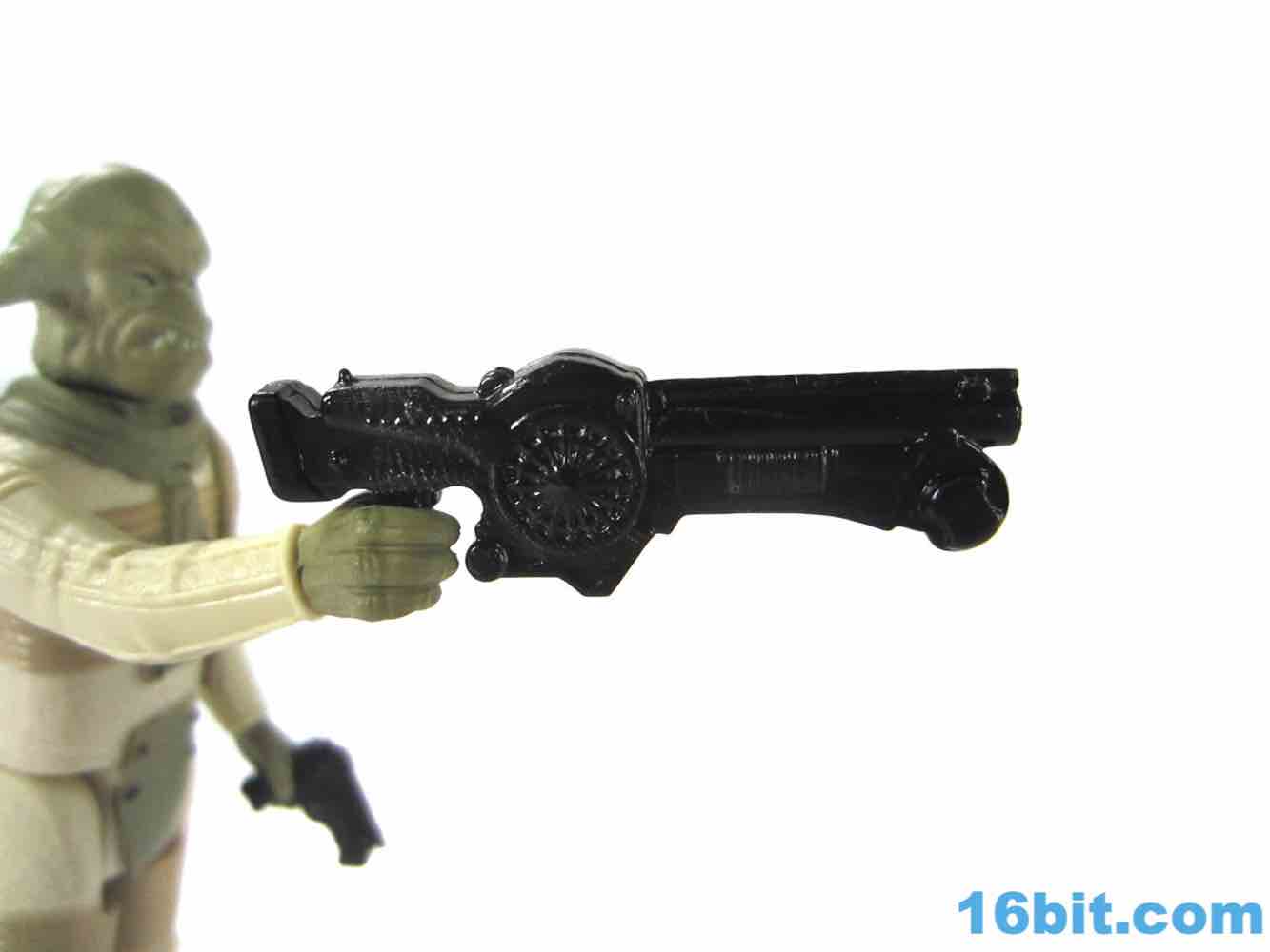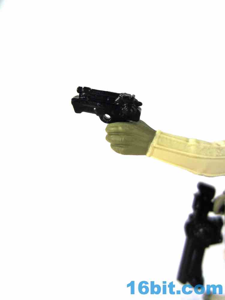 The rifle is great - glossy black, and it fits right into his three-fingered hand. It's painted, so that's weird, but it looks nice. Meanwhile the pistol seems molded in black, and fits just fine in his other hand. Given the figure's army-buildability, the inclusion of two weapons certainly raises the reasons to get more than one and set up a nice little display. (I can't afford to keep doing that.) The figure is almost completely matte other than the gun, which means you have something that's mostly - but not entirely convincingly - retro.