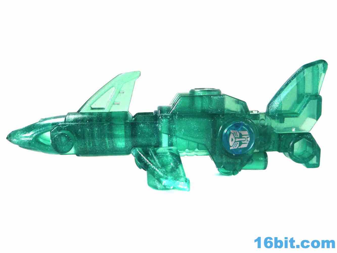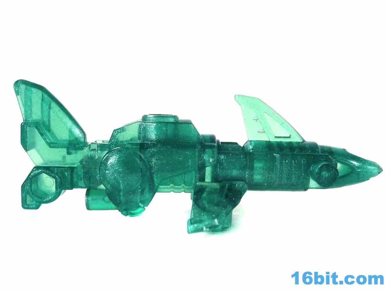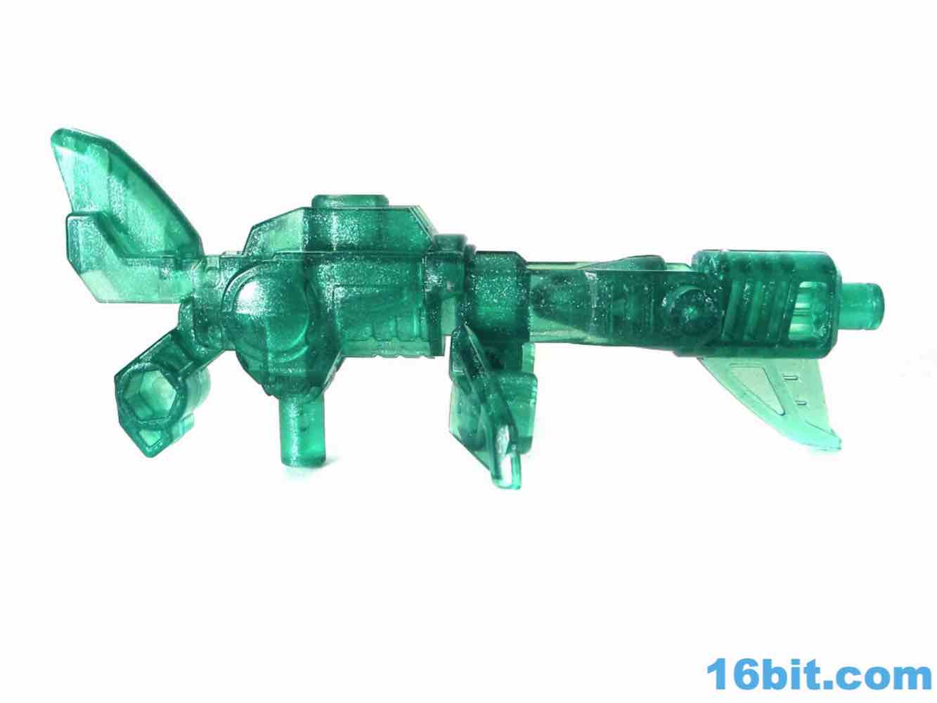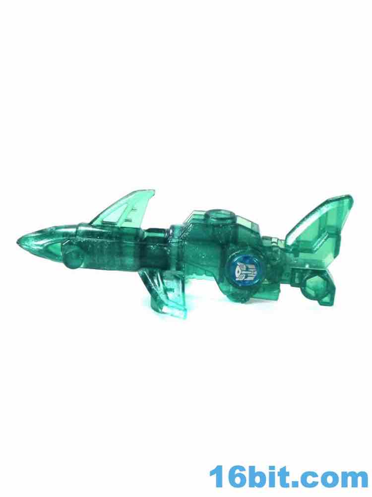 There's no robot mode - just shark, or gun. And it's a big one, too! The clear green pearly shark is about 3 1/2-inches long, give or take, with a fairly simple transformation. The fins fold down, the barrel spins out, and the grip flips out - plus there's an optional tail piece that moves. Assembly is fairly easy and this would have been a great US release were it not for small, choke-hazard-sized pieces. There are numerous 5mm pegs and holes designed to merge with other Microns to form increasingly ridiculous weapons. As it is, you can plug on Mini-Cons, BMOG bits, or Energon weapons to make big and goofy weapons or just enjoy the thing as it is.