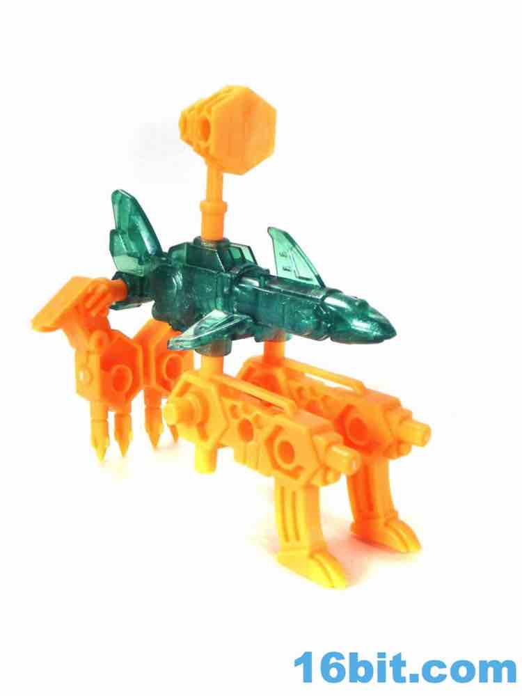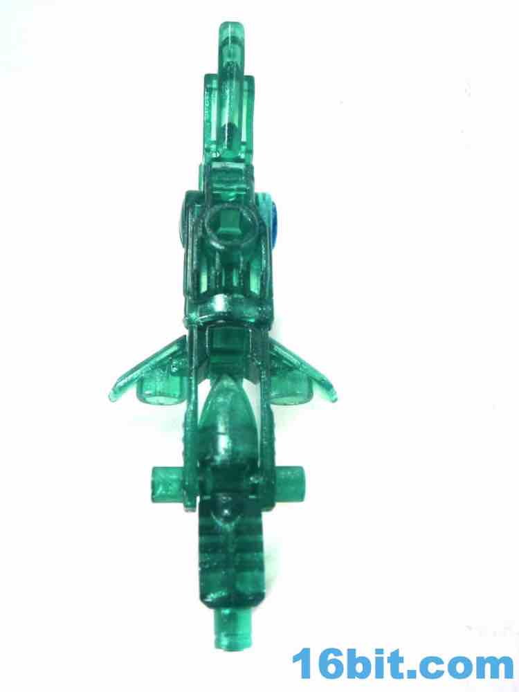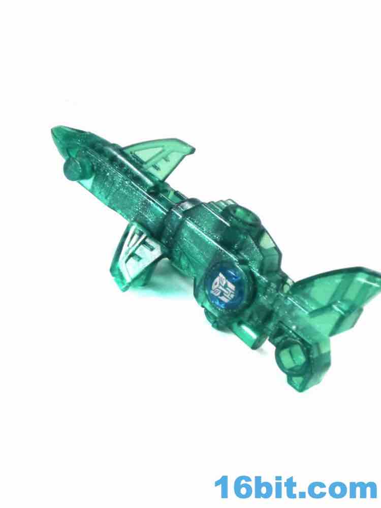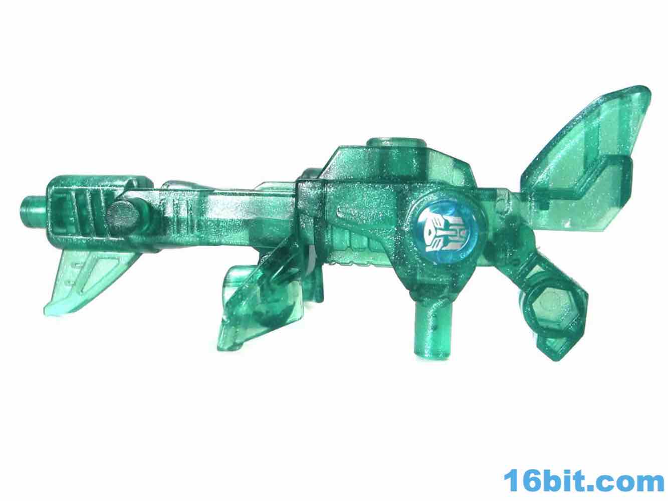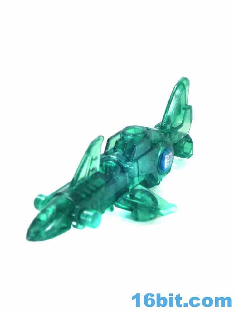 There's no robot mode - just shark, or gun. And it's a big one, too! The clear green pearly shark is about 3 1/2-inches long, give or take, with a fairly simple transformation. The fins fold down, the barrel spins out, and the grip flips out - plus there's an optional tail piece that moves. Assembly is fairly easy and this would have been a great US release were it not for small, choke-hazard-sized pieces. There are numerous 5mm pegs and holes designed to merge with other Microns to form increasingly ridiculous weapons. As it is, you can plug on Mini-Cons, BMOG bits, or Energon weapons to make big and goofy weapons or just enjoy the thing as it is.