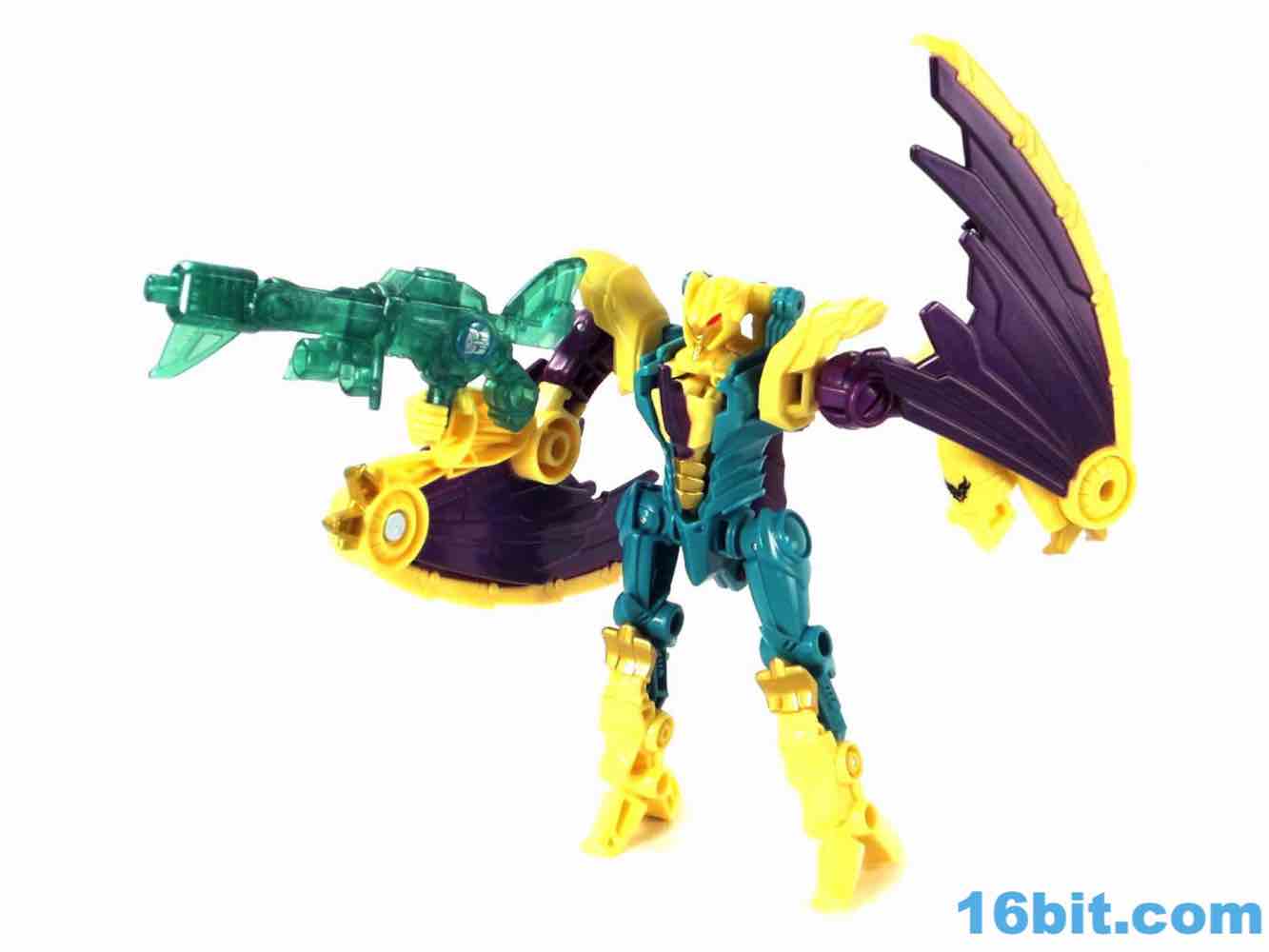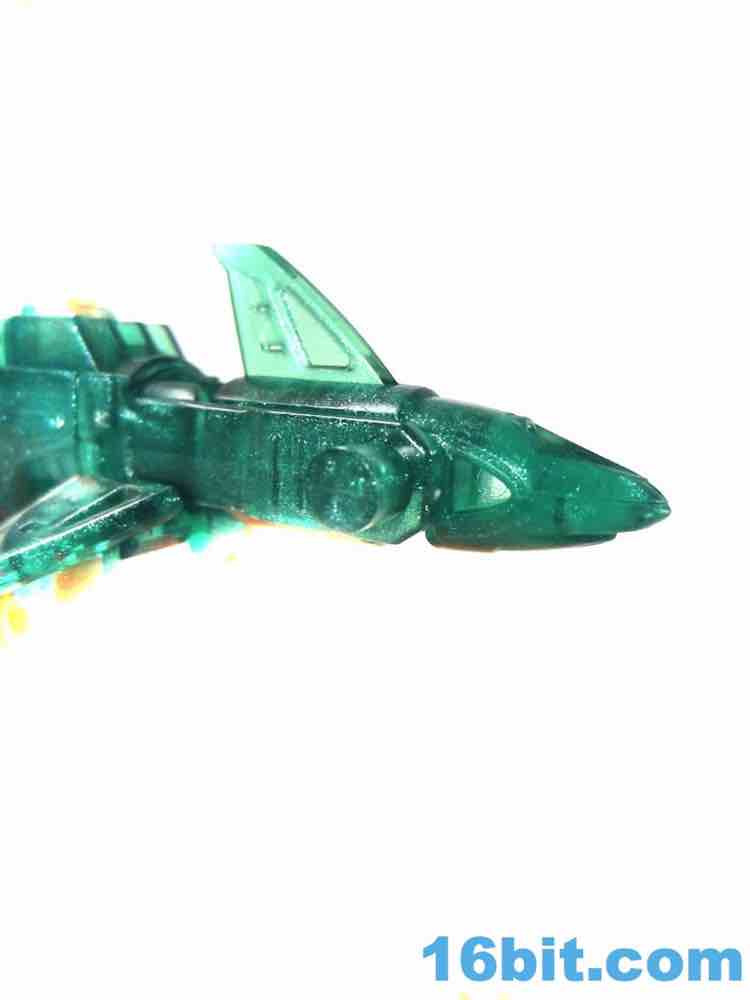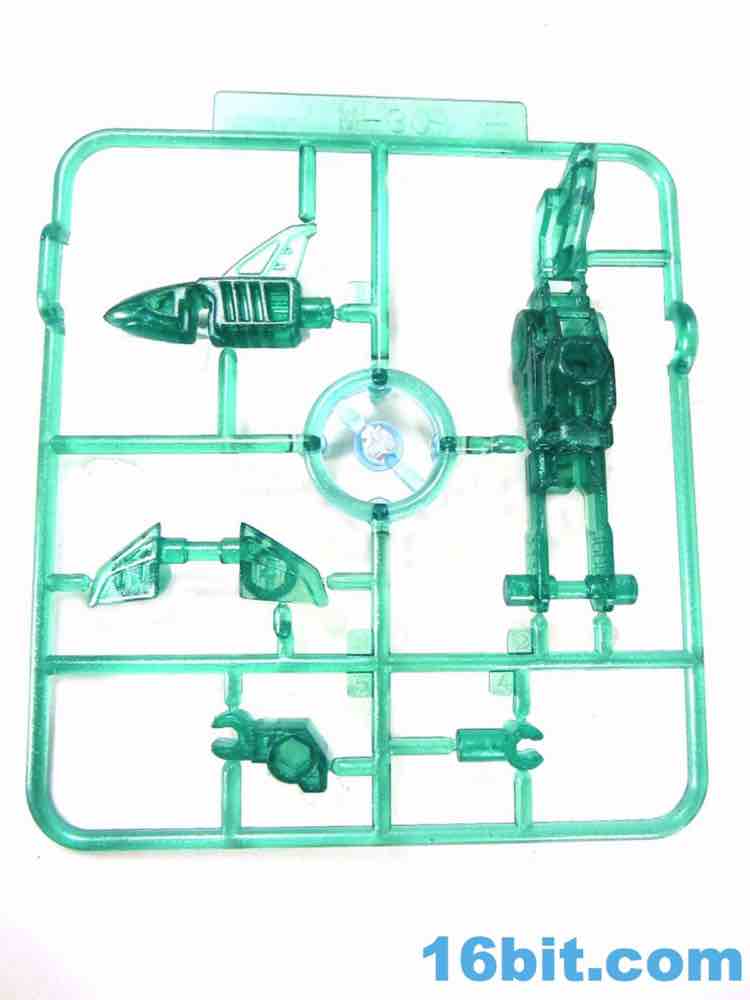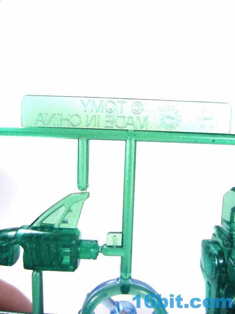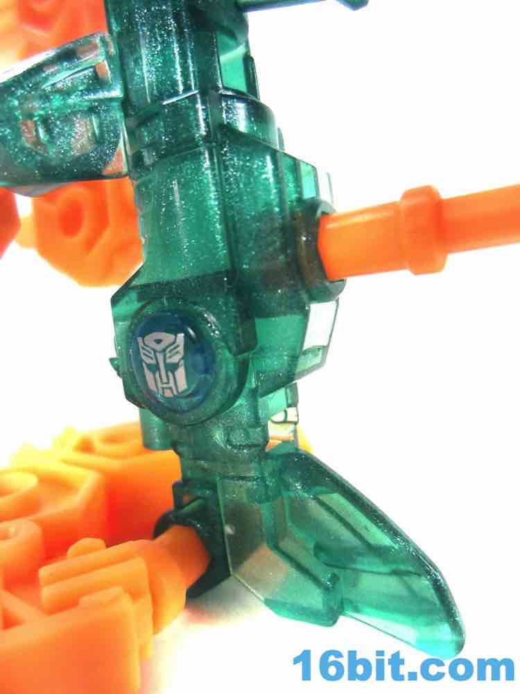 There's no robot mode - just shark, or gun. And it's a big one, too! The clear green pearly shark is about 3 1/2-inches long, give or take, with a fairly simple transformation. The fins fold down, the barrel spins out, and the grip flips out - plus there's an optional tail piece that moves. Assembly is fairly easy and this would have been a great US release were it not for small, choke-hazard-sized pieces. There are numerous 5mm pegs and holes designed to merge with other Microns to form increasingly ridiculous weapons. As it is, you can plug on Mini-Cons, BMOG bits, or Energon weapons to make big and goofy weapons or just enjoy the thing as it is.