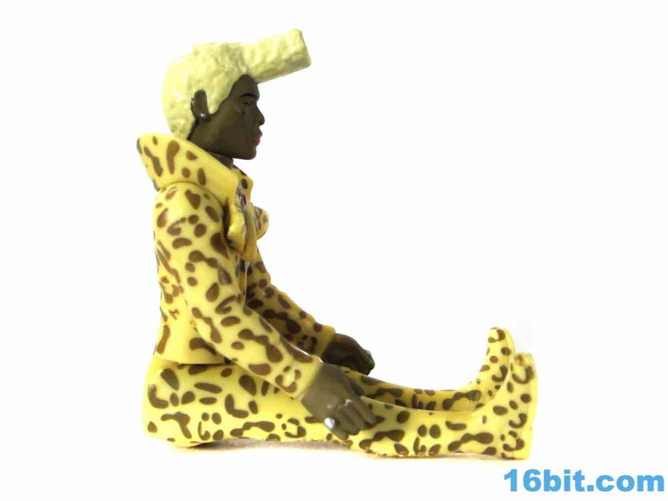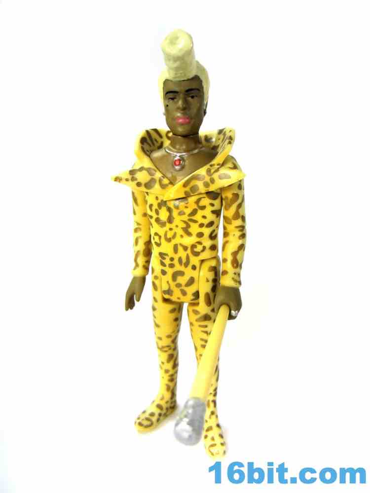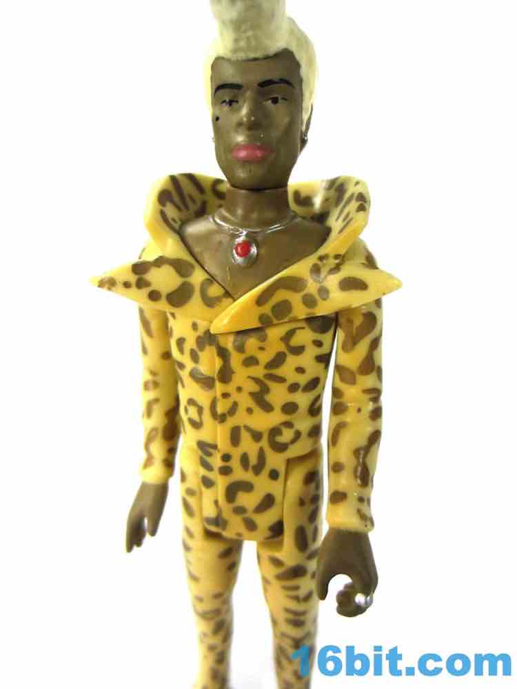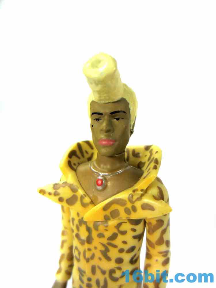 The sculpt is good, and it does a fine job of replicating the radio host's extreme wardrobe. The distant future of male fashion looked a lot like a variation on women's wear of the 20th century - big collars, a scooped-out neck, and leopard print were old hat by the time this movie came out. But on dudes? Well, this was new - the figure is molded in a tan color with lots of paint to keep the cat pattern consistent. This is something above and beyond what you'd get in this style of figure, as are the painted rings on his hands and the painted necklace.