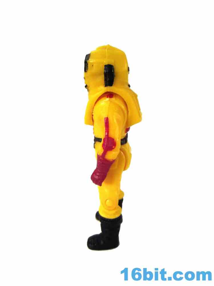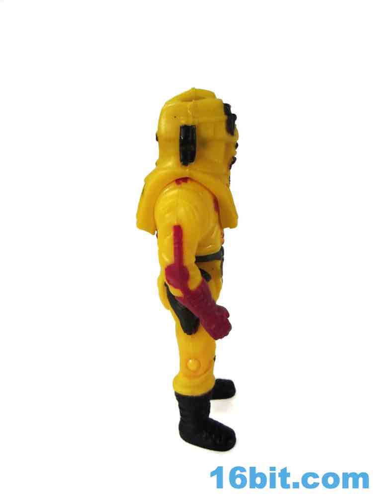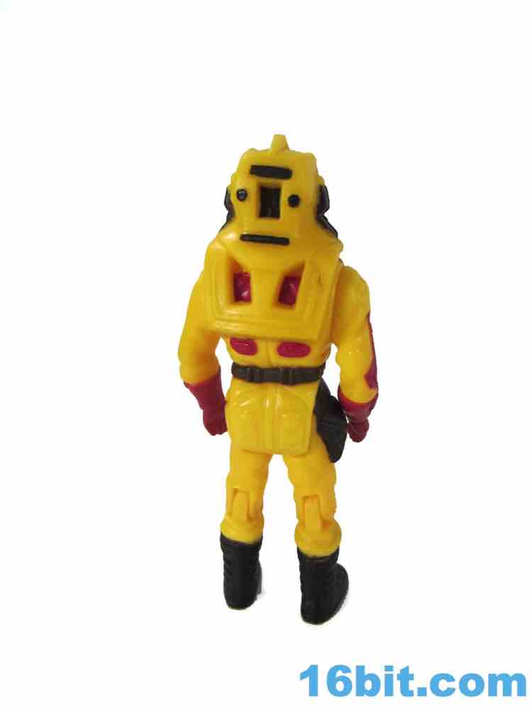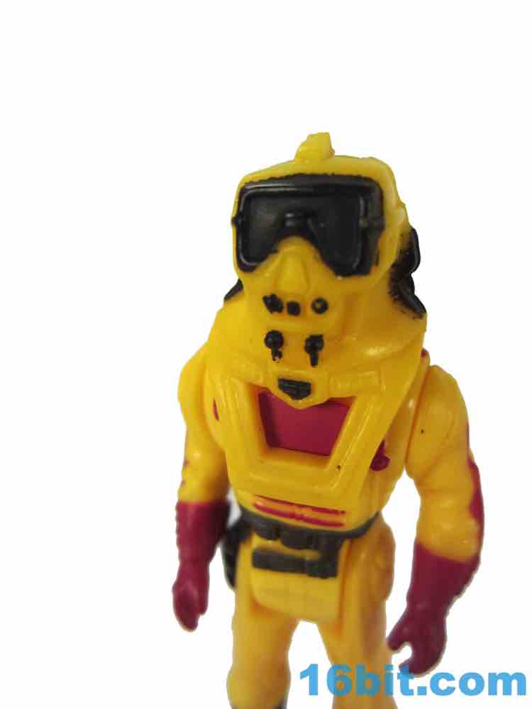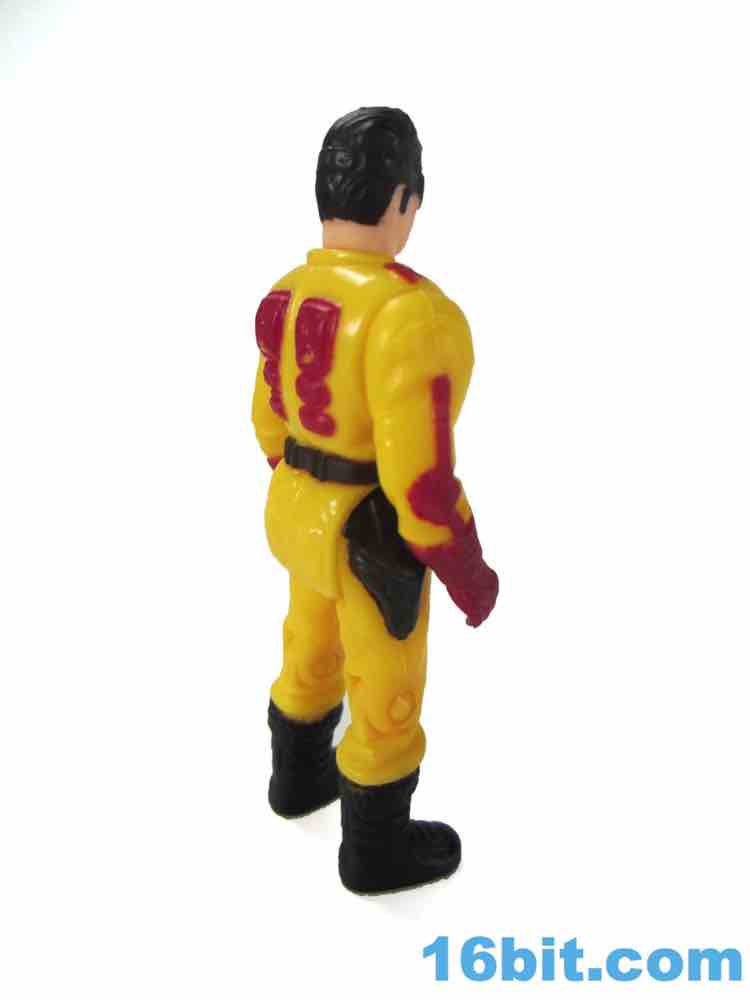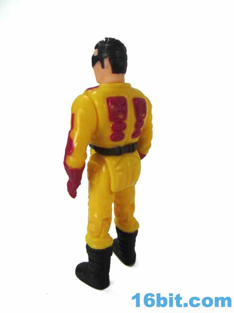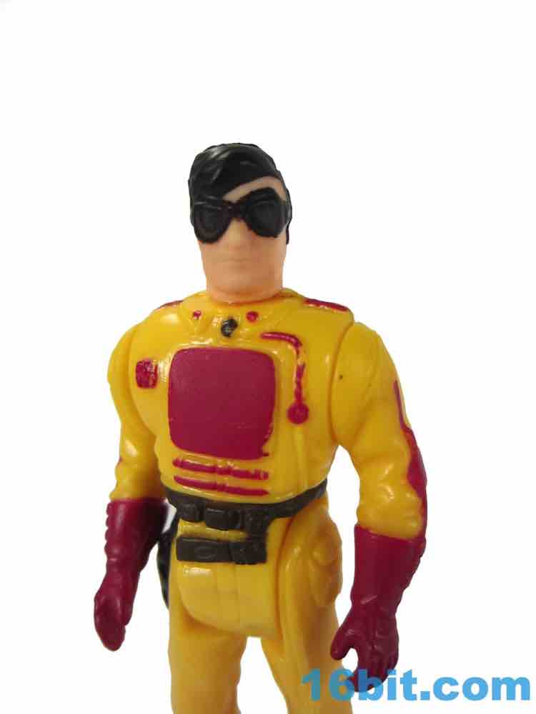 Brad Turner is a distinctive pilot. With a mask named Hocus Pocus, the sunglasses of his unmasked head are carried over to the helmeted look. The facial sculpt is soft, and the black hair could just as easily be Robin from the Batman comics. His yellow suit has black and purple markings, with painted gloves and boots. The hands weren't designed to hold accessories, but he does have knees - a feature popular on this scale of action figure. The removable helmet has nowhere to be stored on the vehicle, so if he doesn't wear it you might lose it. Kenner did a bang-up job painting the front and back - there are black details on both sides, and the figure even has some unique sculpted bits on the back of his jacket. Sure, he's a little doughy and his head is small - but that was common with Kenner (and Hasbro) until the 1990s. Nobody quite mastered the whole removable helmet thing.