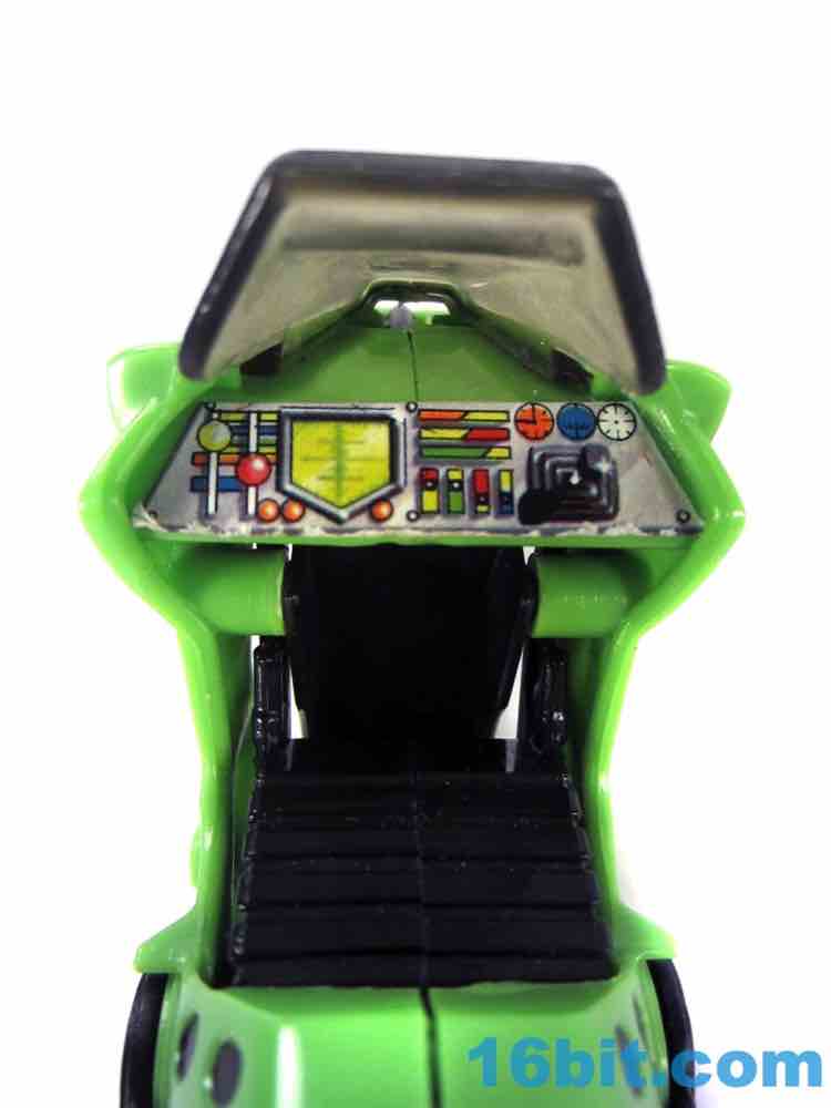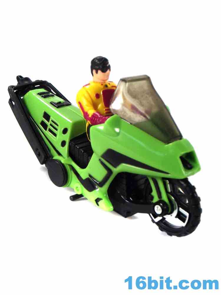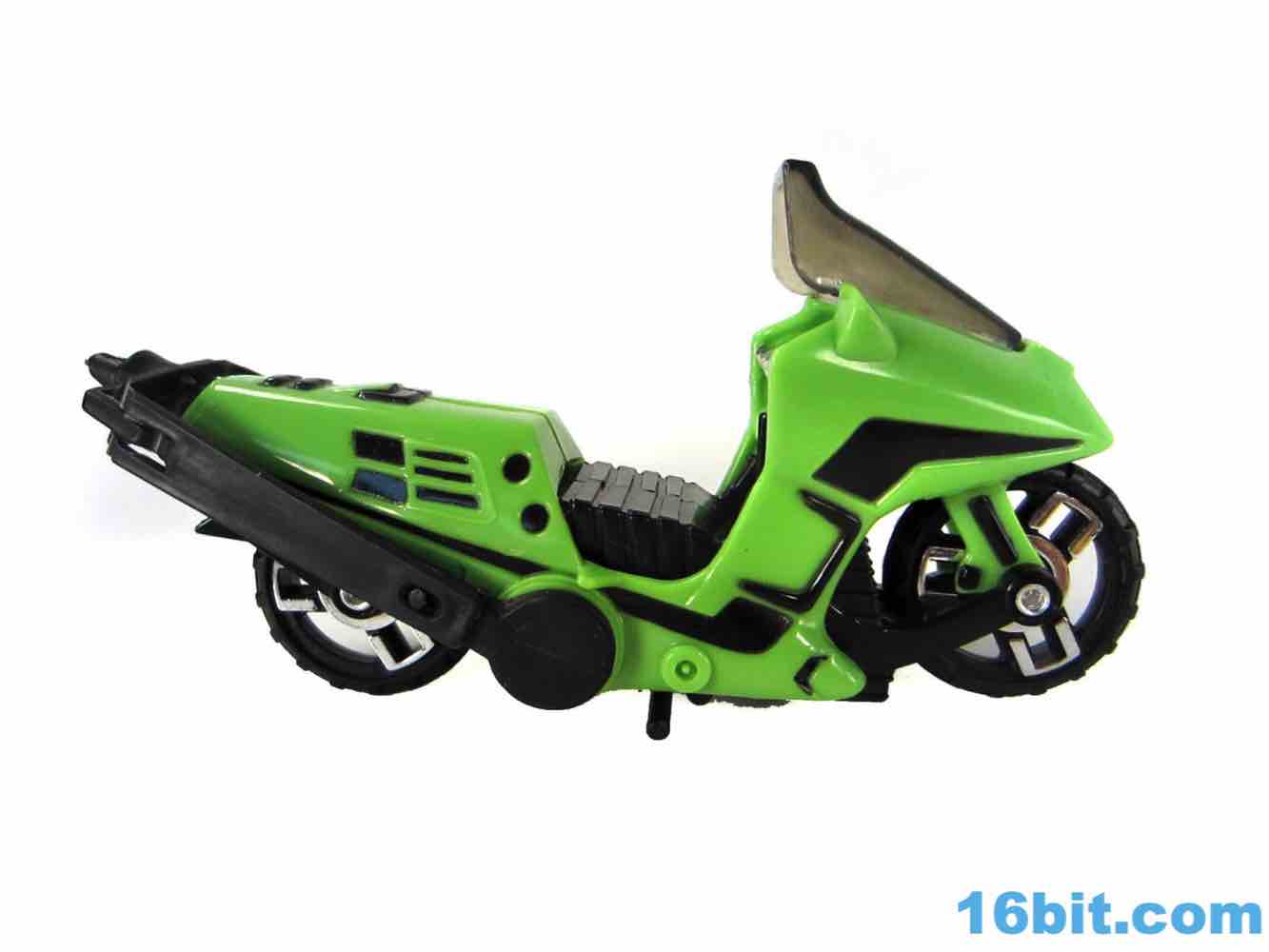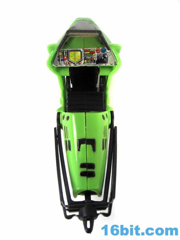 The vehicle itself is pretty simple - the "bike" has a seat that's more like a Vespa or other scooter, thanks to the design's moving parts. There's a kickstand to keep the bike upright, which also becomes part of the landing skids. The wheels have some silver chrome paint on them, and the green bike has black detailing as well as a smattering of stickers. They all held on well given the toy's age - it's 30 years old! Kenner did a nice job here, and it was battered around in my toy boxes and moved a few times too. The wheels spin nicely, and everything holds together well.