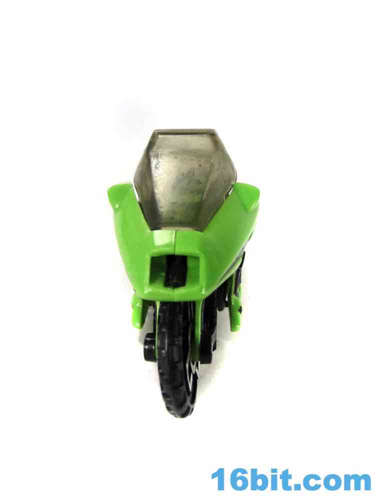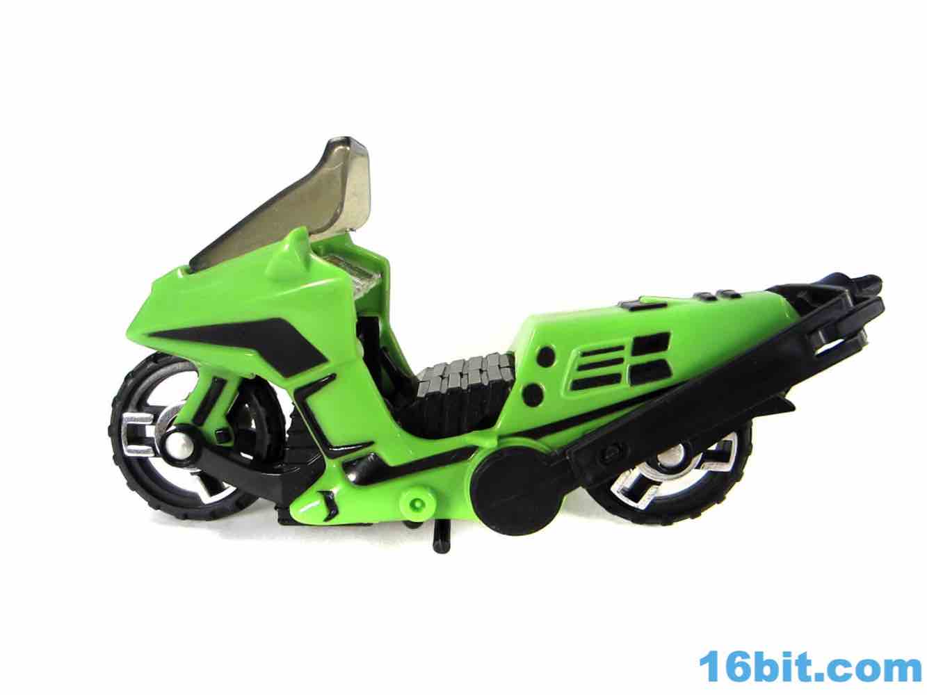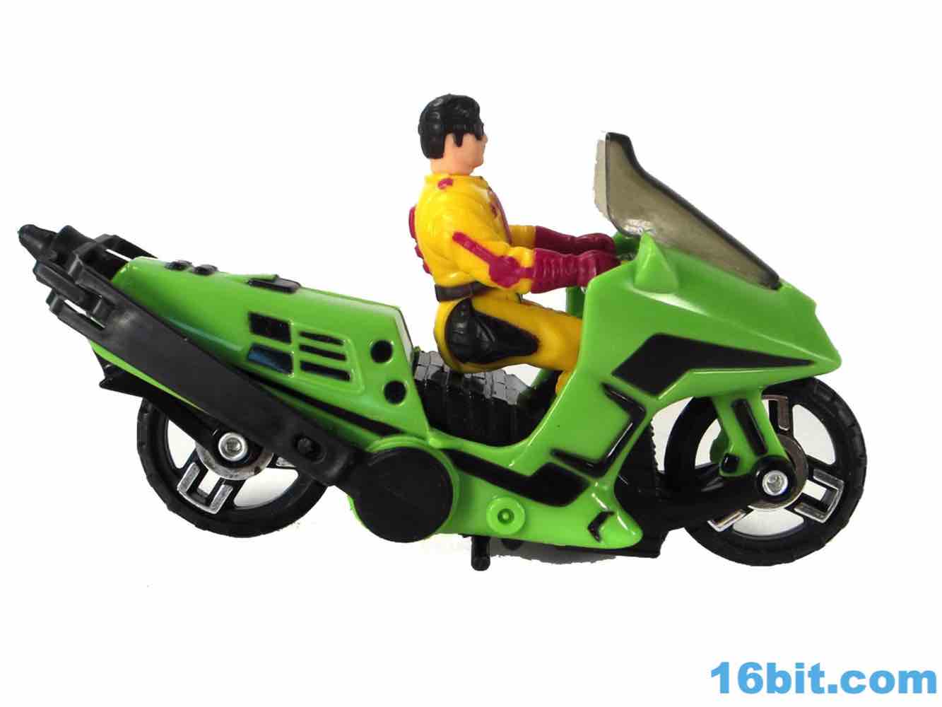 The vehicle itself is pretty simple - the "bike" has a seat that's more like a Vespa or other scooter, thanks to the design's moving parts. There's a kickstand to keep the bike upright, which also becomes part of the landing skids. The wheels have some silver chrome paint on them, and the green bike has black detailing as well as a smattering of stickers. They all held on well given the toy's age - it's 30 years old! Kenner did a nice job here, and it was battered around in my toy boxes and moved a few times too. The wheels spin nicely, and everything holds together well.