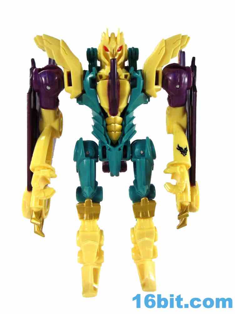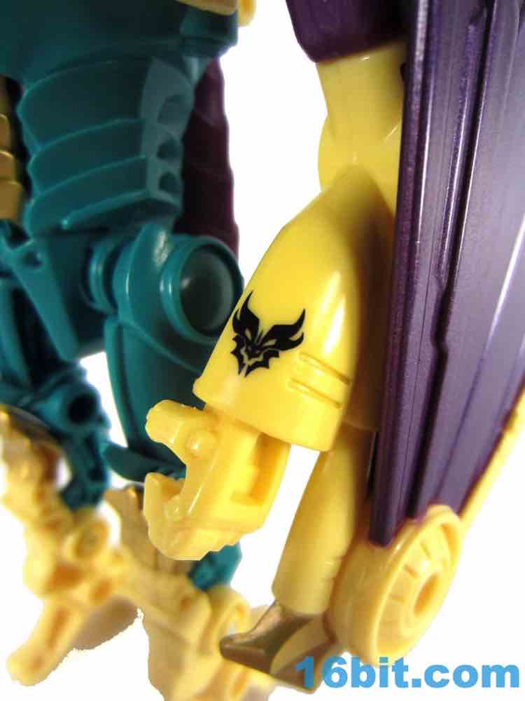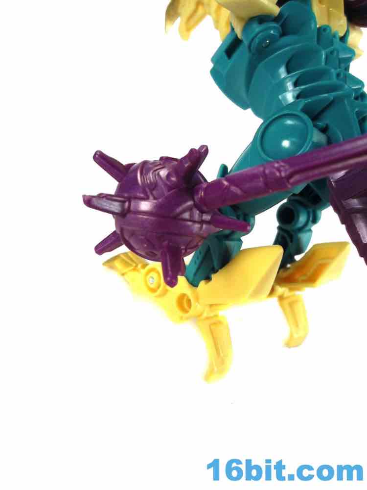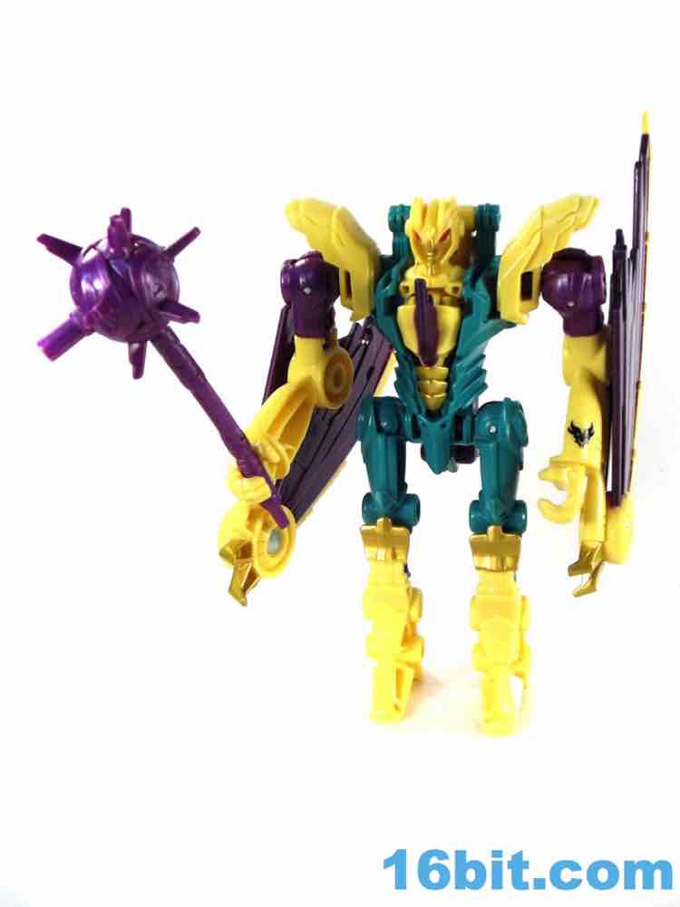 The 5-inch tall robot mode looks just like the Legion toy, with a bigger head and some engineering changes. It feels much sturdier and has enlarged fists for 5mm weapons. There are actually several places to mount weapons on this toy - great if you have Mini-Cons or BMOGs or Constructbots weapons - but oddly, no obvious place to mount his mace weapon. The pale yellow plastic toy has green, gold, and purple trim which fits together nicely. (Oh, and there's a color variant out there to boot.) This is the first release, and the only differences are the color. They all have articulated shoulders, hips, and biceps. If you're feeling generous you may consider the ankles to be as well, but based on their use in the transformation I would disregard counting them and say he has 6 meaningful points of articulation.