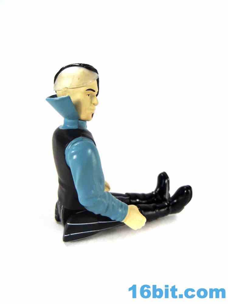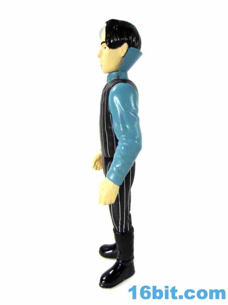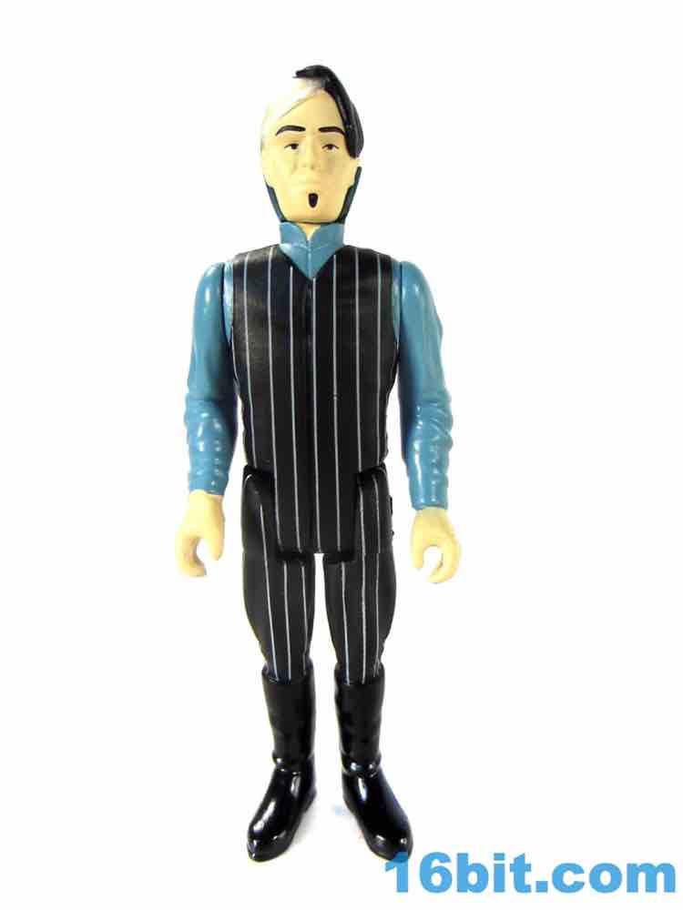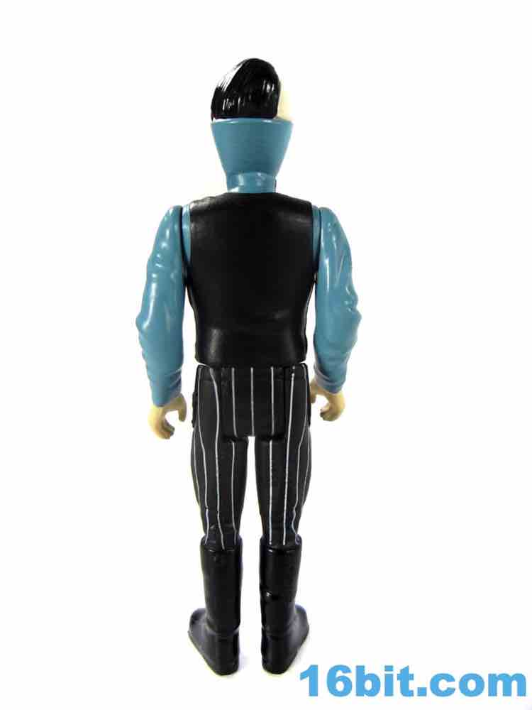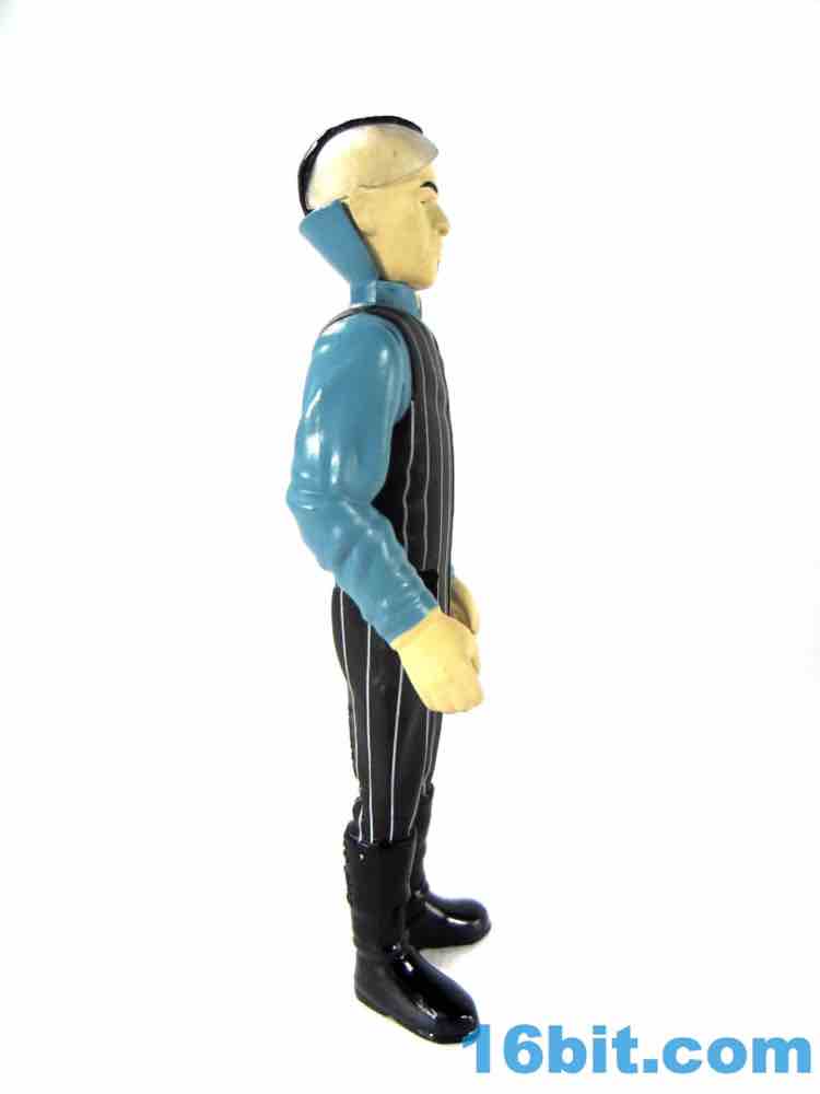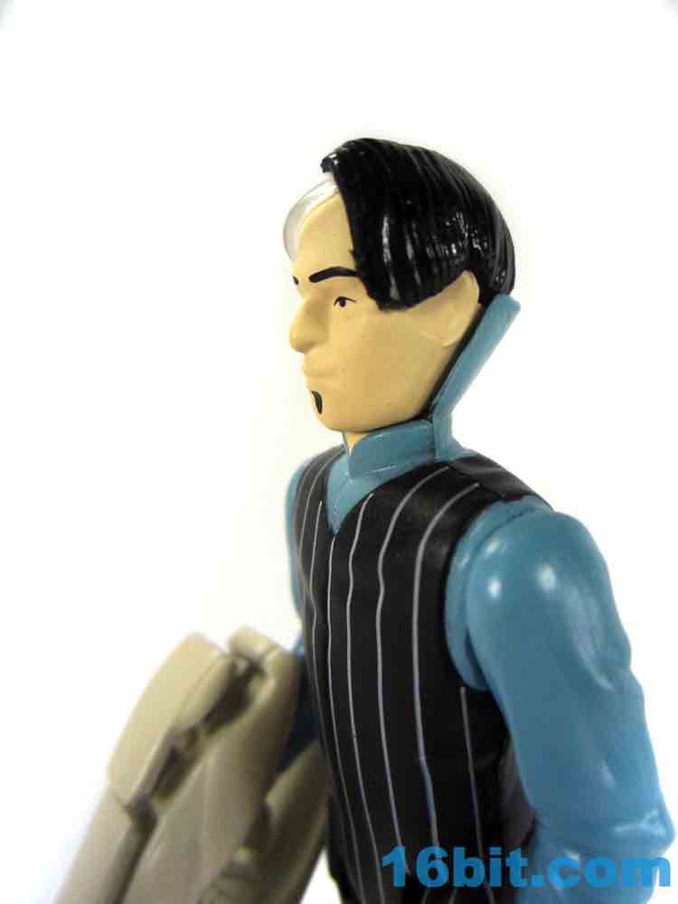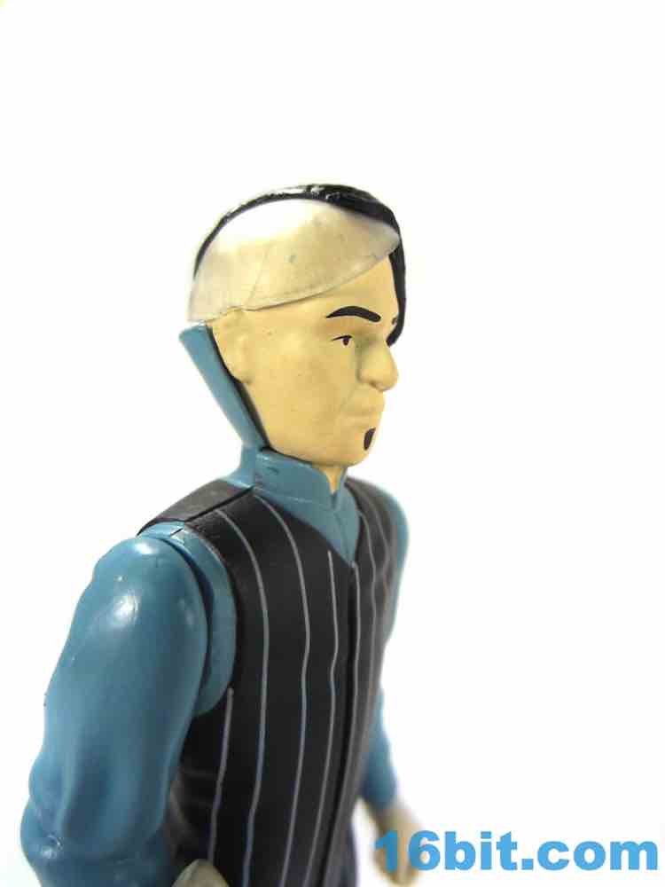 Zorg is a decent figure but falls prey to some of the trappings of other ReAction figures in terms of deco and engineering. The squared-off legs are weird when he sits down, and the deco is a little too modern. The stripes are clean and narrow, and glossy black boots seem above and beyond what the 1980s-style should offer. There's a clear hat on the bald side of his head too, which is a brilliant feature but probably the kind of thing we'd see done with paint rather than a sculpted piece of clear plastic. Zorg's head is molded in a color that isn't his skin tone, meaning the flesh paint is painted over it and it looks like the black, glossy hair is as well. It's a convincing Zorg, but the aesthetics are more of today.