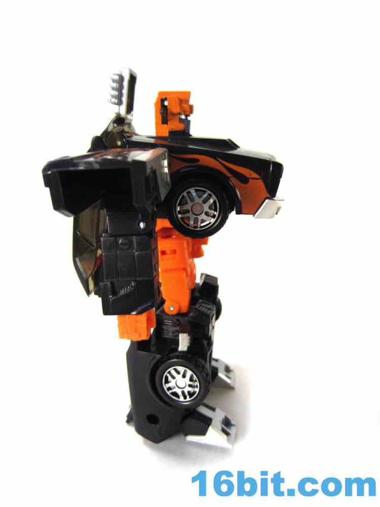 Transforming this one is a snap - pull out the doors to make the arms, pull back the rear of the car to make the legs, and fold down the chest. His head pops out with the Wheeljack-style ears springing in place, and voila - you've got yourself a fine robot here.