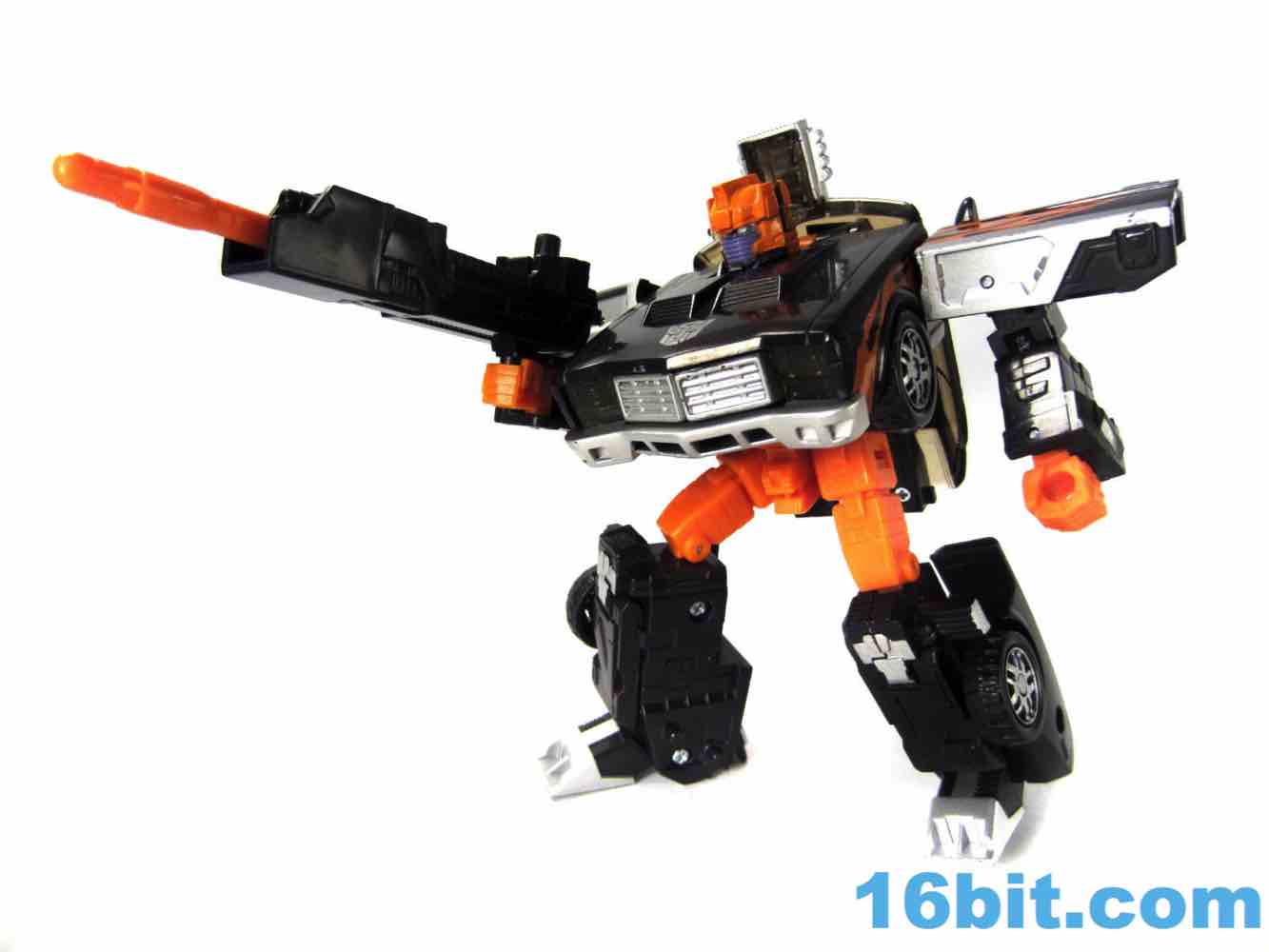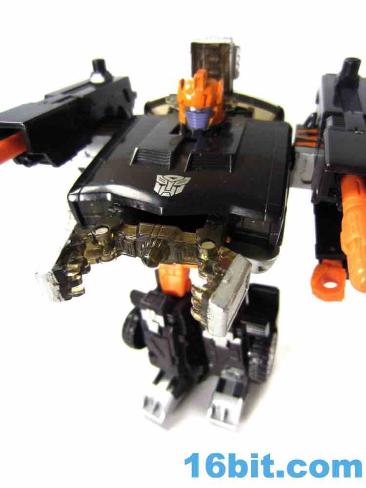 As a robot you can use his guns in his fists, or mount them to his shoulders. It's great to have options. A silver movie Autobot symbol appears on his chest, as does a large chunk of car. Most modern toys tried to borrow the movie's various panel splitting to make it look less obvious, but here there's no mistake that he's got a car for boobs. Personally, I like these blocky designs as they hold together nicely and transform quickly. They're not as simple as G1 toys, but the articulation makes up for any other shortcomings this figure may have. Personally, I can't get enough of this mold.