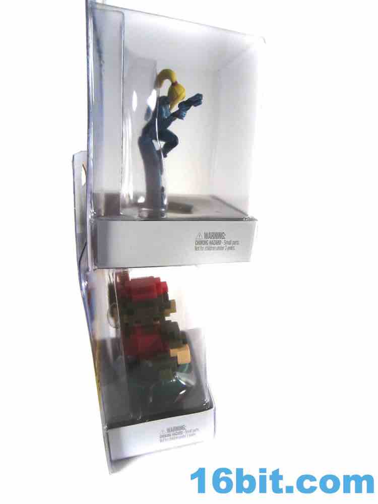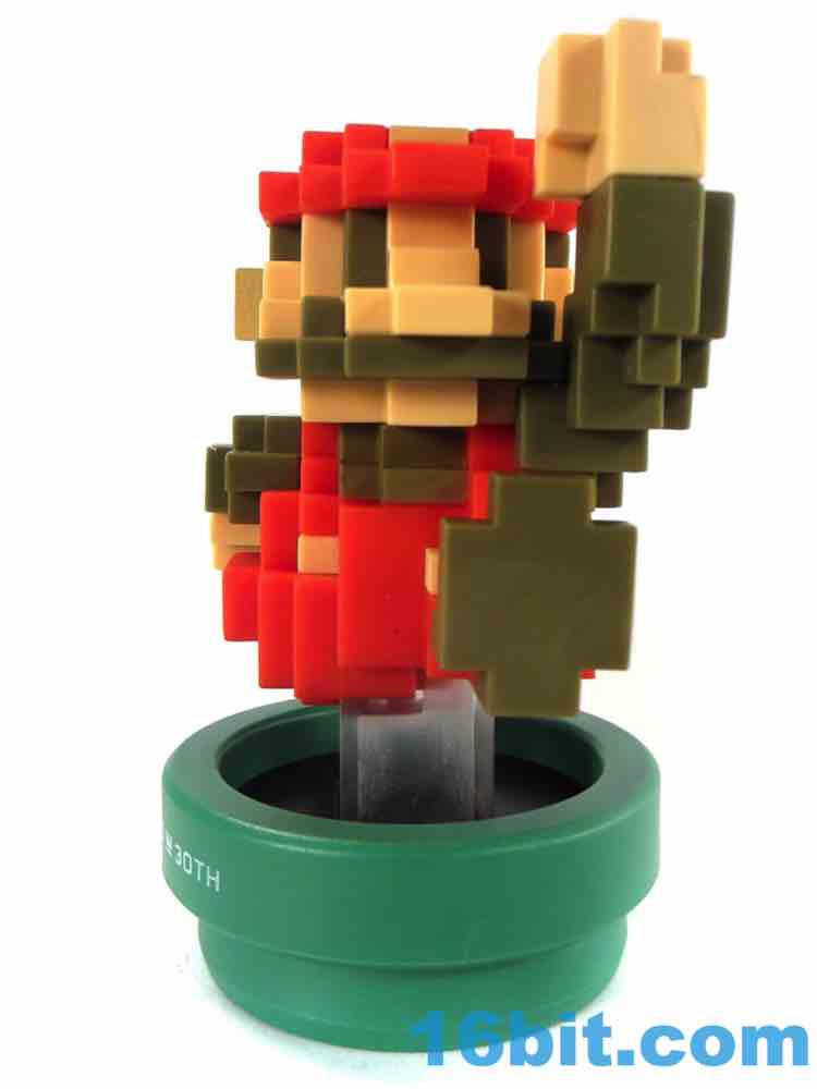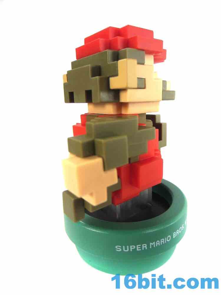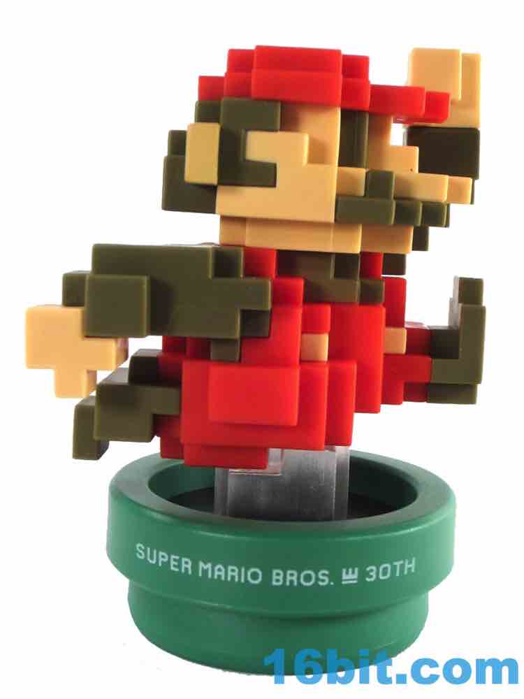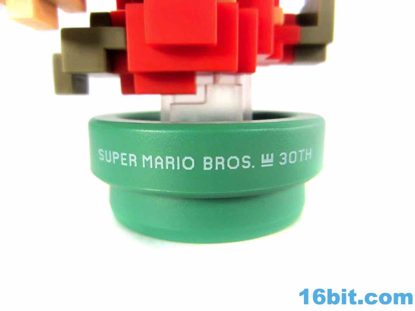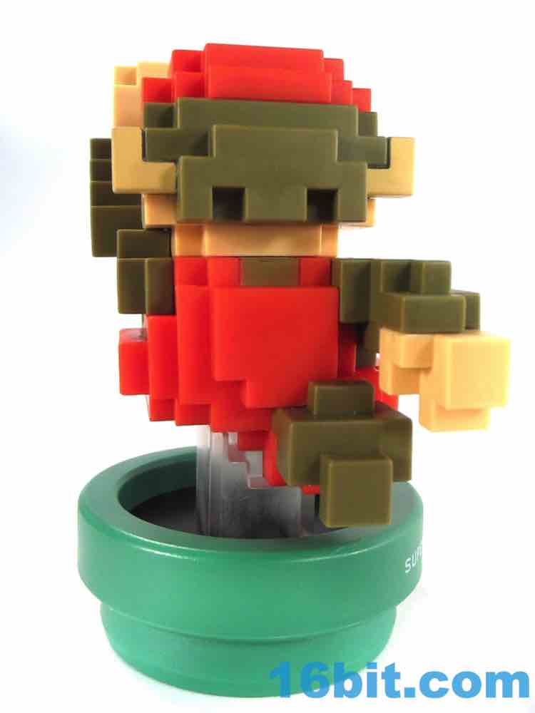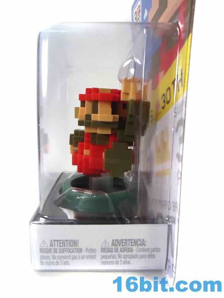 This particular figure is more massive than his companions, despite sporting a skinnier plastic bubble package. The pixel figure does a good job of proving Nintendo basically understands how to do a "retro" toy by delivering the colors from the original game rather than illustrations based on said game - a literal interpretation being the easier-to-find version totally works for me. I've got a lot of Mario toys, so I'm pleased when they find a way to do it different. It's pretty much a pixel-perfect recreation of non-super Mario's jumping sprite with the added dimension we rarely see. If you rotate him, you'll see a pair of yellow pixels stand in for the letter M on his hat, both eyes, plus the bottom of his shoe and a head-on look at his face. Nintendo doesn't bring new dimensions to its old game sprites all that often, so seeing something like this really nails down their commitment to drag nostalgists into the present. It's old and new, breaking the illusion for its green pipe display stand which reads "Super mario Bros [crown] 30th." As a small collectible toy trophy for under $15, it's actually a perfectly nice little tribute piece - not cheap, but not ugly either. With no articulation and nice, clean paint it's a cute little statue and that alone is enough for me to say snag it if you see it. I sincerely hope to see more 8-bit figures like this for, I hope, Zelda and Metroid maker games down the road. (This will never happen.)