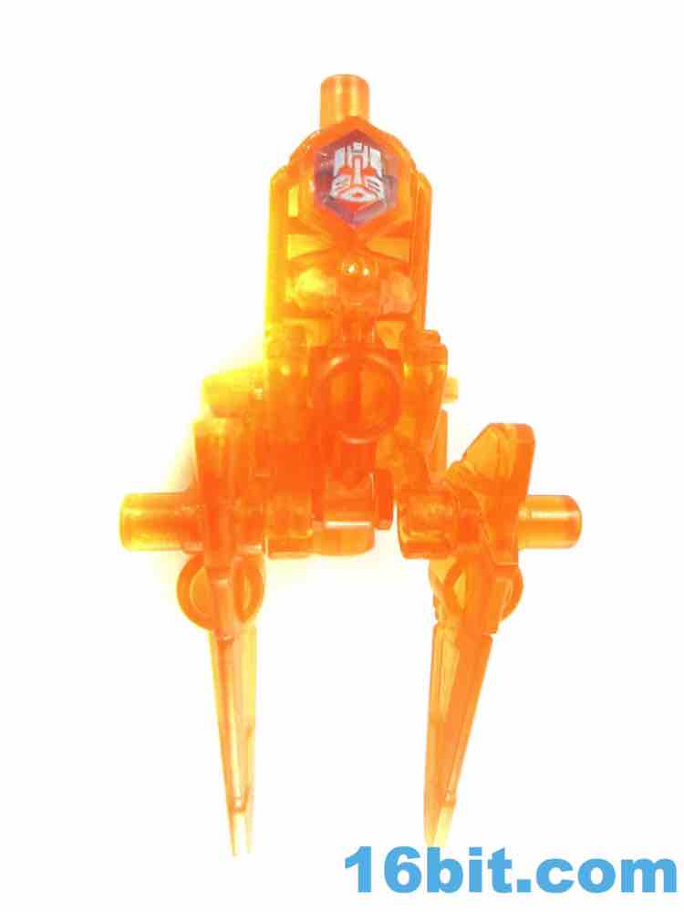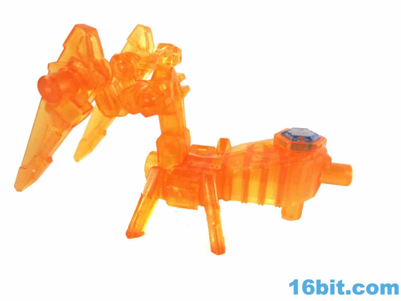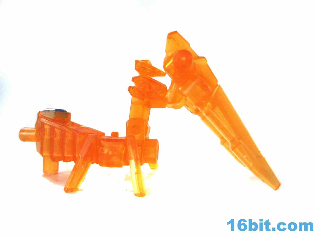 Transformation from weapon to creature is easy - the torso folds up, the arms fold out, and four teeny legs unfold from under the torso. It's simple and painless, and pretty cute. The one-eyed two-pronged walking orange optic stabber has a big posterior and is positively covered in 5mm pegs and holes. It's amazing - these things were clearly developed to connect to other toys, and you can make some pretty gnarly contraptions with it. The jumbo sword Gojogekidoho is pretty hideous, but at least the creature rocks. He has 4 5mm pegs, 3 5mm holes, and a couple of joints per arm give you a certain level of choice when it comes to posing and customizing these things. I like the frill around the head and the simple sculpting. It's not overdesigned, there aren't tons of textures or wires that serve no purpose, it's a simple little creation that just plain works. I'm not saying it's terribly fun compared to the ones that become guns, but it's probably the only bright orange toy mantis you'll buy in the coming years.