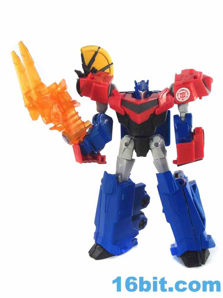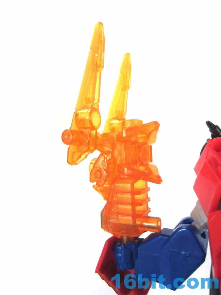 The clear orange plastic of Shou is gorgeous - it's really wonderful in person. I'd love to see it used for other weapons, be it a Mini-Con or an axe or some other fun accessory. I handed it to Transformers: Robots in Disguise Optimus Prime (warrior class) and it fits well - he comes with an orange axe, so the coloring fits nicely. The double-bladed weapon looks less like a weapon than the modes of Geki or Go or Sen, but it's nice. The visible Autobot symbol on the hilt looks great, and the two orange swords seem stabby enough to be threatening, if ridiculous. I'm quite fond of melee weapons for robots, mostly because it seems sort of ridiculous in an era of railguns and lasers. It's also not immediately obvious that this is a cybernetic toy mantis.