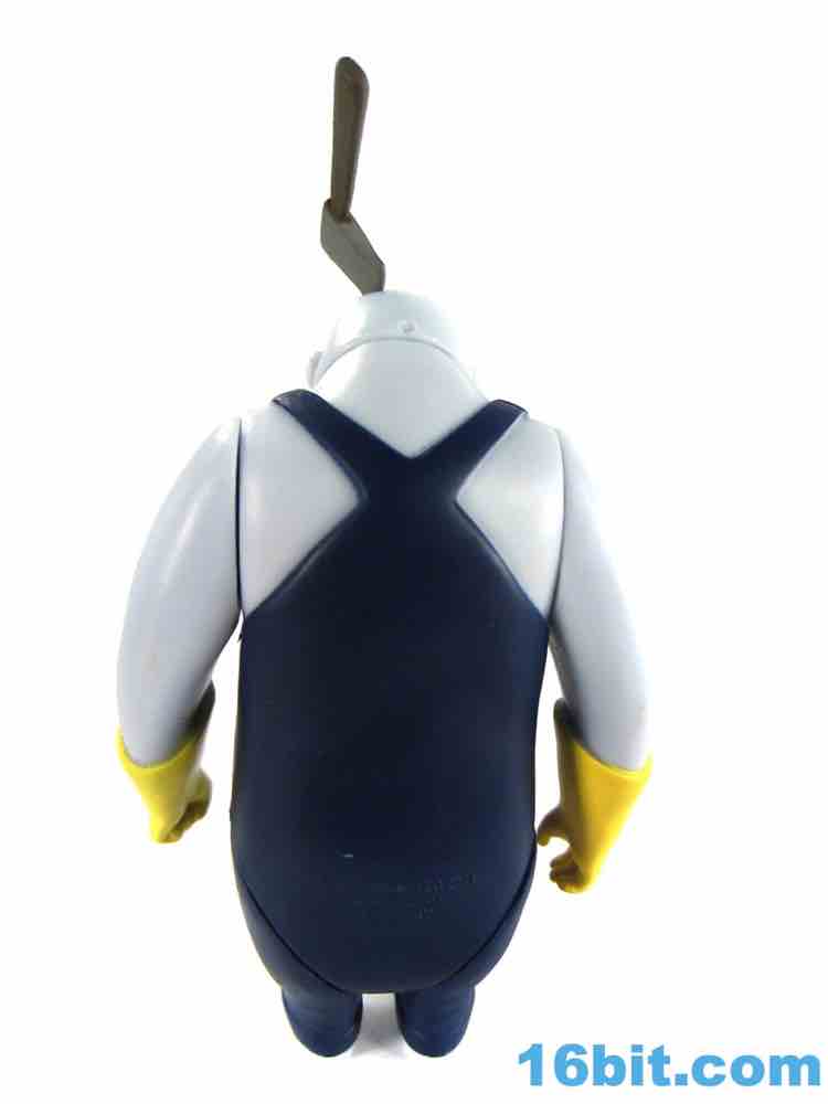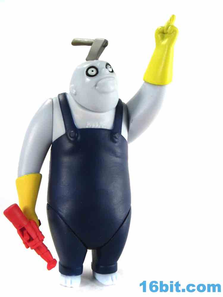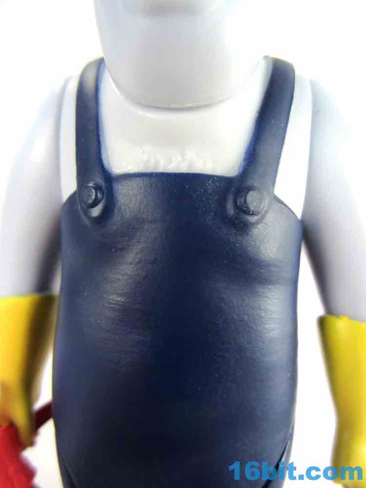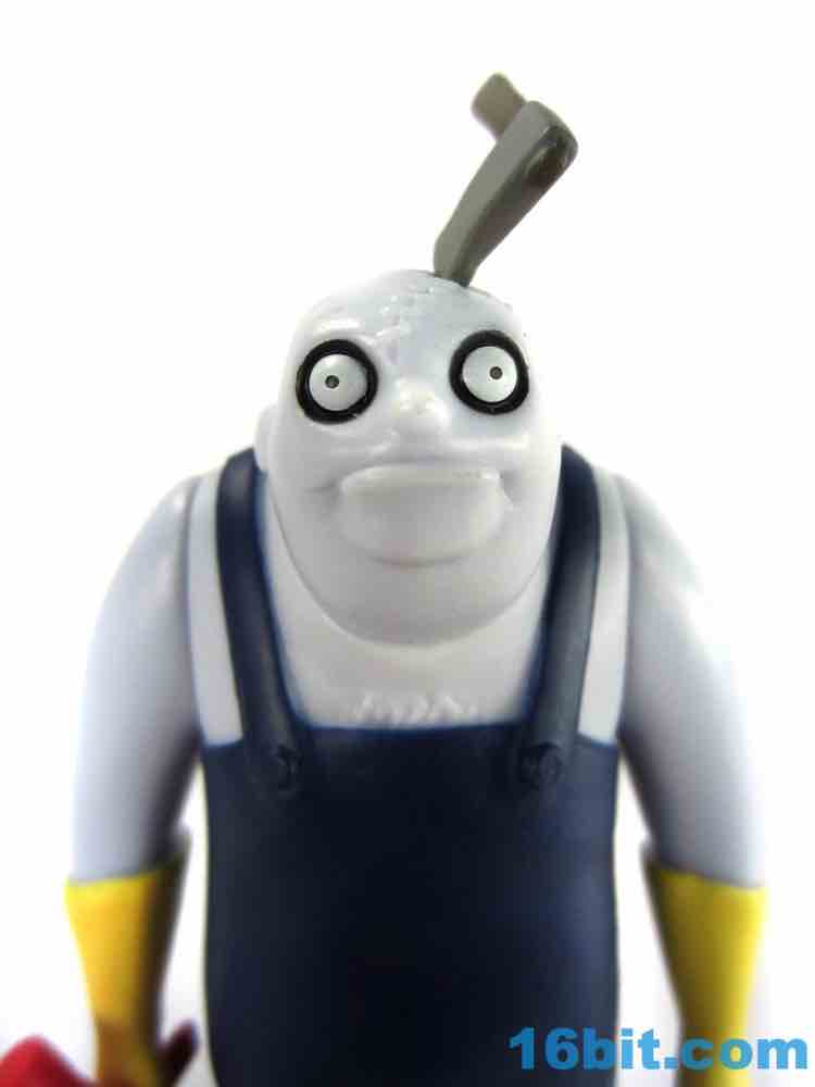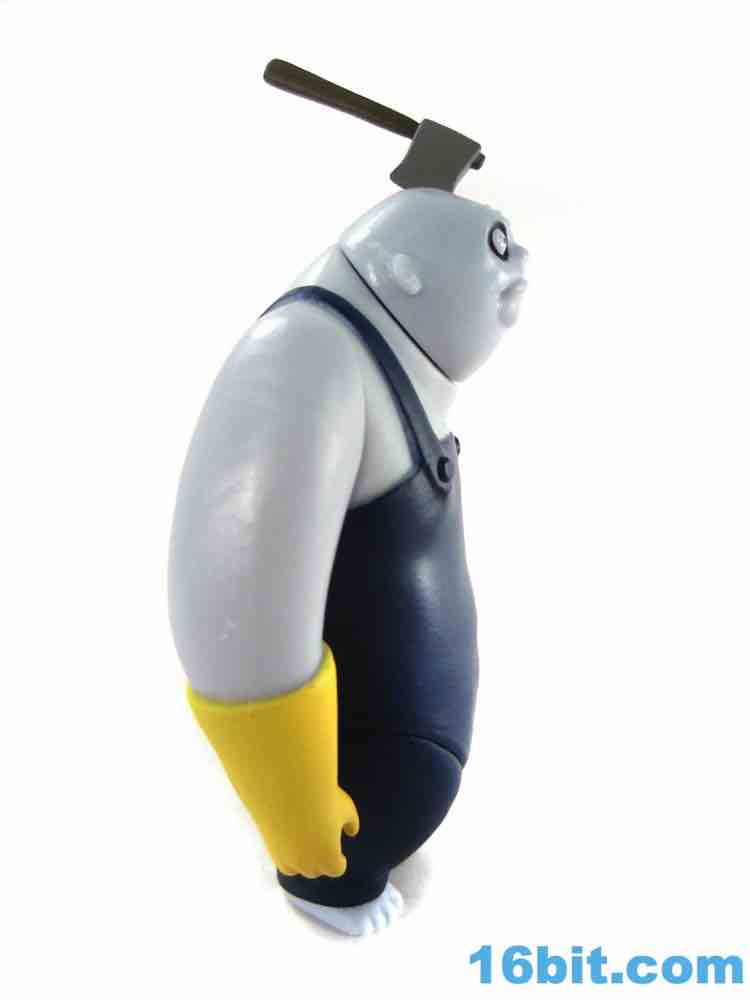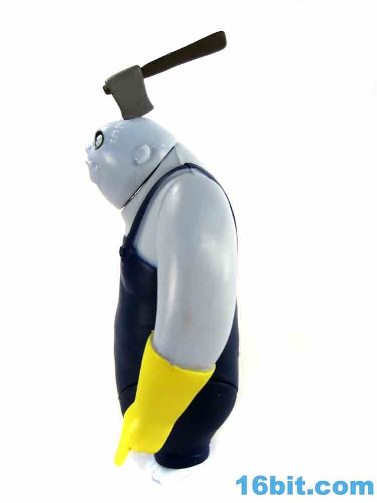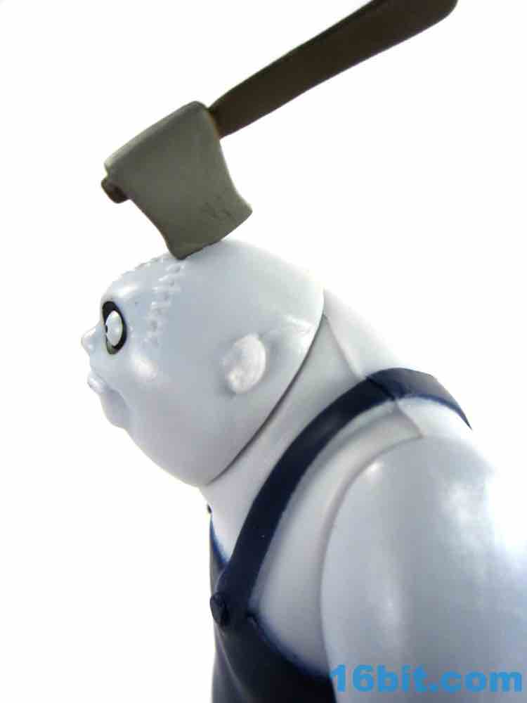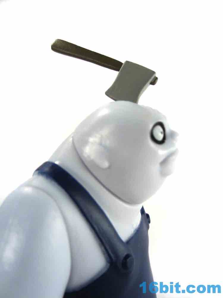 The 3 1/2-inch figure has a non-articulated hatchet in his head. It's flexible and I assume may not react well to storage in a box with other toys - so be careful with it, or just display it on your desk. It has a painted head, and a brown handle. It's nice. It's worth noting that the figure's deco as a whole really clicks - shiny blue skin, painted overalls, and for some reason yellow cleaning gloves all work together nicely. He has the Burton-esque black rings around giant white eyes, and while his mouth is unpainted I doubt more paint would add to the oldness of the authenticity. As it is, it's pretty convincing - they even sculpted some hair on his chest. It's a great little figure.