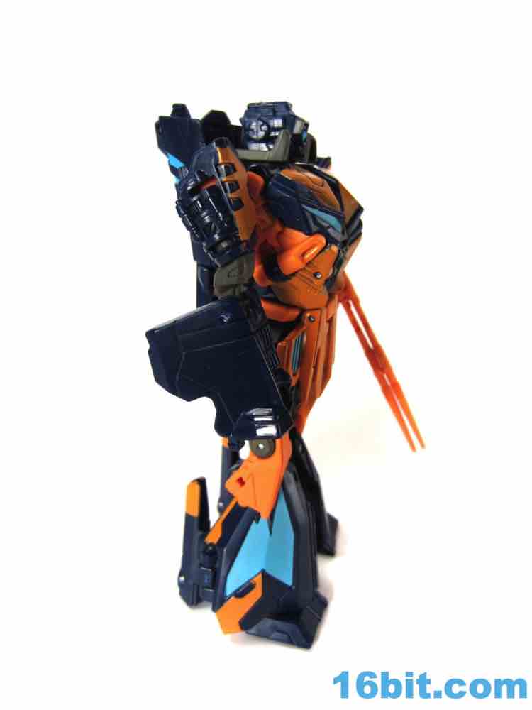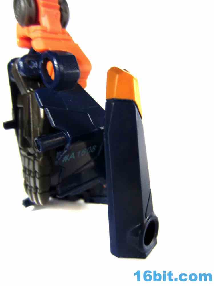The robot mode is great - added deco makes the light blue pop nicely and the orange is bright and mostly evenly applied. Hands are the standard issue 5mm holes, and not the claws for which Whirl is generally famous. I'm OK with this because a) different continuity, and b) he can hold his gear. The detailing pops differently when a dark blue plastic is slathered in bright orange, mostly because the shadows and grooves don't get complete paint coverage and contrast much more nicely with the fully painted elements. With the lack of the clear light-up eye port on the head, the blue paint gives the face a much brighter disposition than many of his peers - you can actually see his "face." The character looks like an armored-up, alternate-deco version of the familiar character so I like it - but I'd be lying if I said I needed another take on this mold. In the USA alone were a brown version for Comic-Con and a Platinum set, a blue G2 edition, and a red retail version as Vortex. Whirl here is #4, and there was a metallic paint job of Vortex as #5 in Japan.
