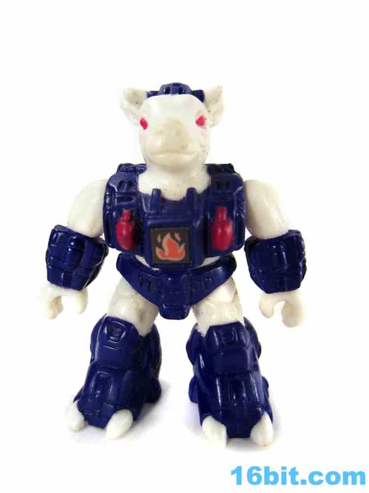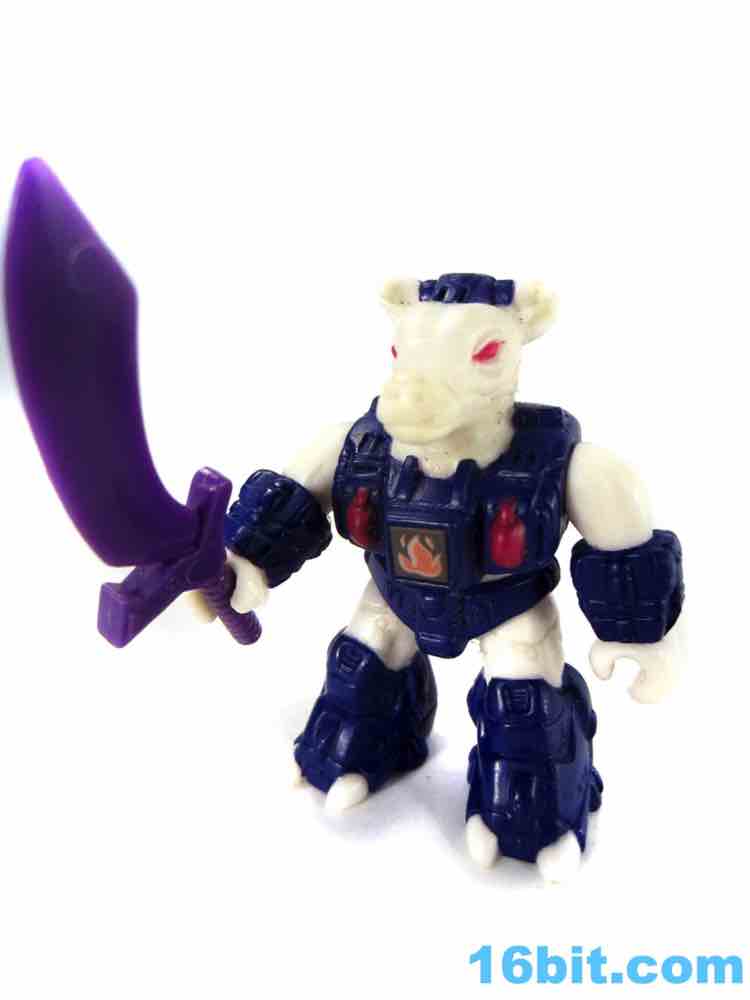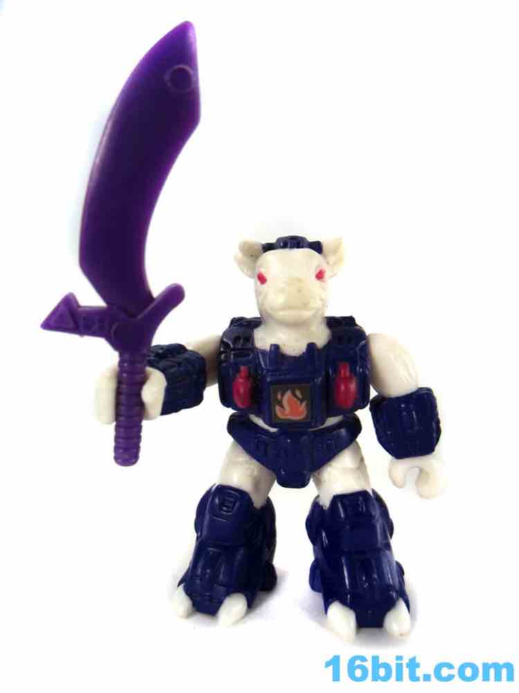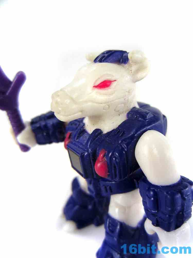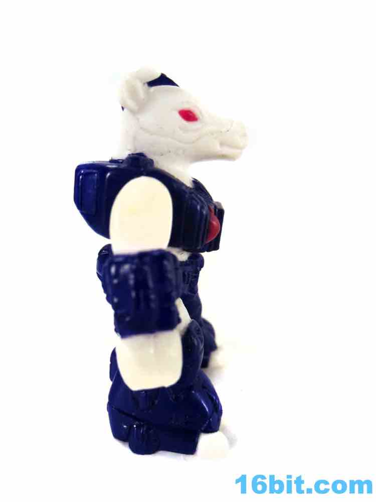 Molded in white plastic, this one doesn't have as much paint as you might hope. Sure, it has red eyes and blue armor, but no black or brown spots. You'll notice grooves in its skin indicating where those kinds of markings could go, but the toy budgets of the late 1980s gave us wonderful things like toy lines with very few repaints. Small figures with low articulation were popular, so that's what we have here - an albino bovine created deftly enough for general heifer-interested junkies. Sure, the horns are unpainted and white, but this line had a green rabbit in the first wave and if you can deal with that, you can deal with the weird claw-like hooves and awesomely robotic armor. The quasi-Transformers aesthetic is just gorgeous, with that perfect feel that's hard to put into words.