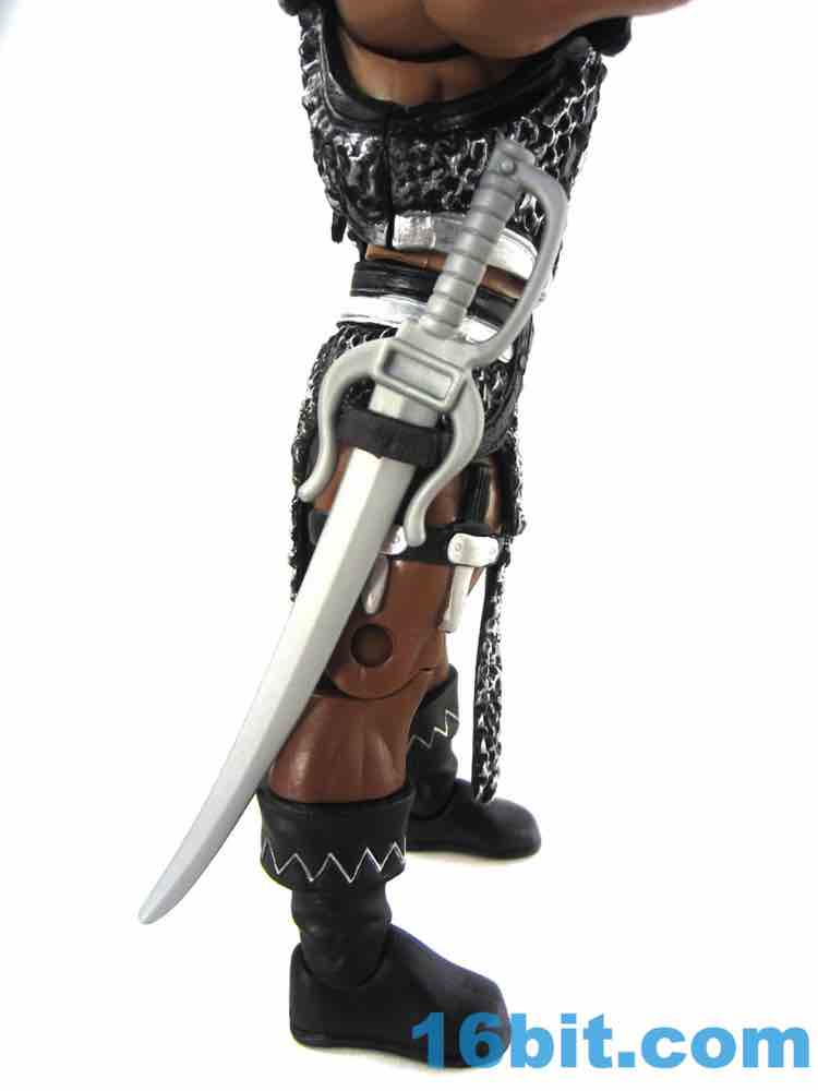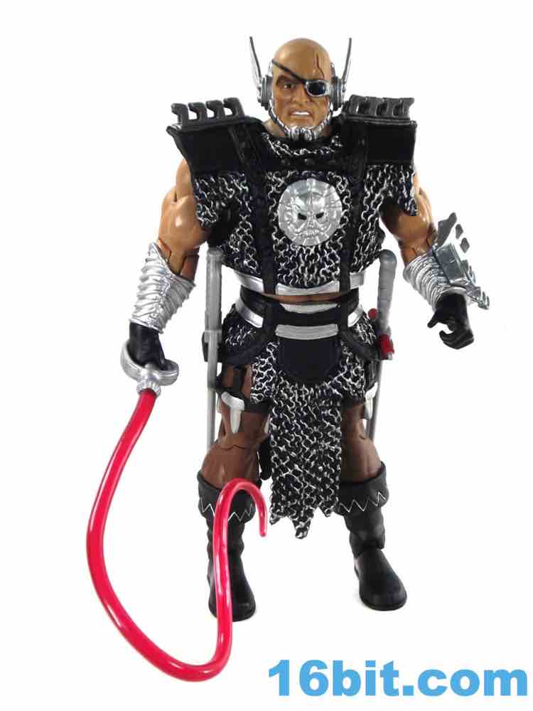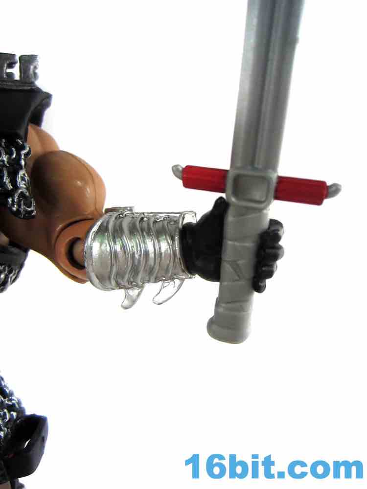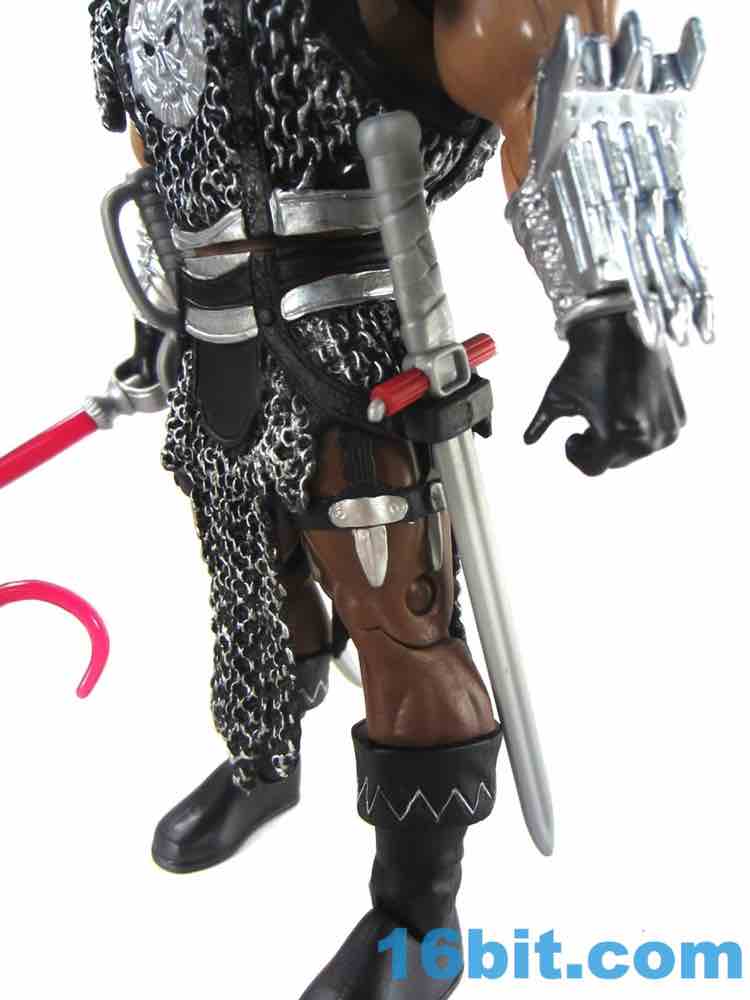 The standard buck is back with some nice enhancements, particular on the boots and vambraces. The chain mail body outfit is really nice - the chains are painted silver, but are molded in black plastic to give them some decent depth. There's a silver face on the armor, plus his head gear looks a lot like the movie - heck, the scar is much more exaggerated on the toy. Like Jitsu, it's a nice figure where you can see a lot of the work going in to all the blades on his shoulders, his "ears," and the two giant swords which slide in slots on his belt. Clearly, this is a man who likes his blades. And, for some reason, a whip. It doesn't quite fit in with the naming convention, but whatever, it looks cool and fits in his hand with a bit of a fight. It even has a thumb guard! The swords are a tight fit in his hands, but they fit in his belt loops like a glove. Mattel and the Four Horsemen put a lot of effort in making this one look great, and for reasons I may never fully appreciate.
