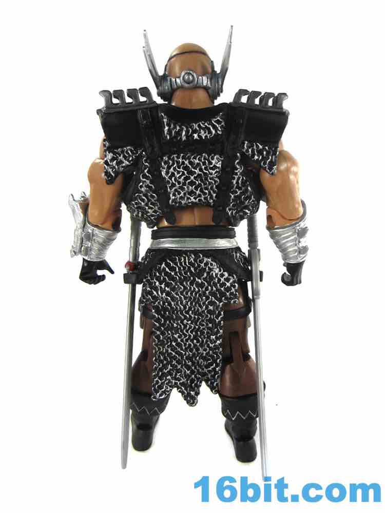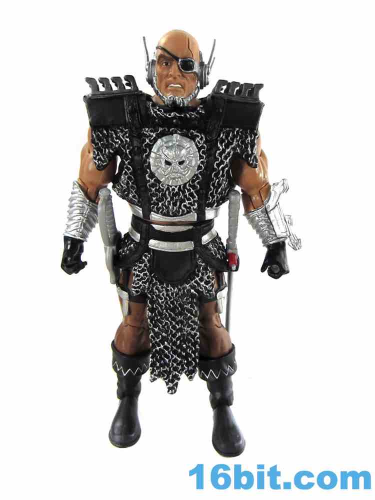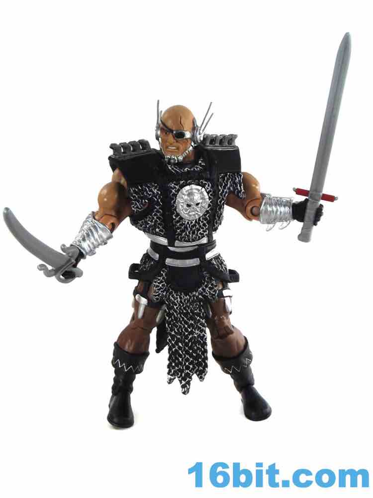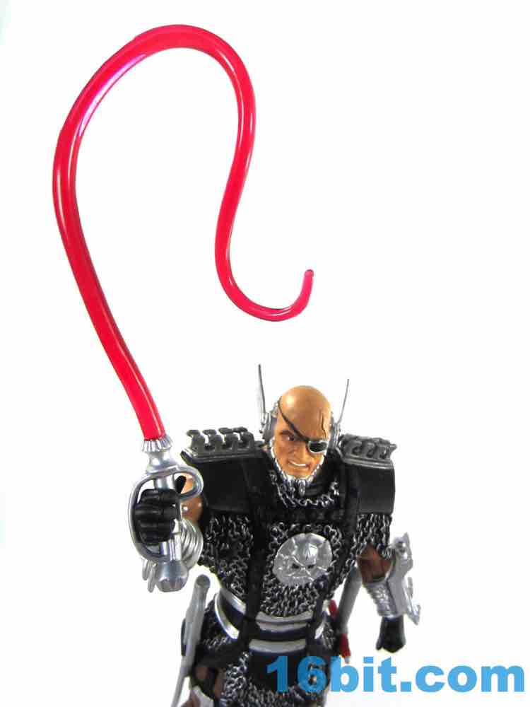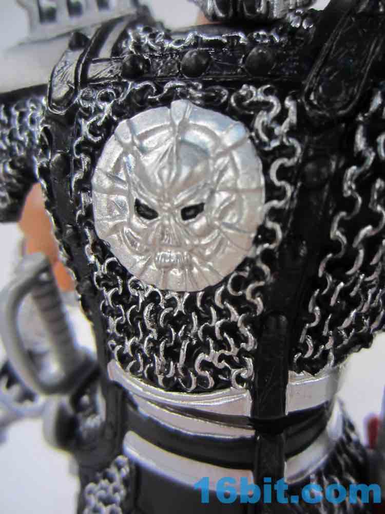 The standard buck is back with some nice enhancements, particular on the boots and vambraces. The chain mail body outfit is really nice - the chains are painted silver, but are molded in black plastic to give them some decent depth. There's a silver face on the armor, plus his head gear looks a lot like the movie - heck, the scar is much more exaggerated on the toy. Like Jitsu, it's a nice figure where you can see a lot of the work going in to all the blades on his shoulders, his "ears," and the two giant swords which slide in slots on his belt. Clearly, this is a man who likes his blades. And, for some reason, a whip. It doesn't quite fit in with the naming convention, but whatever, it looks cool and fits in his hand with a bit of a fight. It even has a thumb guard! The swords are a tight fit in his hands, but they fit in his belt loops like a glove. Mattel and the Four Horsemen put a lot of effort in making this one look great, and for reasons I may never fully appreciate.