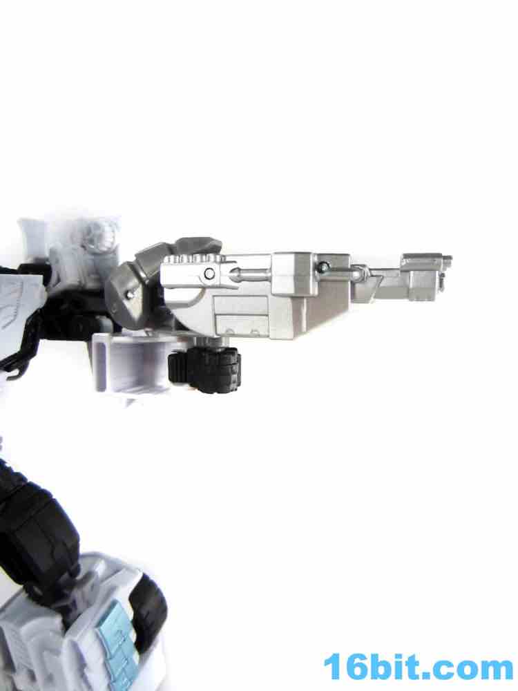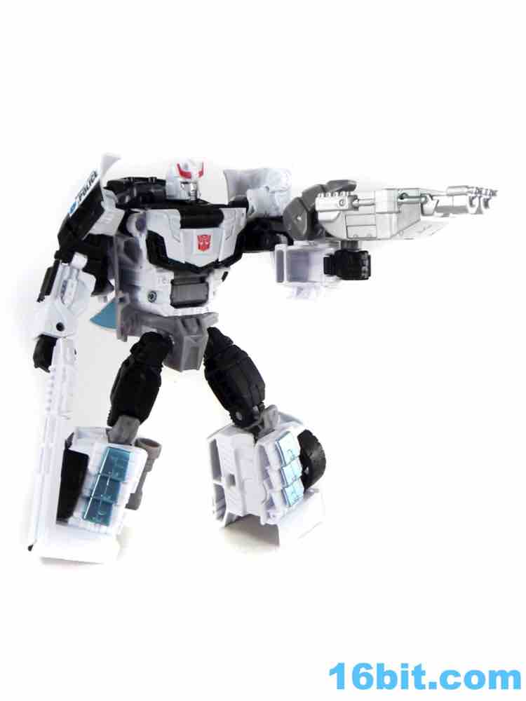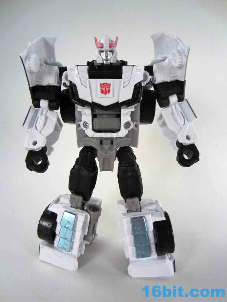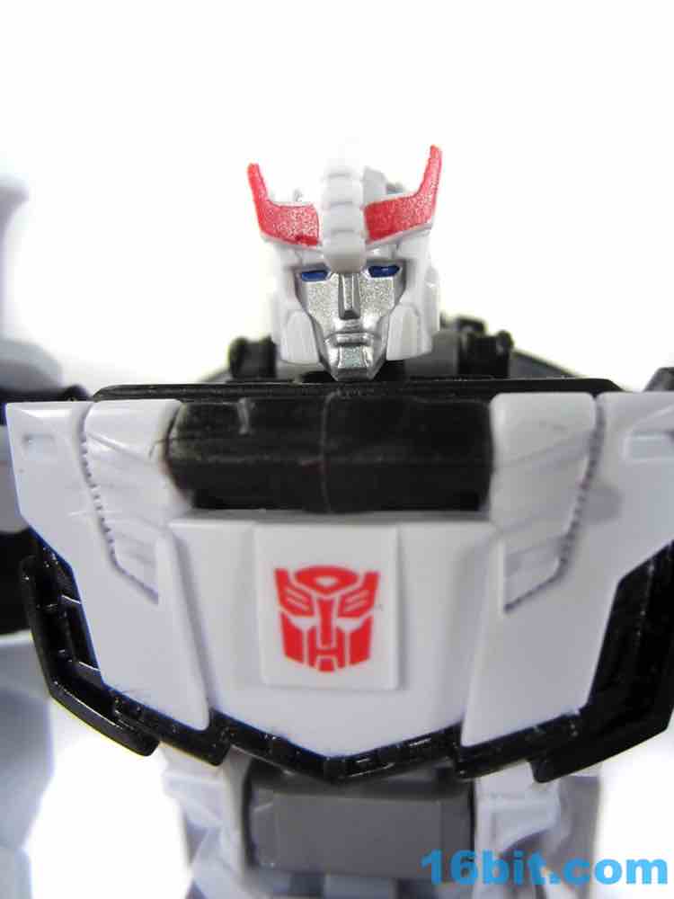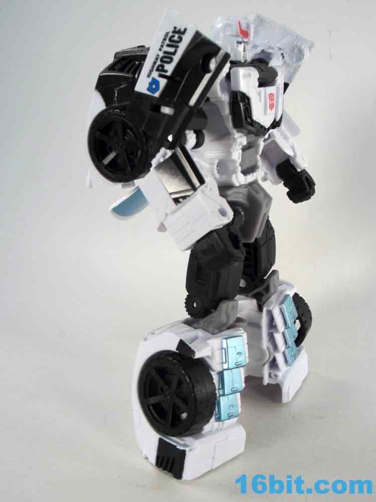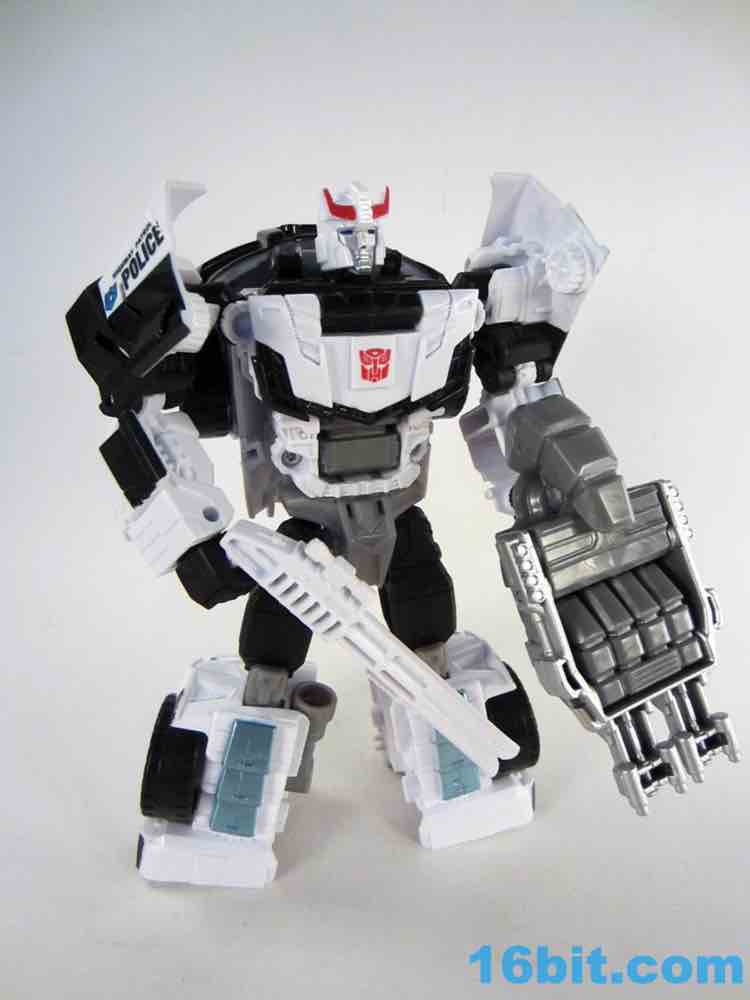The robot mode is Streetwise with a new head, who was himself a modified Dead End. Prowl's chest was obfuscated ever-so-slightly on Streetwise by painting it to not look like a hood of a car, but here it really pops nicely. It goes well with the black and white in Prowl-esque doses, but a police car robot is a police car robot to some extent. The "POLICE" graphics on his arms are visible, there's a nice Autobot symbol on his chest, and the crest on his head is painted in an unusual way with a white outline. It looks good - it's distinctive. He also looks a bit more menacing than the skinnier Prowl from Universe a few years ago.