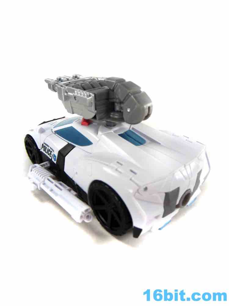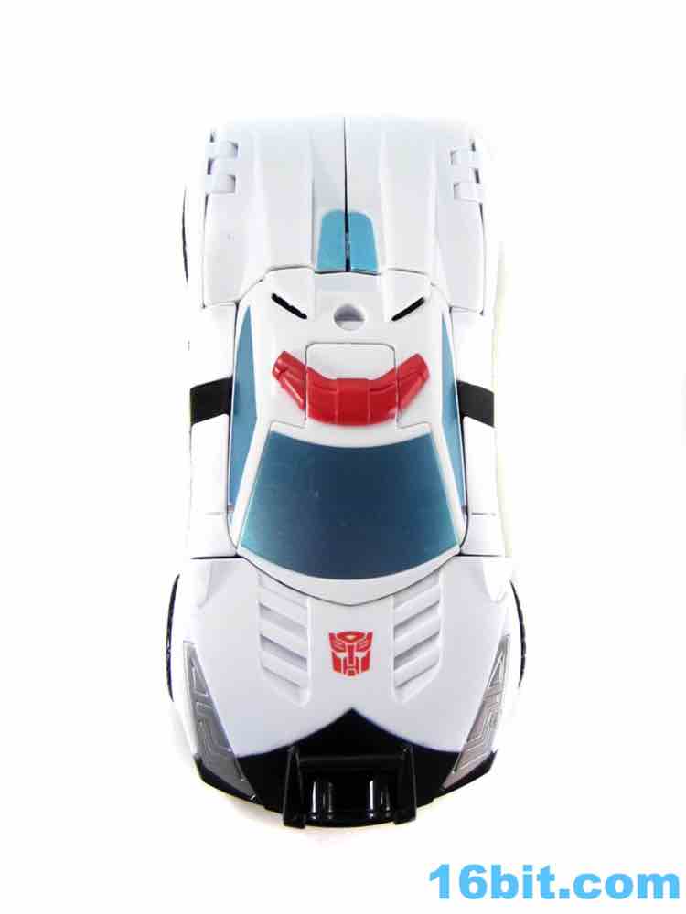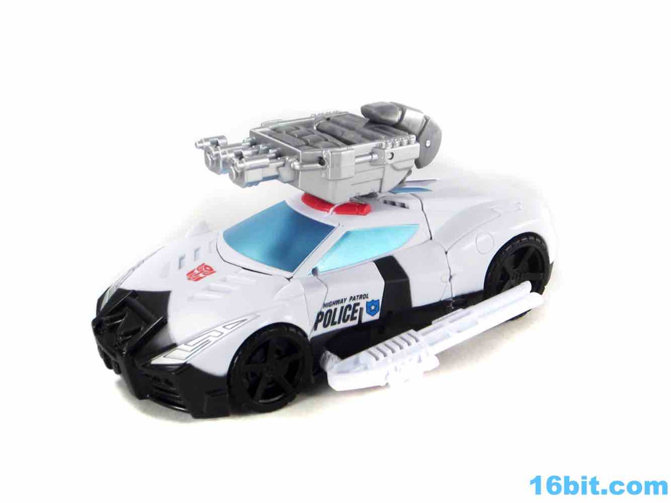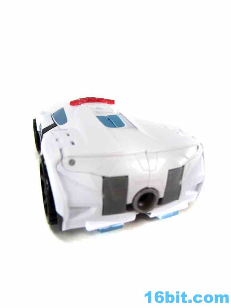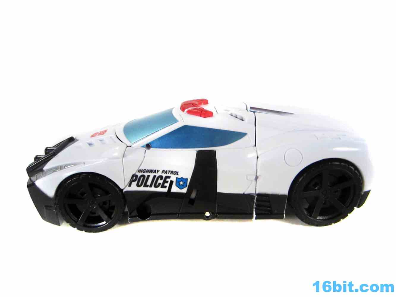This car looks a lot like Prowl - light bar, police markings, the works. Painted windows are a must due to the clear plastic not necessarily working for this kind of a toy, plus black unpainted wheels show that there's not too much money in the budget for detailing. Thankfully he does get "HIGHWAY PATROL POLICE" tampos as well as the obligatory Autobot marking on the hood of the car. It's sturdy, it's nice, it all fits together well.