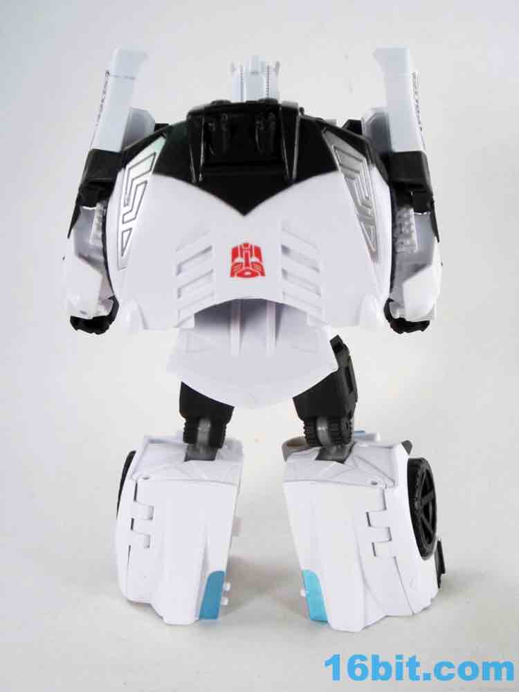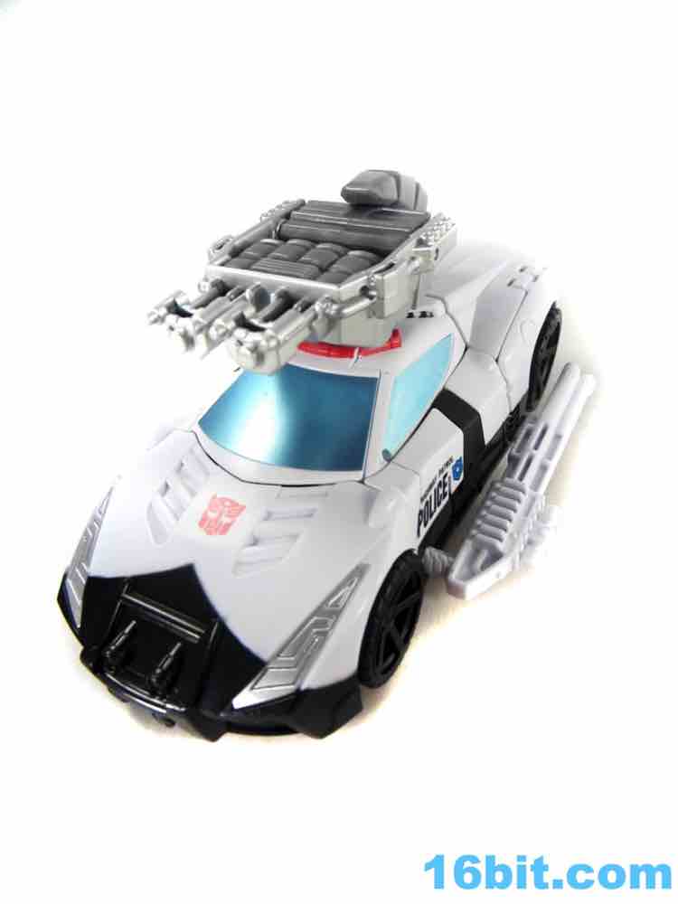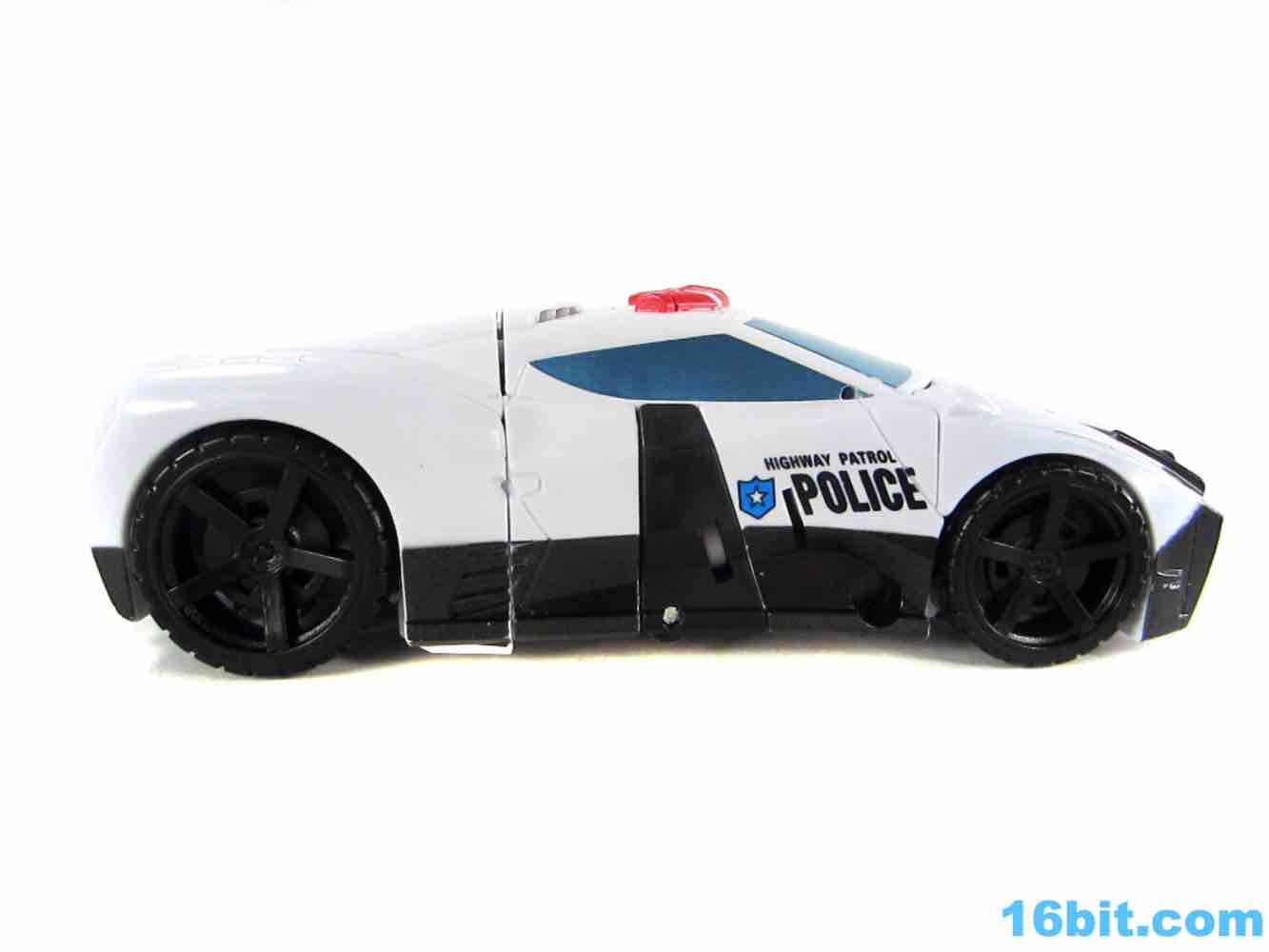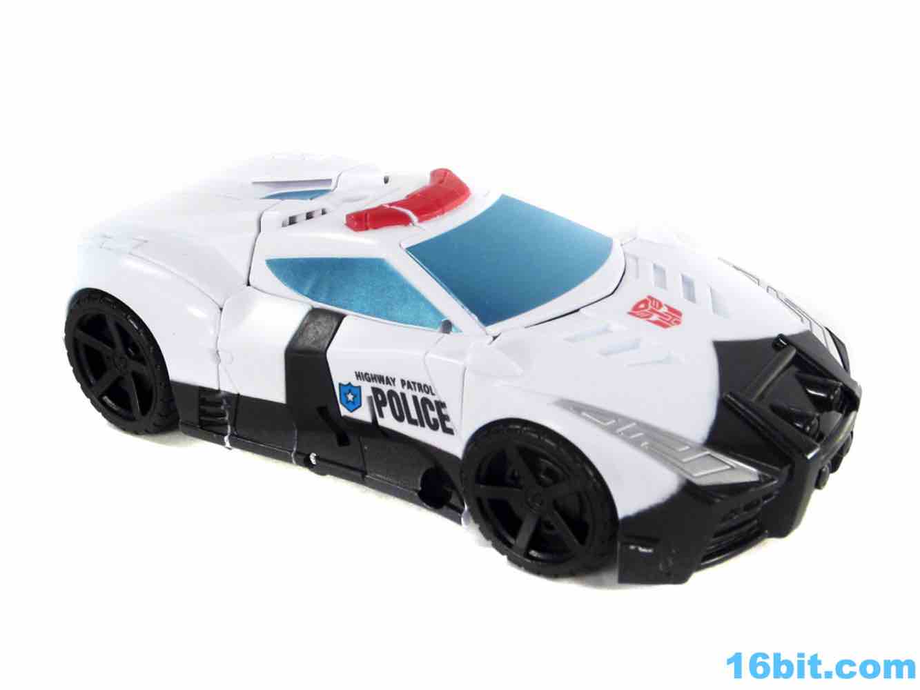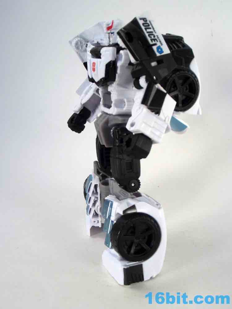 This car looks a lot like Prowl - light bar, police markings, the works. Painted windows are a must due to the clear plastic not necessarily working for this kind of a toy, plus black unpainted wheels show that there's not too much money in the budget for detailing. Thankfully he does get "HIGHWAY PATROL POLICE" tampos as well as the obligatory Autobot marking on the hood of the car. It's sturdy, it's nice, it all fits together well.