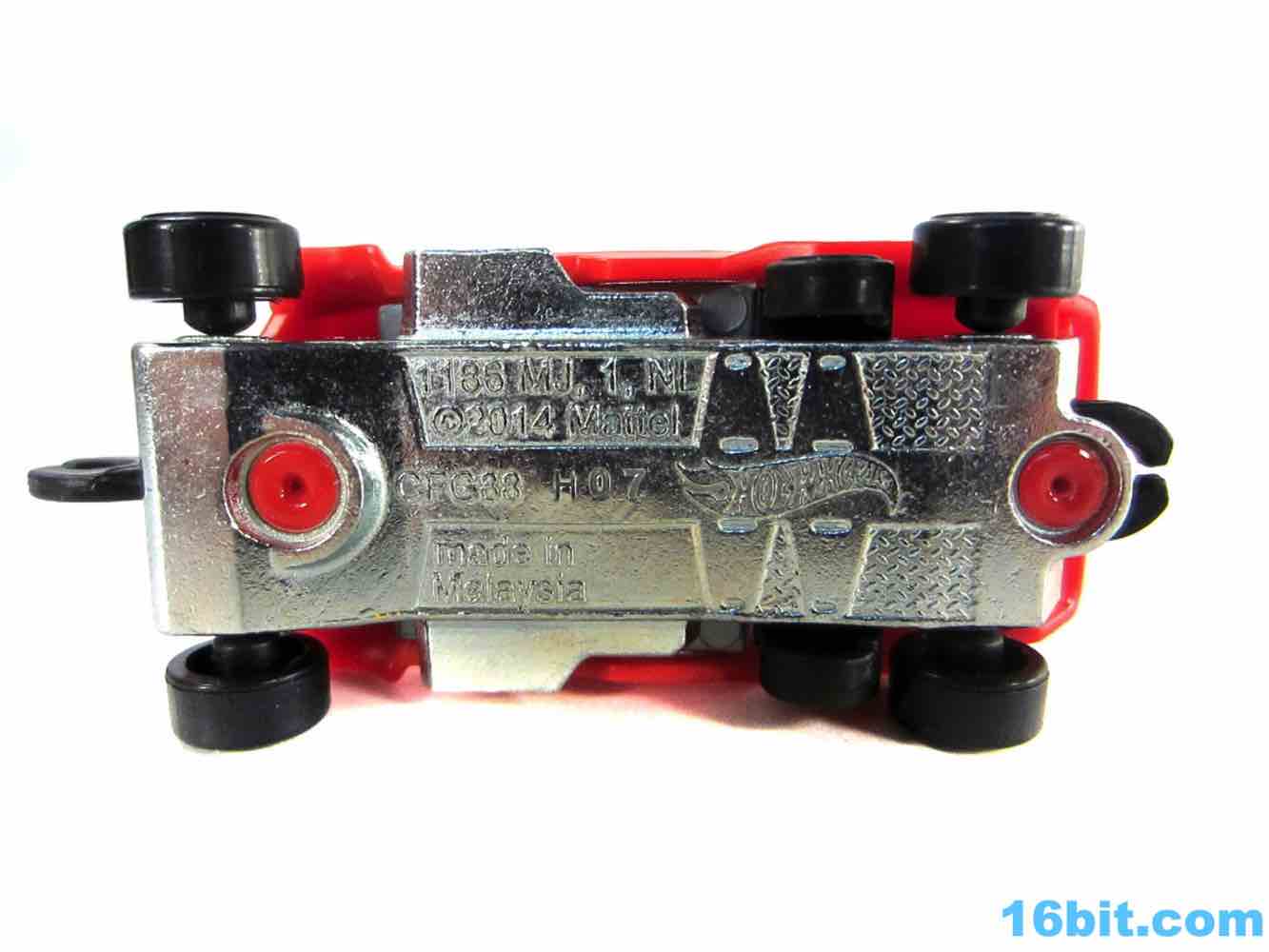 The helmeted figures are seated with safety harnesses over their chests, and on mine one figure has rubbery limbs extended to the sky. A "Loopster" logo is on the hood of the car, presumably because this is the name of the ride. The bottom of the toy is metal with a plastic top part, and if you love fake wheels then this toy is king. Two false wheels are behind the front tires, which are notable in that they're slightly smaller than a normal Hot Wheels car. What really made this toy stand out when I saw it in a store was the fact it had hooks to connect to other Loopsters, assuming you were to army-build these things and form a human centipede which is really neither.