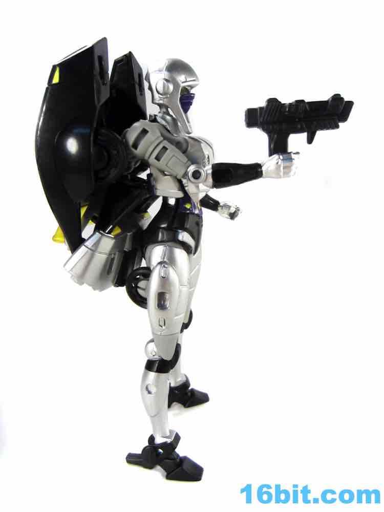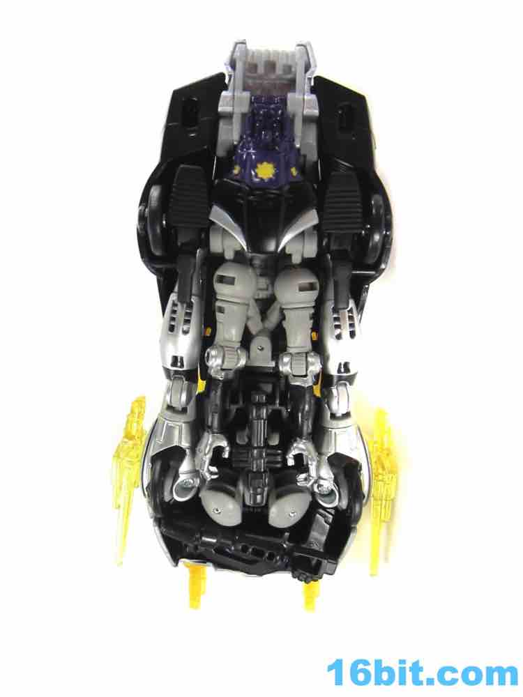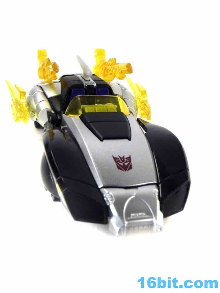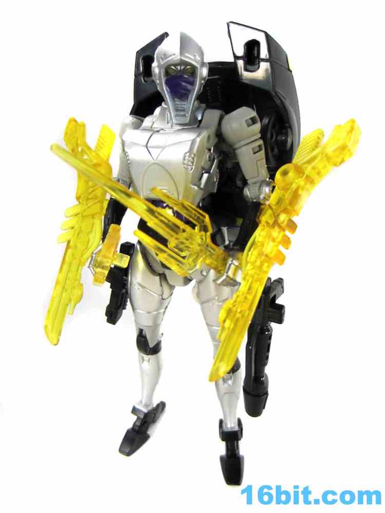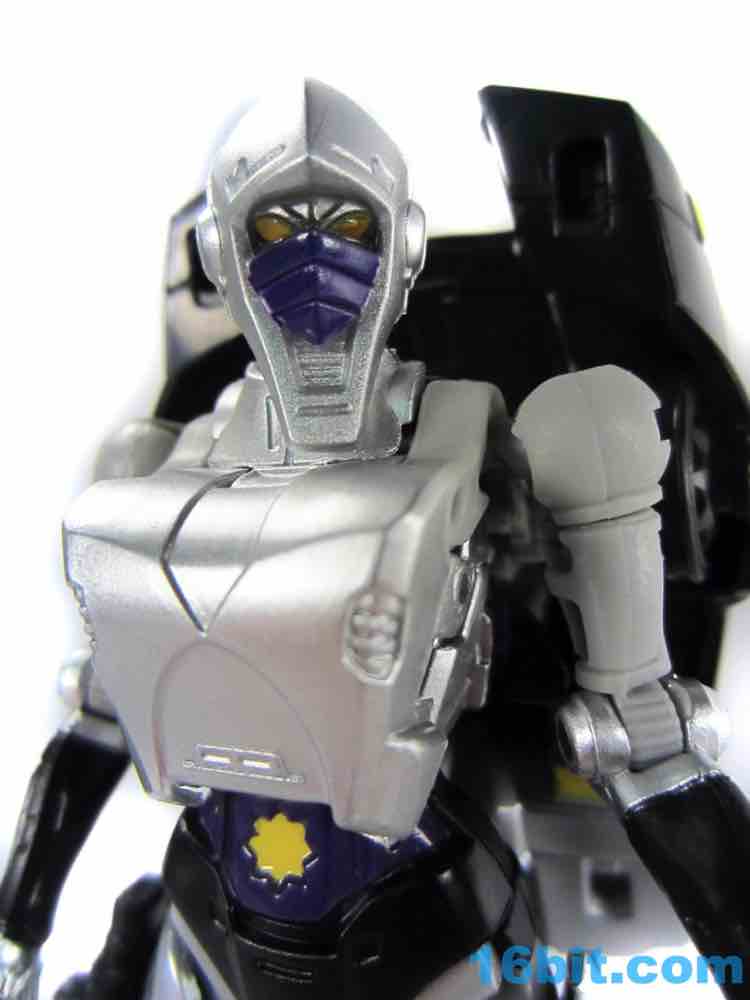 I cant read the pack-in comic, so I'll just say the car is a lot like Arcee. There's a Decepticon symbol on the hood - but none on the robot, more or less true to the cartoon - and you can plug in weapons all over the darned thing. There are just enough ports plus gun storage under the car, so I have to assume Nightbird may have been planned from the get-go. The wheels more or less turn acceptably, but as a futuristic car from 2005 it's not like this is a selling point. The detailed interior with dash console and steering wheel are pretty impressive. The black coloring looks great, and it's not like we have a lot of non-club/con Decepticon cars. Shadow Striker and Roulette come to mind... "movie" Override too.