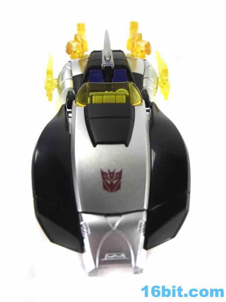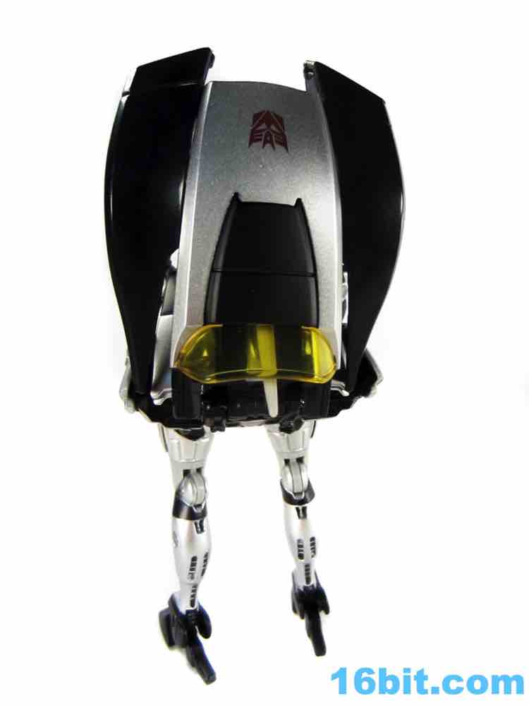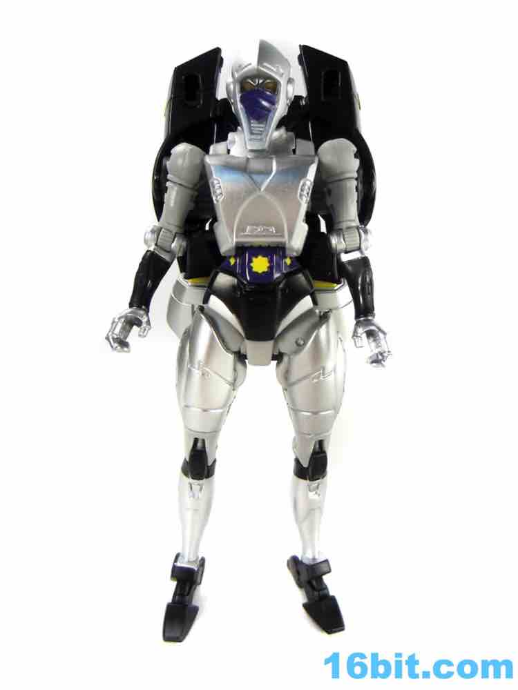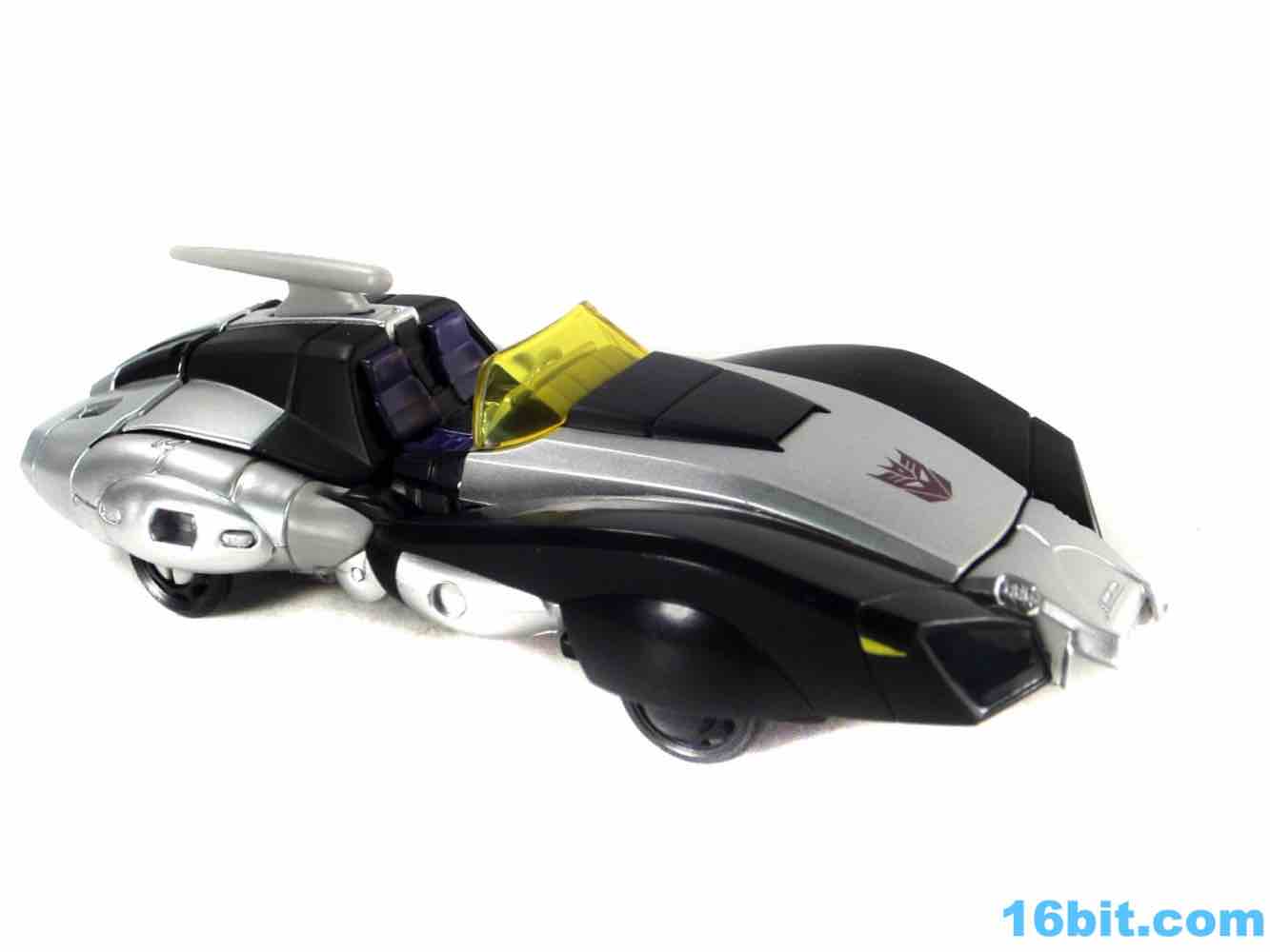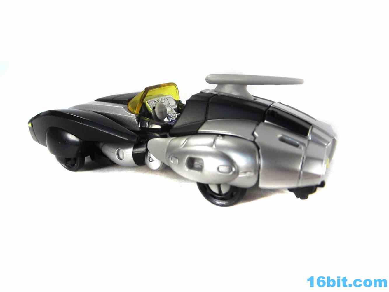 I cant read the pack-in comic, so I'll just say the car is a lot like Arcee. There's a Decepticon symbol on the hood - but none on the robot, more or less true to the cartoon - and you can plug in weapons all over the darned thing. There are just enough ports plus gun storage under the car, so I have to assume Nightbird may have been planned from the get-go. The wheels more or less turn acceptably, but as a futuristic car from 2005 it's not like this is a selling point. The detailed interior with dash console and steering wheel are pretty impressive. The black coloring looks great, and it's not like we have a lot of non-club/con Decepticon cars. Shadow Striker and Roulette come to mind... "movie" Override too.