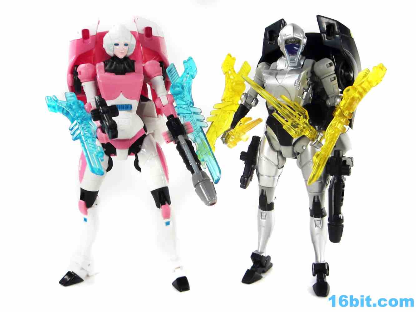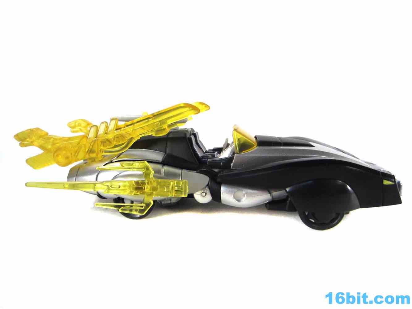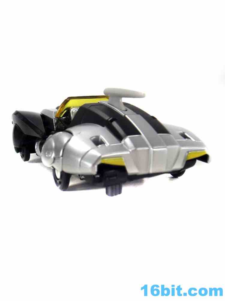 The car shell is largely black plastic with a grey or silver robot mode. Some body parts are grey plastic, while others have a perfect silver paint coat. She has little dabs of yellow on her belt and as lights on her car mode, with a wonderful new head sculpt that looks like it plopped right out of the cartoon. The clear yellow eyes are a bit of a downer - painted yellow would be brighter and give her more personality (see: Slipstream) but she ain't bad. The toymakers at Takara Tomy really did make a decent remold of Arcee... but it would be nice if they finished the job.