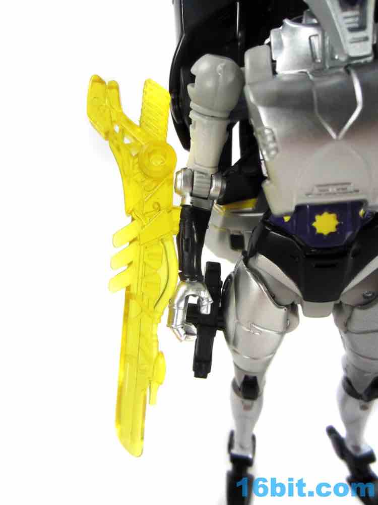 One of my biggest gripes about Arcee was that the regular US release of the toy had terrible hands. They skipped 5mm pegs in favor of a new "bar/slot" system with a weird barrier at the bottom of the hand preventing full insertion of the weapon. In other words, the swords and guns are awkward as all get out and may fall out of her hands. Hasbro fixed this for SDCC Arcee, and I don't understand why Takara didn't take advantage of that already-paid-for work. It's not just a little better, it's a lot better. You can still plug in Nightbird's weapons to her car mode, her thighs, and to a lesser extent the hands, but it's always maddening when something as simple as figure/accessory compatibility can't be fixed.