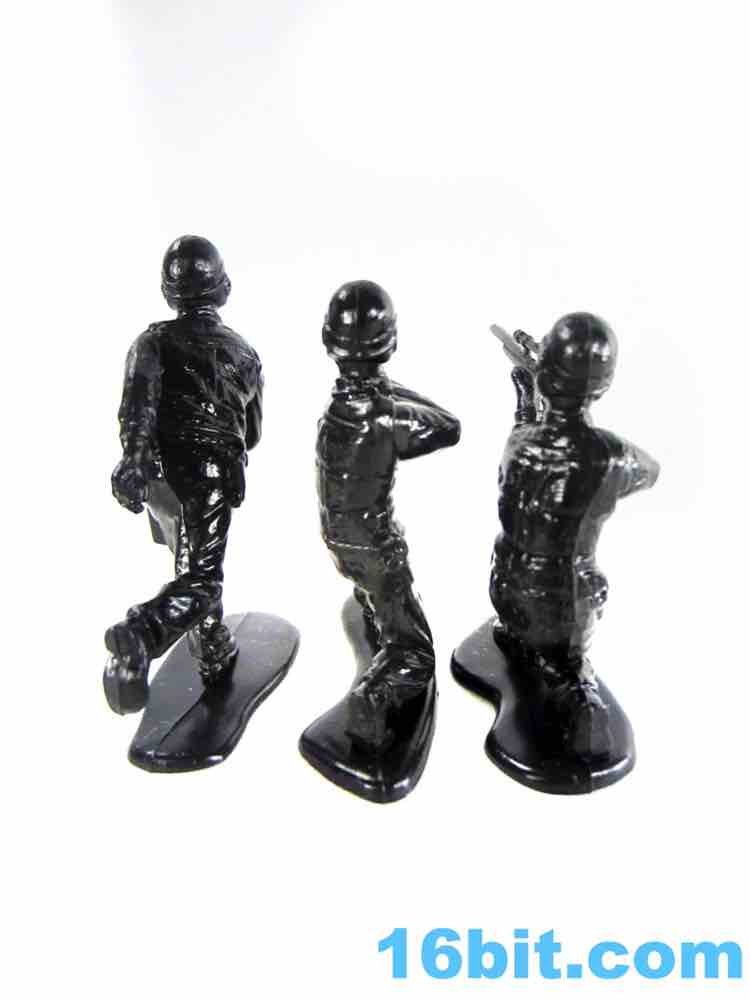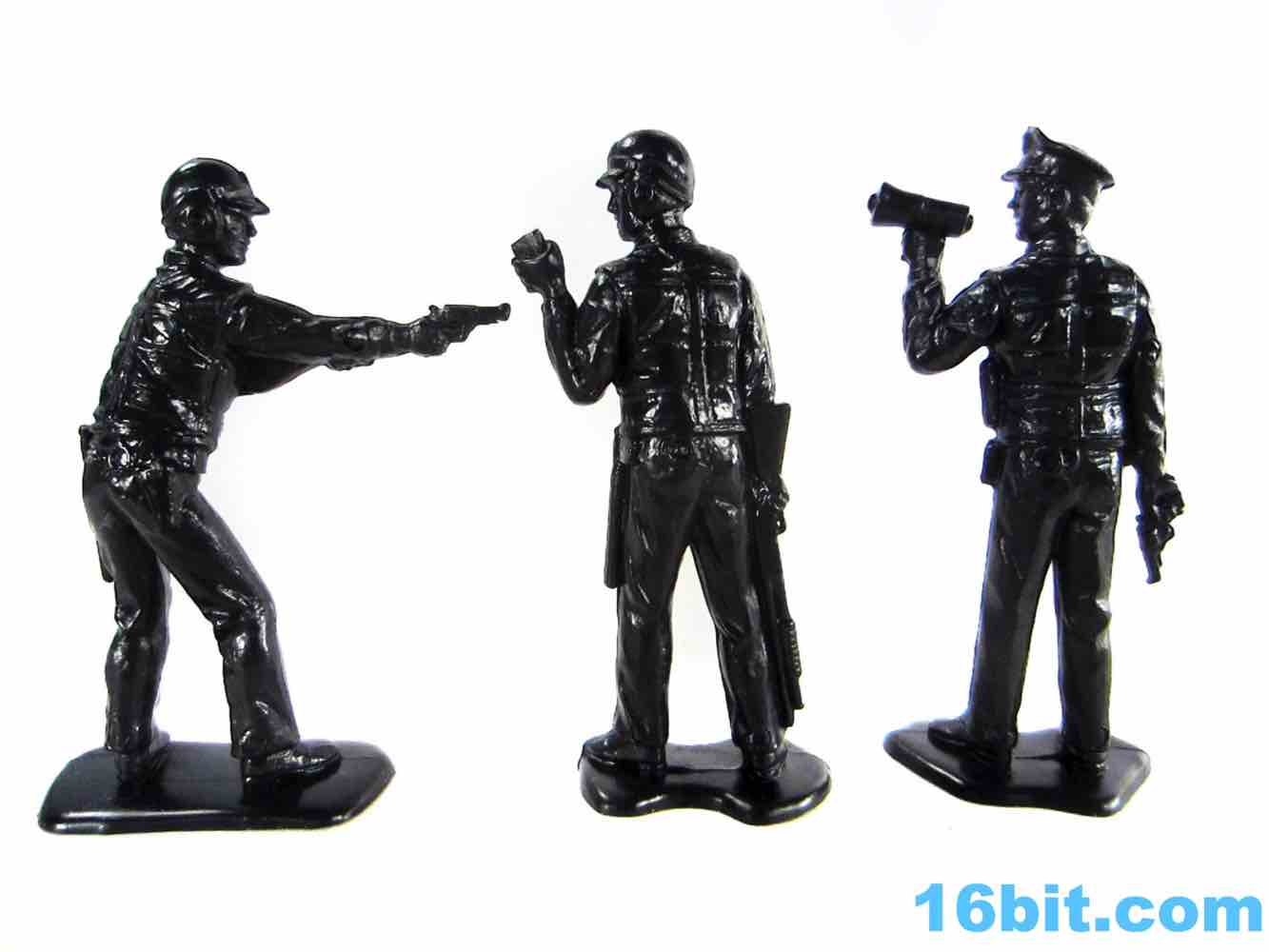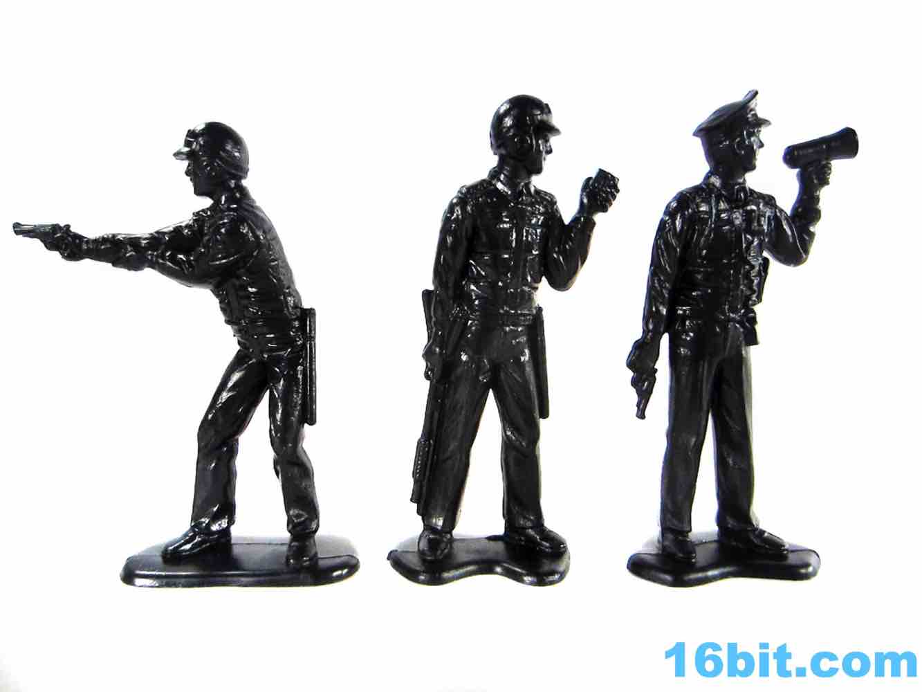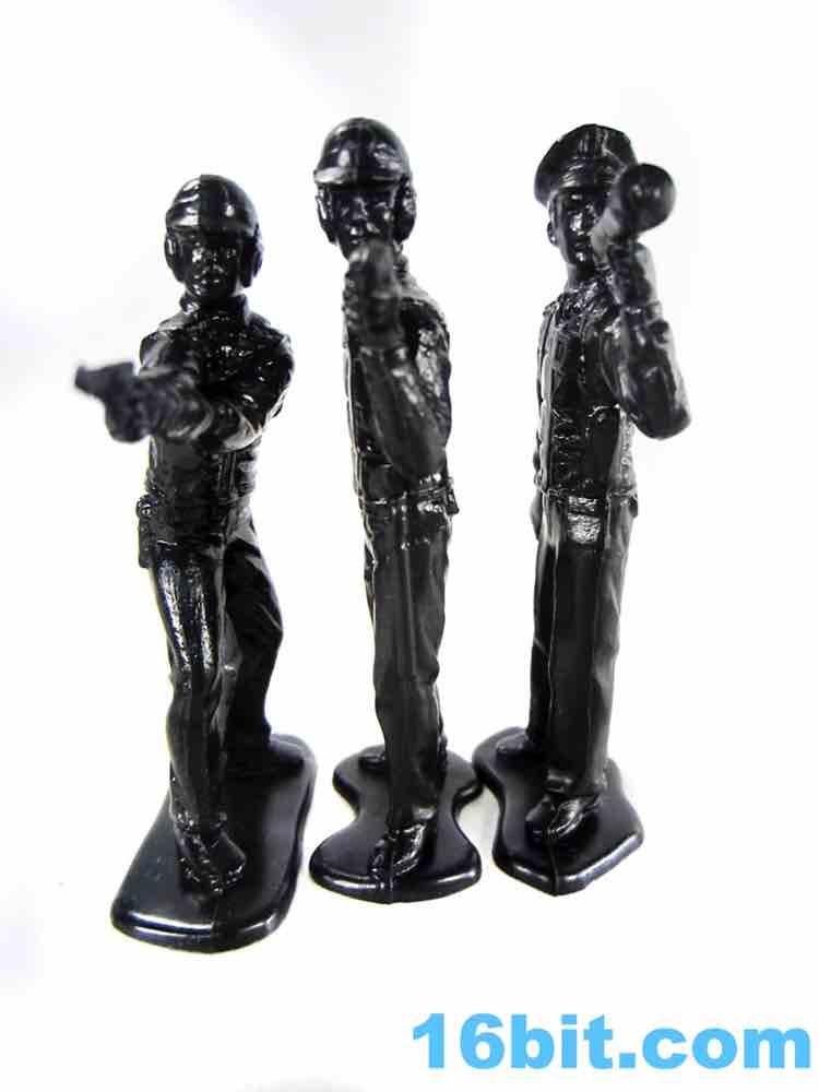 While they're all basically black plastic figures of white dudes, it's impossible to ignore the level of detail on each one. You'll find handcuffs and billy clubs attached to their belts, complete with outfits that have a little more weight and a lot more in the way of folds and wrinkles. For example. the two crouching figures have padded armor and rifles popping out of their holsters - they didn't skimp here. Another figure is running with his rifle, which I'm pretty sure is dangerous. Because the sculptors of 40 years ago were paying attention, his holster is empty.