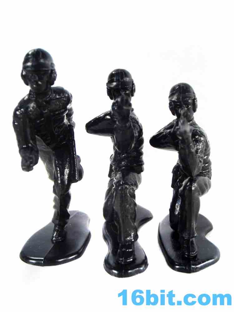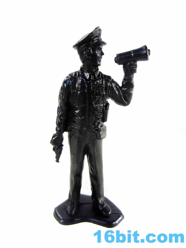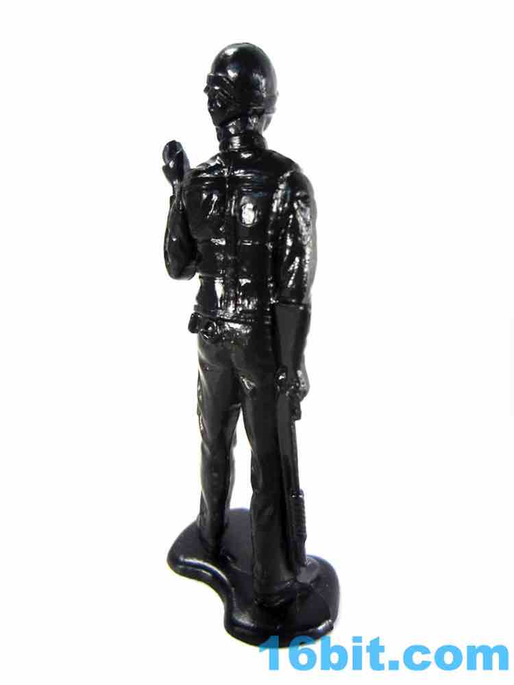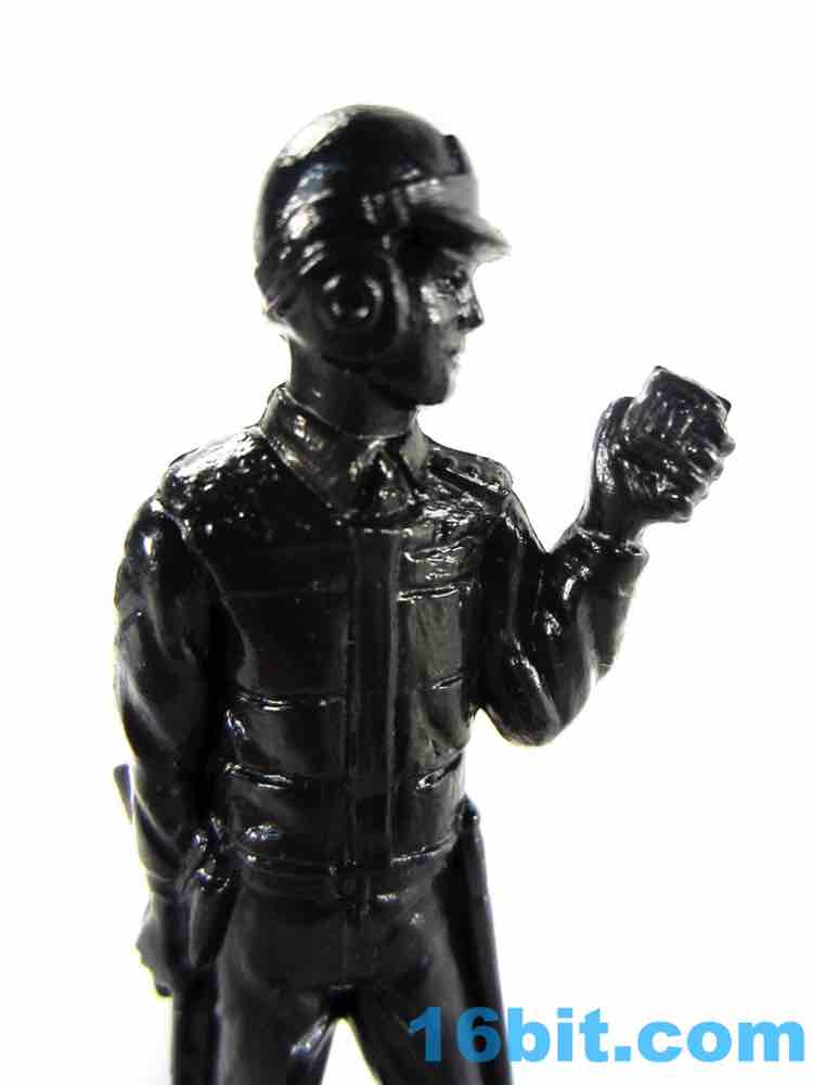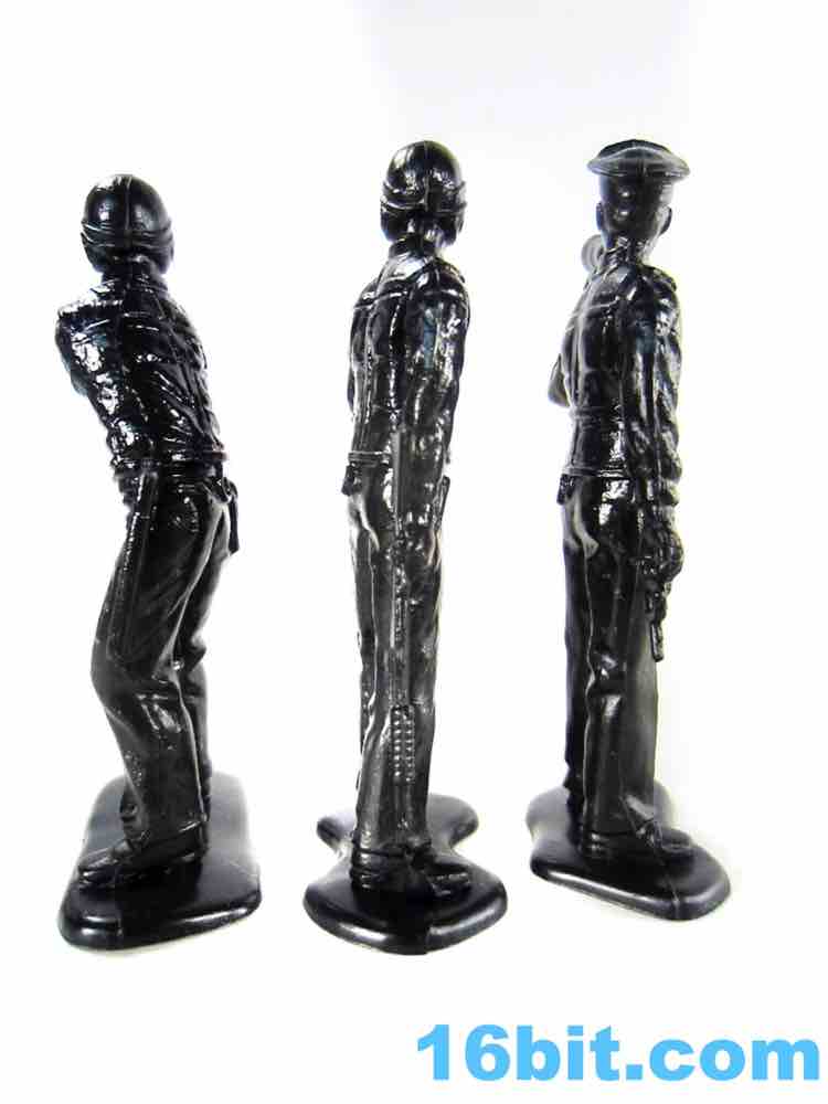 While they're all basically black plastic figures of white dudes, it's impossible to ignore the level of detail on each one. You'll find handcuffs and billy clubs attached to their belts, complete with outfits that have a little more weight and a lot more in the way of folds and wrinkles. For example. the two crouching figures have padded armor and rifles popping out of their holsters - they didn't skimp here. Another figure is running with his rifle, which I'm pretty sure is dangerous. Because the sculptors of 40 years ago were paying attention, his holster is empty.
