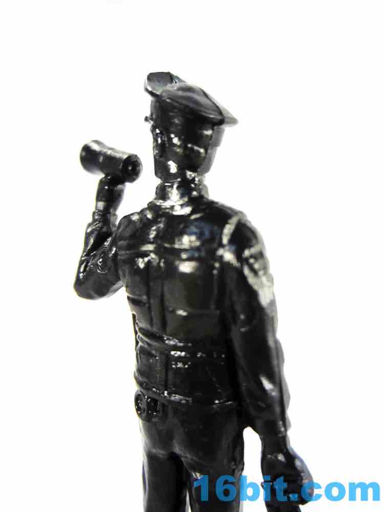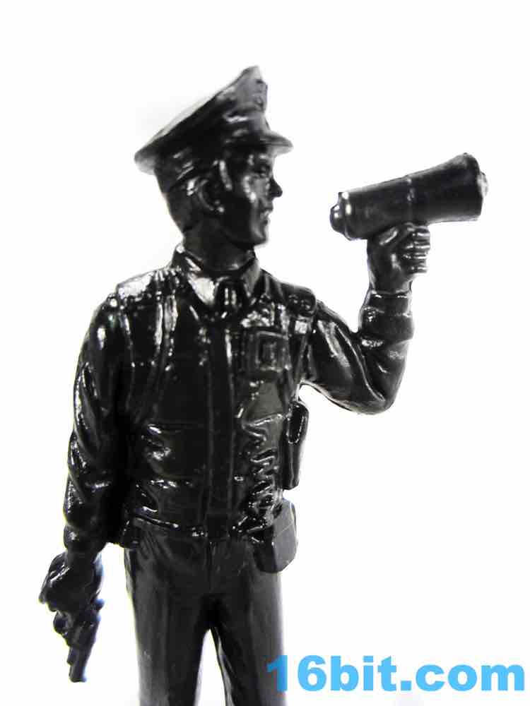 The other three figures continue with the same level of detail - you'll see ear protection and taller poses. One figure carries a walkie-talkie, while another is shouting through a bullhorn - with a walkie-talkie attached firmly to his vest. They're joined by a man with a pistol drawn, whose face reminds me a lot of the security robots of THX-1138. There's a certain stylized facial expression that just plain works for these guys - they're not so clearly defined that you can point to them all necessarily being in a specific mood, but they look like they're going to shoot you or club you. Or both! I think they have a license to do that thanks to their giant helicopters.