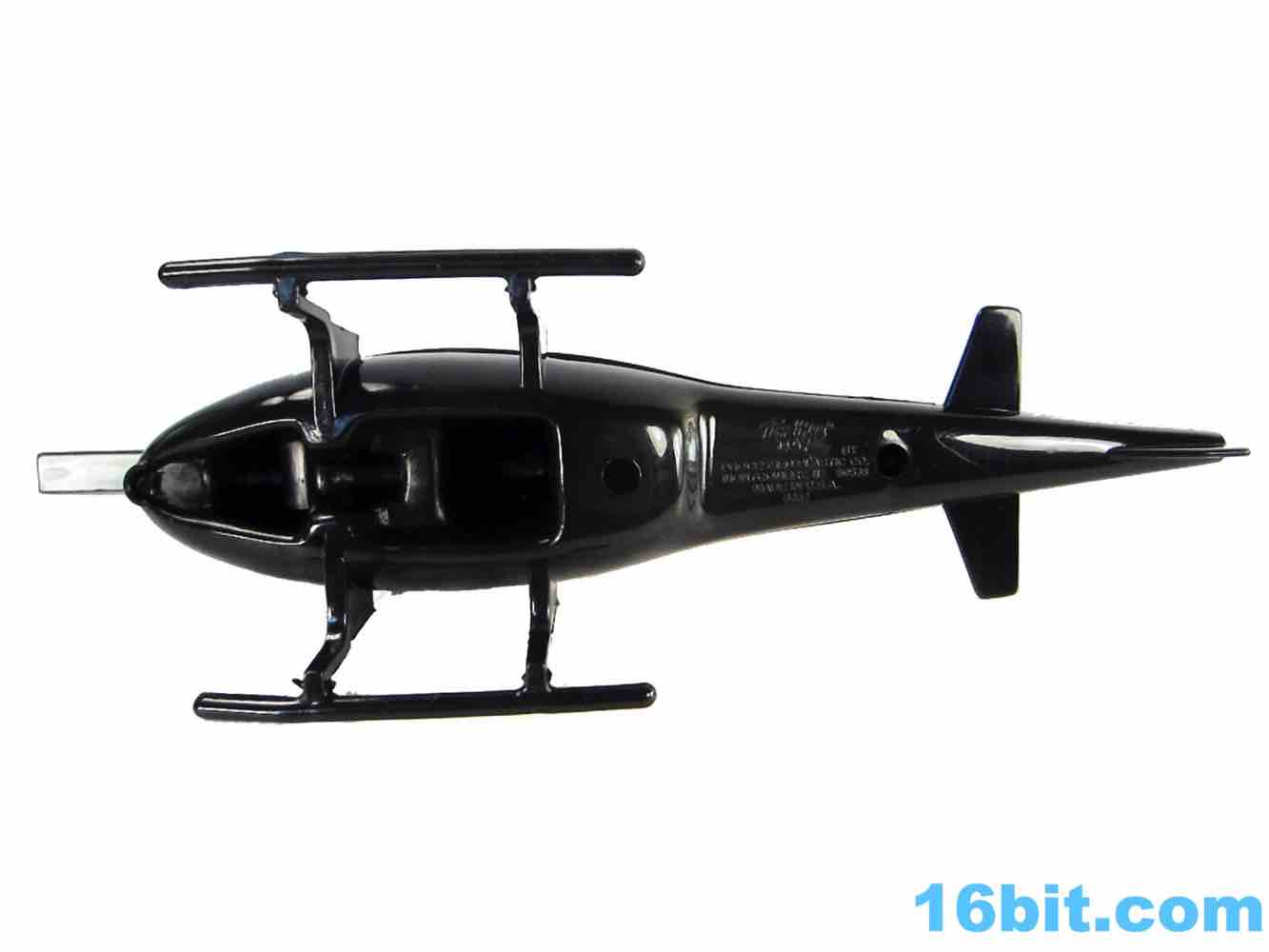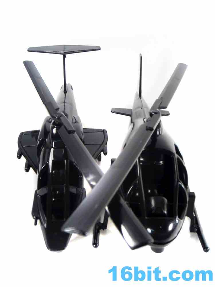 The helicopters are big - not huge, but big for Tim Mee wares. According to my meager research, the molds originally came out in the 1990s but this is their debut in black plastic. The longer one is close to 9-inches, while the other is just over 8-inches long. They're light, airy, and won't hurt too much when your kids throw them at your head. While merely black plastic without paint, they're eerily gorgeous - the black plastic finish is reflective and shiny, making me wonder what a vac metal finish might look like on these things.