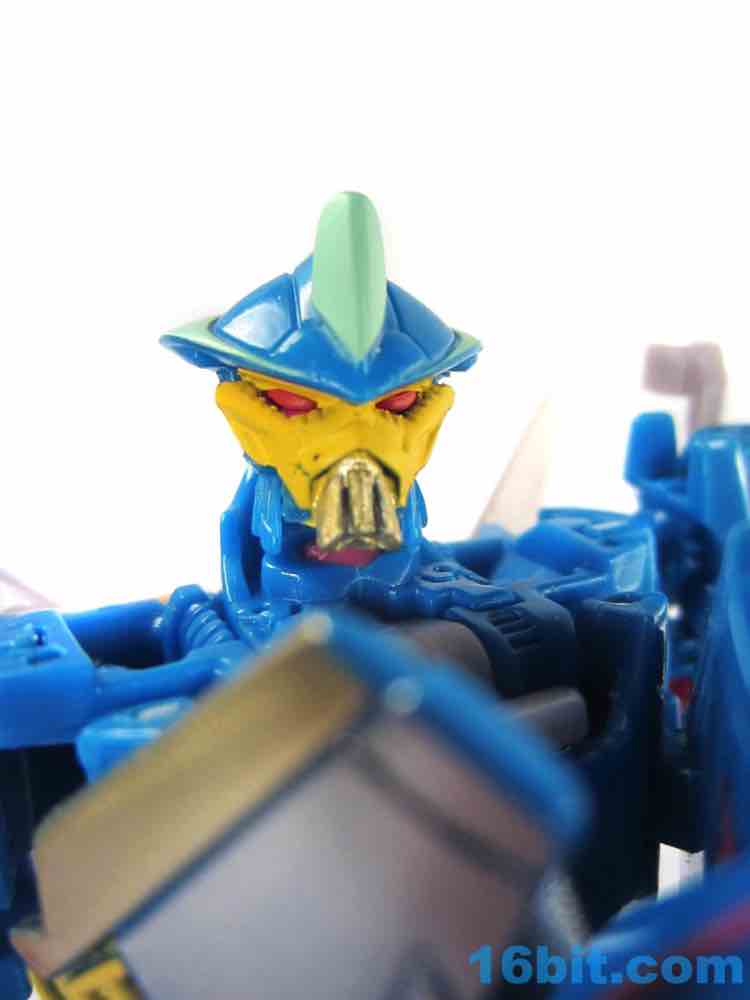 The robot mode of Terradive had a head that looked a lot like Depth Charge's face, so now we've got a smaller and skinnier version of the Maximal bounty hunter in a pre-beast form. He carries over much of the look of his Transmetals self, complete with hints of silver on the chest and a blue crest on his helmet. He's taller than a lot of current deluxes, standing at a hair under 6-inches tall - he ain't bad. You get exceptionally well-jointed shoulders and decent knees, ankles, wrists, and other areas of movement. The design dates back to 2010, where the toys tended to be a little more complicated and a little cheaper than some of our current releases. There's not a ton of amazing detail, but the club did a nice job giving him a red Maximal symbol and enough tidbits to look like beast kibble from the original Depth Charge toy.