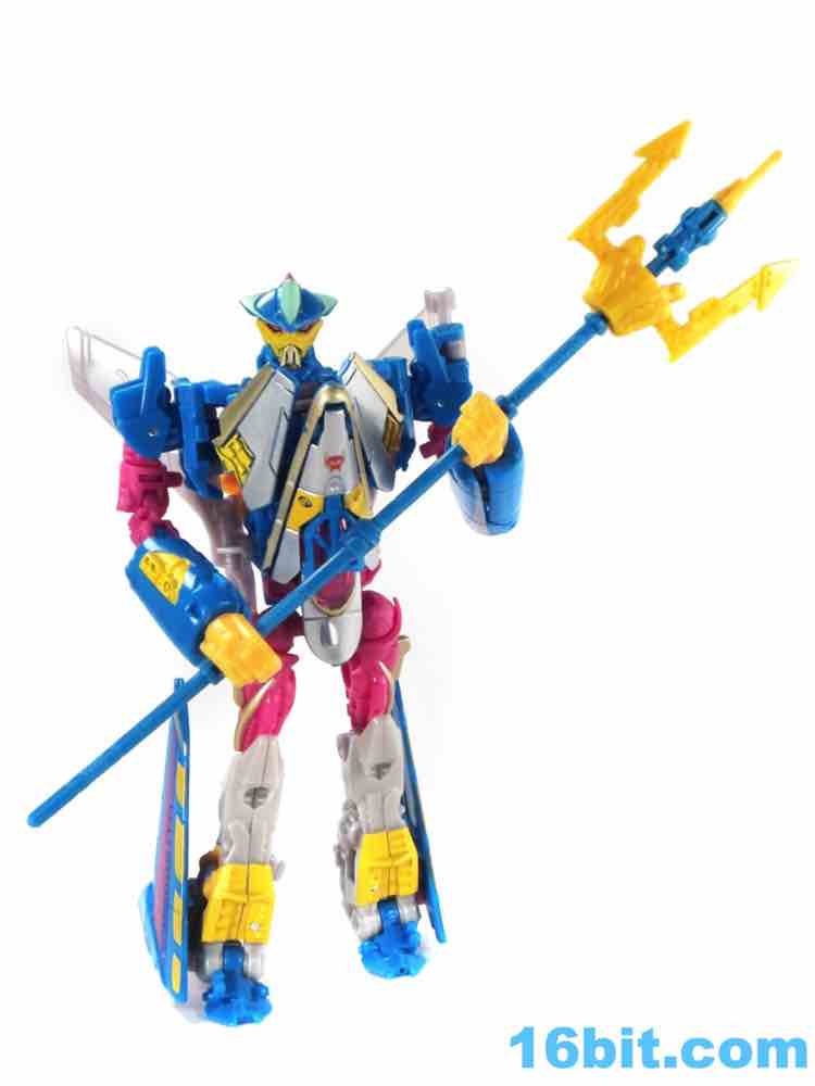 He has no problems holding his trident, which has articulated points and two grips. Because of the good arm joints and the wrists, you can squeeze some pretty awesome poses out of this guy - he also stands up quite nicely on a shelf. It's worth noting that the toy is packaged in vehicle mode, and in my case he had some flash on a few parts that needed to be trimmed to get him in this mode. So be careful, it might need some more elbow grease to function. The shoulder area was always a little tricky.