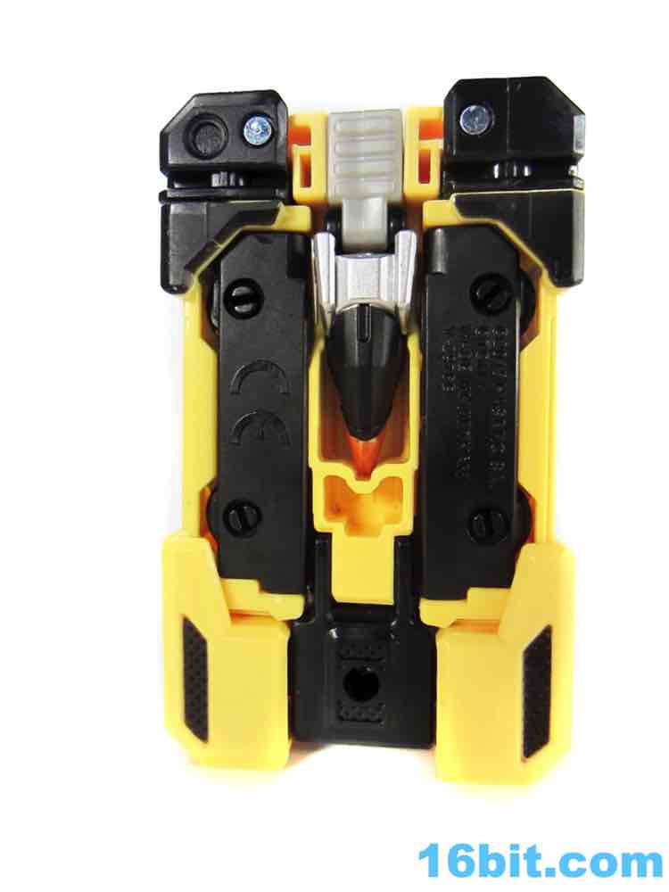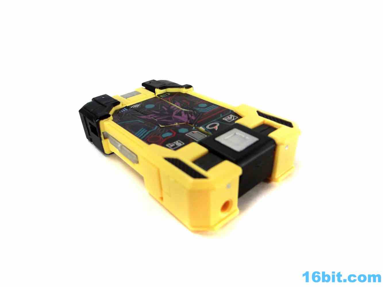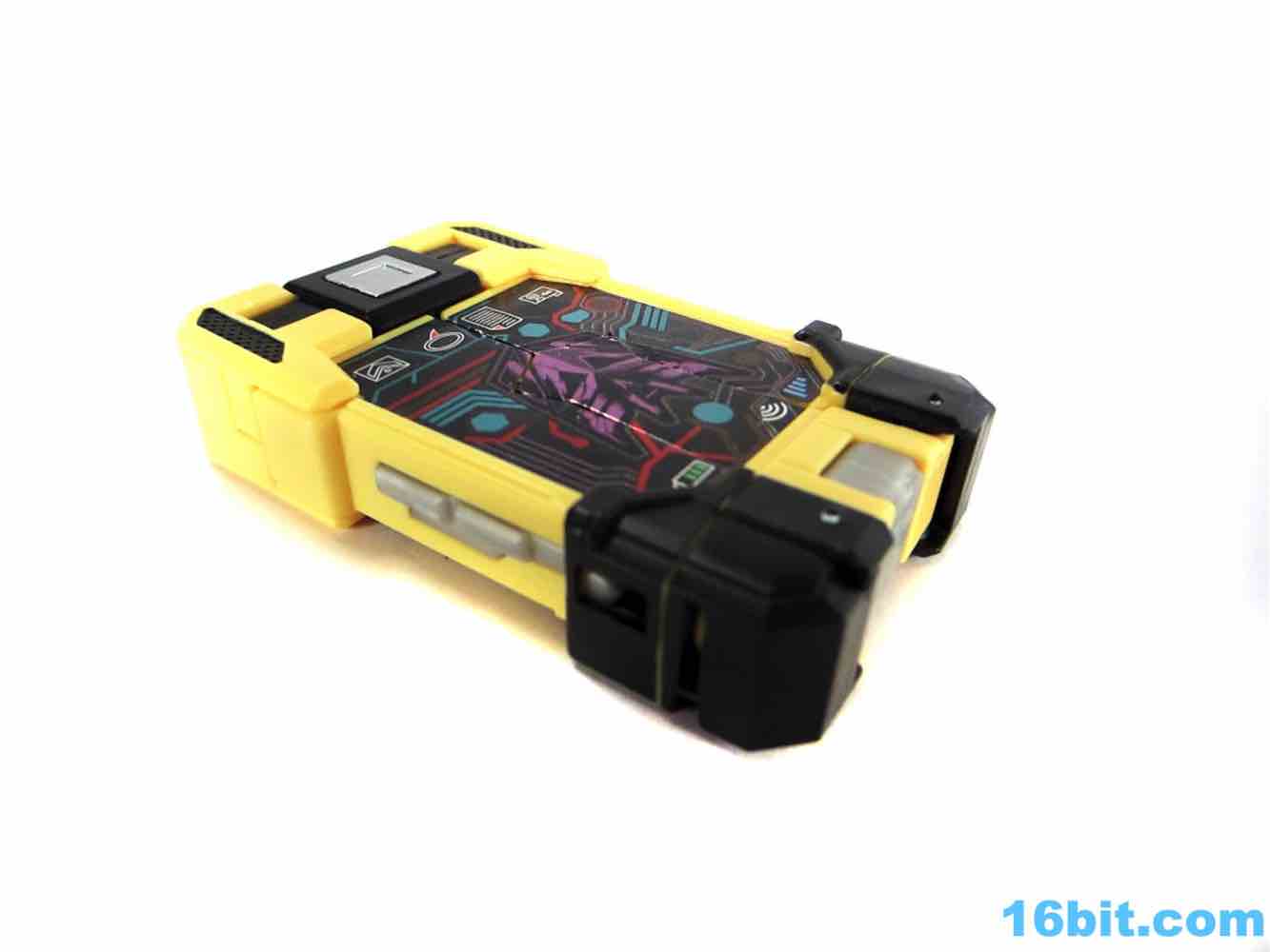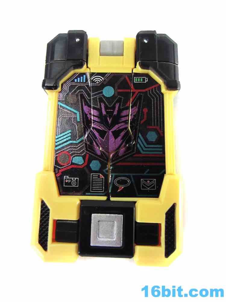 The toy is now a smart phone - a small one. It will probably fit in Blaster's chest without a hitch, and measures 3-inches by 1 3/4-inches by 1/2-inches. It's pretty substantial for a small box. Cast in a yellow/gold color with black markings, the figure makes ample use of foil stickers to create a decent screen. Mine seems to be in the process of peeling apart already, but it could just be my imagination - it's not bad, with indicators for battery, wi-fi, and of course bars. There are little icons for email and chat too, some thought was clearly given to developing some sort of Decepticon interface. Also, it is a block that does nothing.