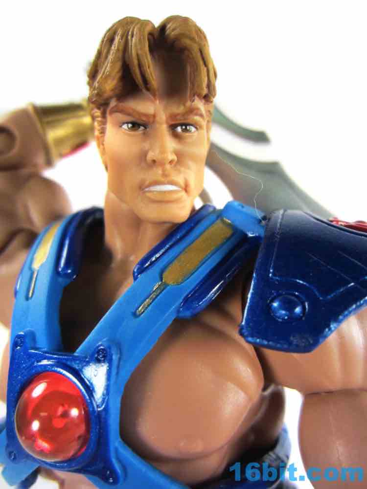I was hoping they'd give him the better bend-and-swivel wrist, but no, it's just normal swivel articulation. On the bright side he has actual gloved hands - you can see seams, and there are no fingernails painted over to pretend there are gloves. They did a nice job integrating an "H" New Adventures symbol on the wrists and the He-Man cross on the back of each hand. It's a little busy, sure, but you can see Dare incorporates elements of numerous He-Man costumes quite handily.