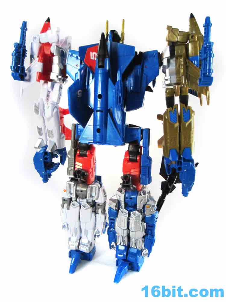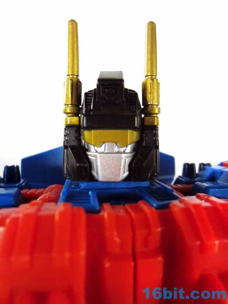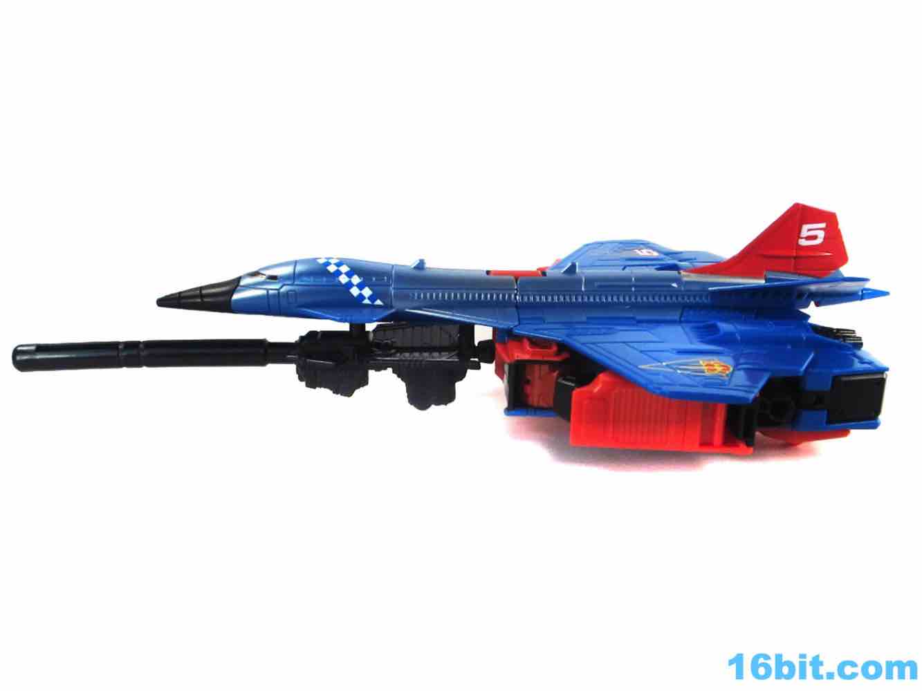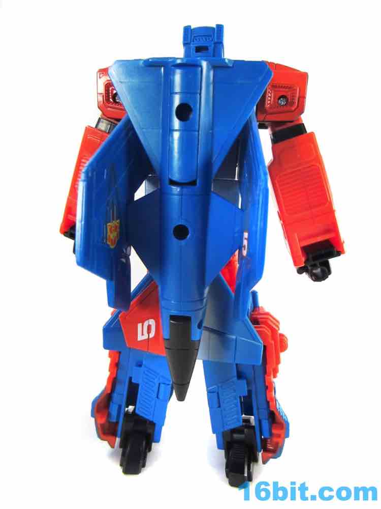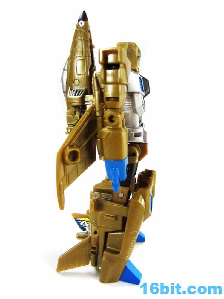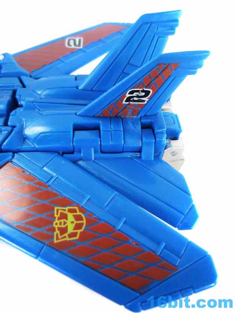 The biggest figure in the set is Silverbolt, and he's just as good as last year's G1-themed Silverbolt [FOTD #1,210]. There's still a lot of red on him, but the level of blue gives me a "Powered Convoy" vibe. Articulation is good, the gun is still black, and I'm actually kind of hard-pressed to say much more about it. This all feels very superficial, but the main differences are color and the jet deco. A couple of "5" marks resemble the original toy from over 20 years ago, and a checkered stripe across the "neck" is pretty slick. A metallic silver dusting also brings a lot of life to the jet mode and, sadly, is completely invisible when combined. It's nice to see Hasbro put this much effort in to the toy, complete with cool triangles on each wing, but what really matters is the torso mode. It's great. Gold eyes! Gold antenna! It's G2licious. On the back of the box he's assigned the number 1, which is unfortunate but whatever. Some people miss an opportunity for synergy, as the toys are rarely numbered themselves most of the time.