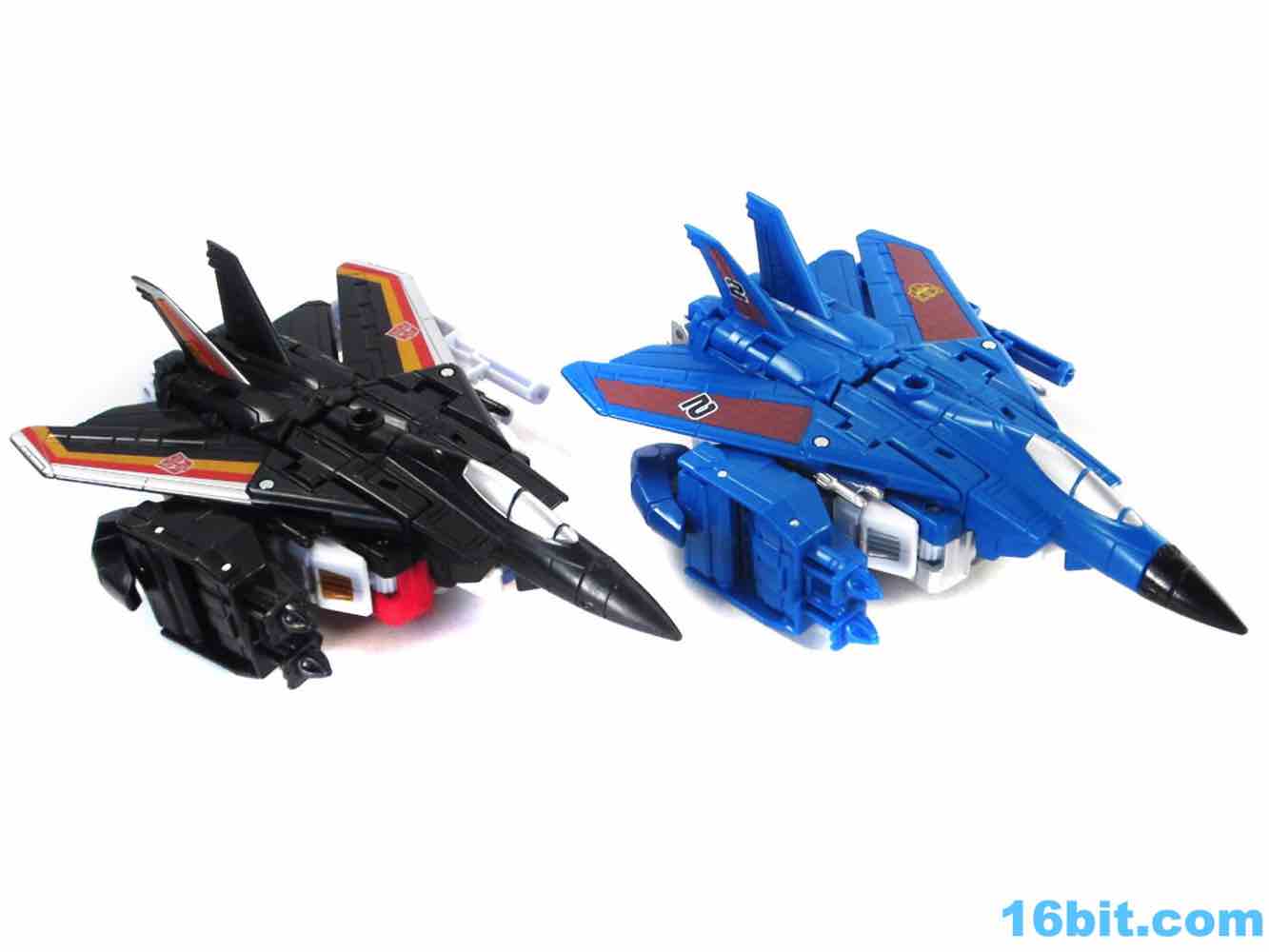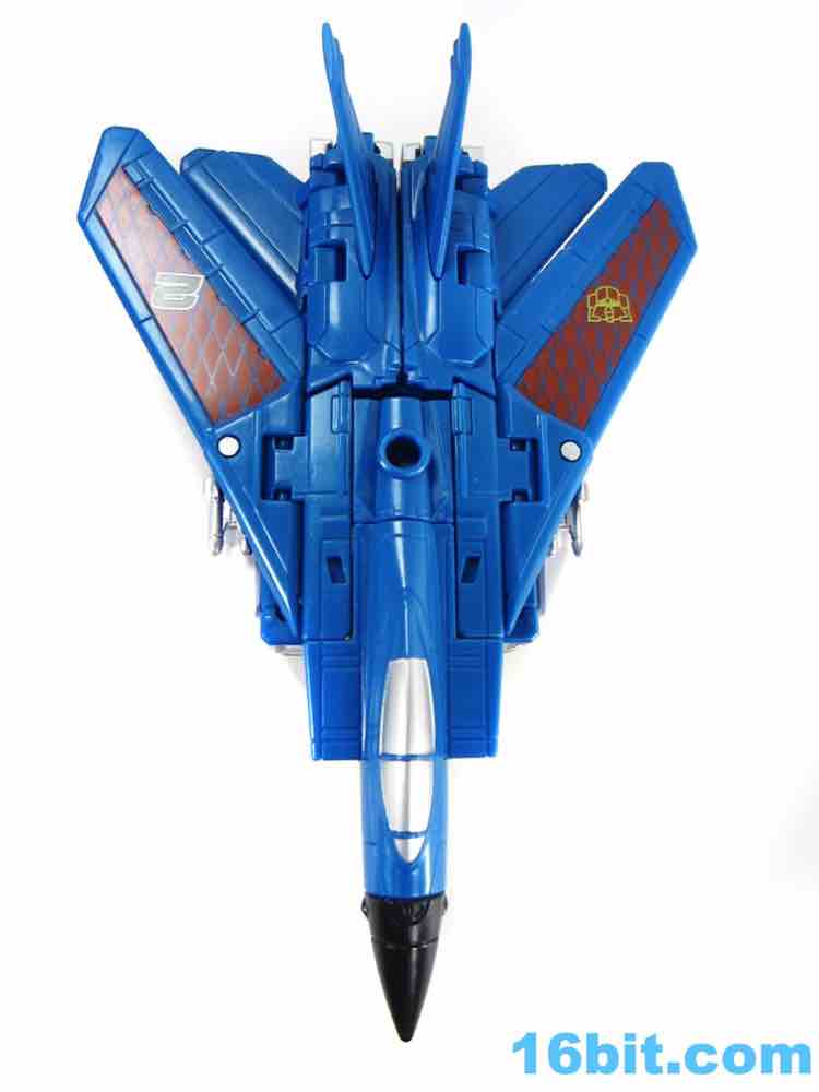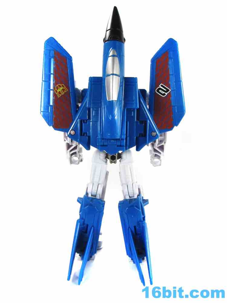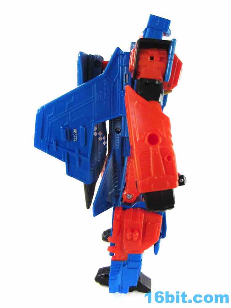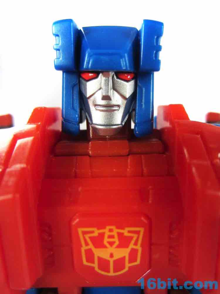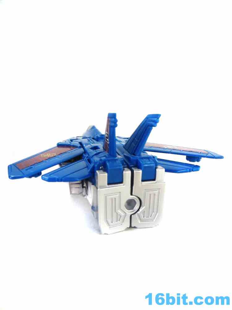 The biggest figure in the set is Silverbolt, and he's just as good as last year's G1-themed Silverbolt [FOTD #1,210]. There's still a lot of red on him, but the level of blue gives me a "Powered Convoy" vibe. Articulation is good, the gun is still black, and I'm actually kind of hard-pressed to say much more about it. This all feels very superficial, but the main differences are color and the jet deco. A couple of "5" marks resemble the original toy from over 20 years ago, and a checkered stripe across the "neck" is pretty slick. A metallic silver dusting also brings a lot of life to the jet mode and, sadly, is completely invisible when combined. It's nice to see Hasbro put this much effort in to the toy, complete with cool triangles on each wing, but what really matters is the torso mode. It's great. Gold eyes! Gold antenna! It's G2licious. On the back of the box he's assigned the number 1, which is unfortunate but whatever. Some people miss an opportunity for synergy, as the toys are rarely numbered themselves most of the time.