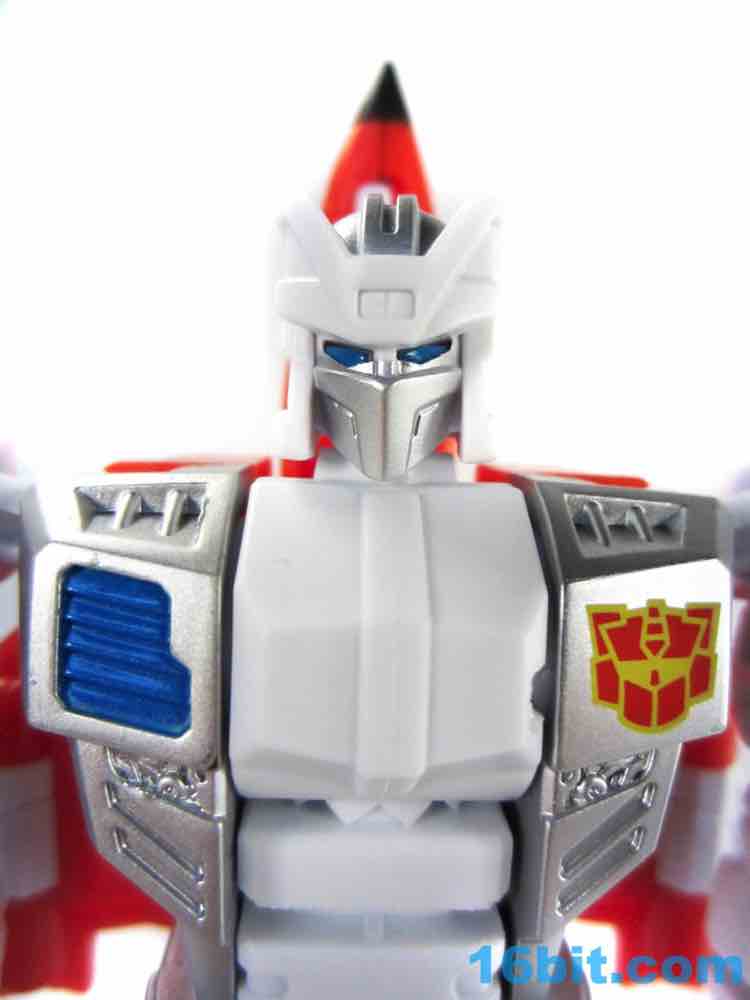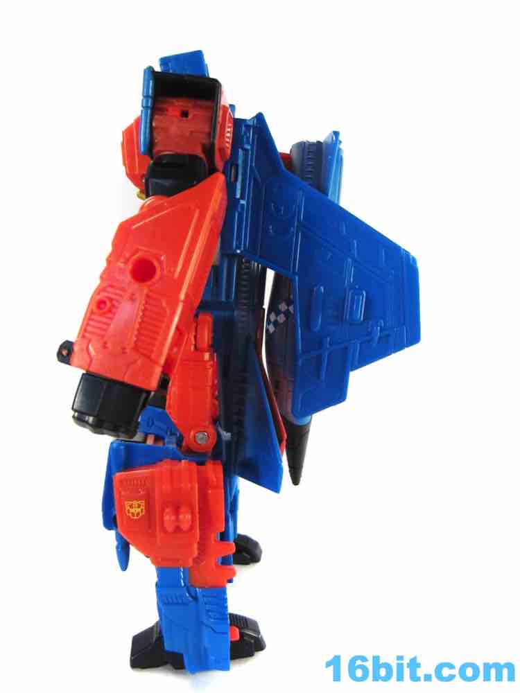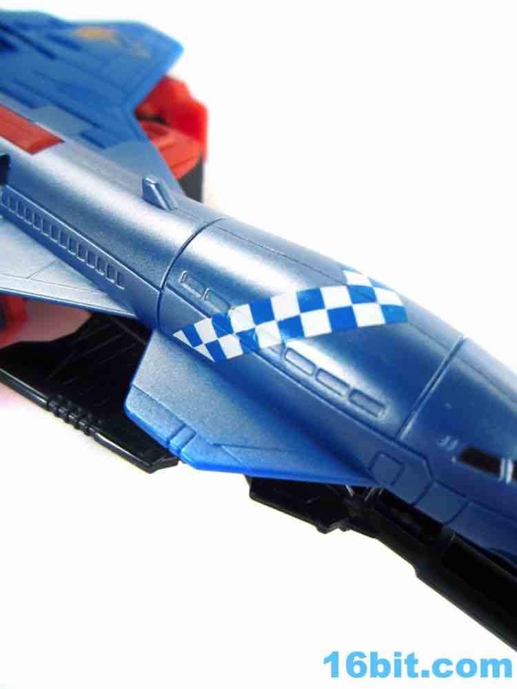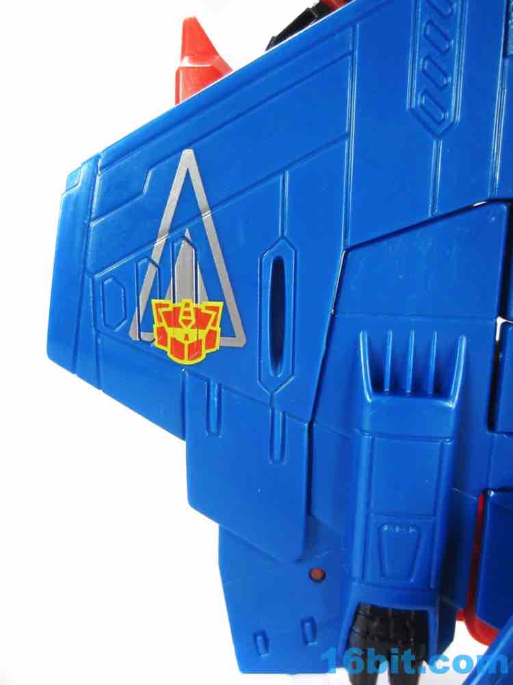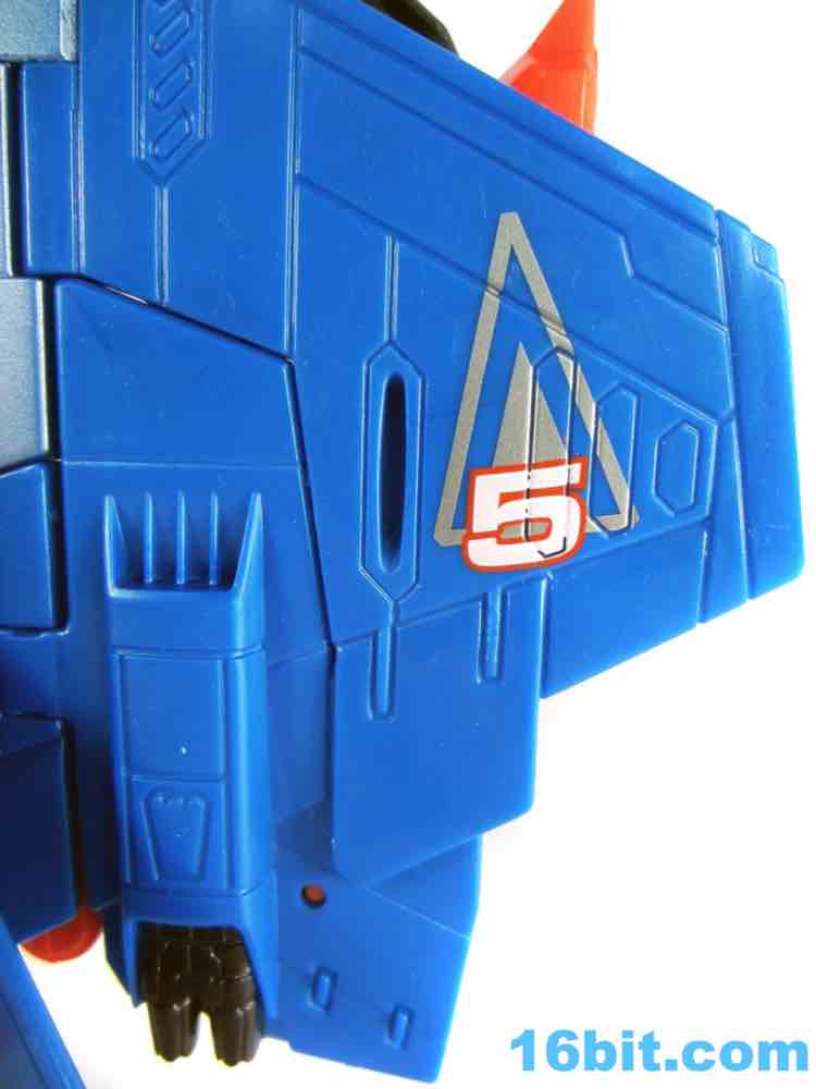 As a jet, he's great. The wings have a cloudy checker pattern that looks like it could only have come from the early 1990s, and the look is completed with a big number 1 and another Autobot symbol. The grey plane look is sensible and not too different from the G1 flavor, plus the look continues on his tail fins. I would say that the plane is more exciting to look at than the robot, and it's kind of a shame all those crazy patterns vanish in combiner mode.