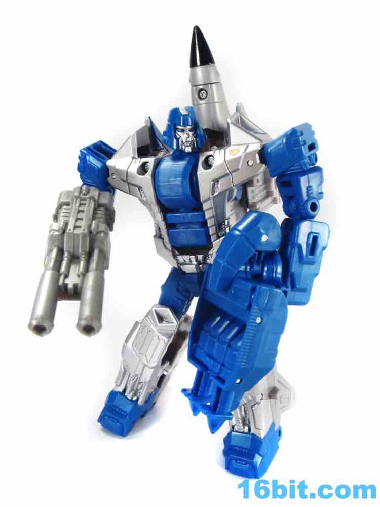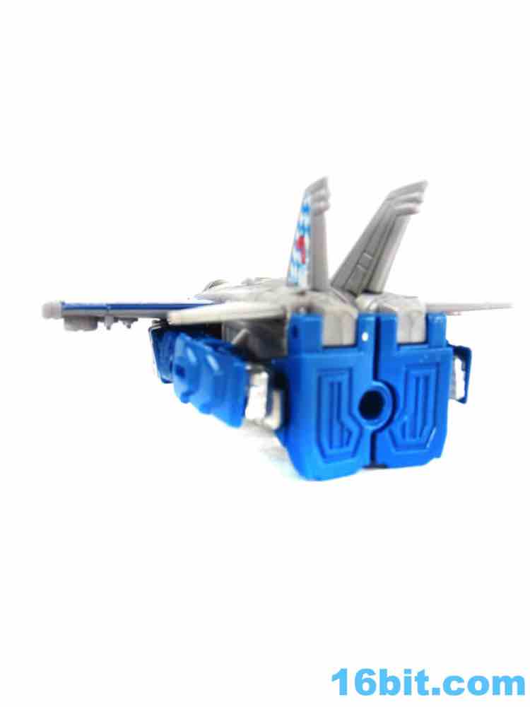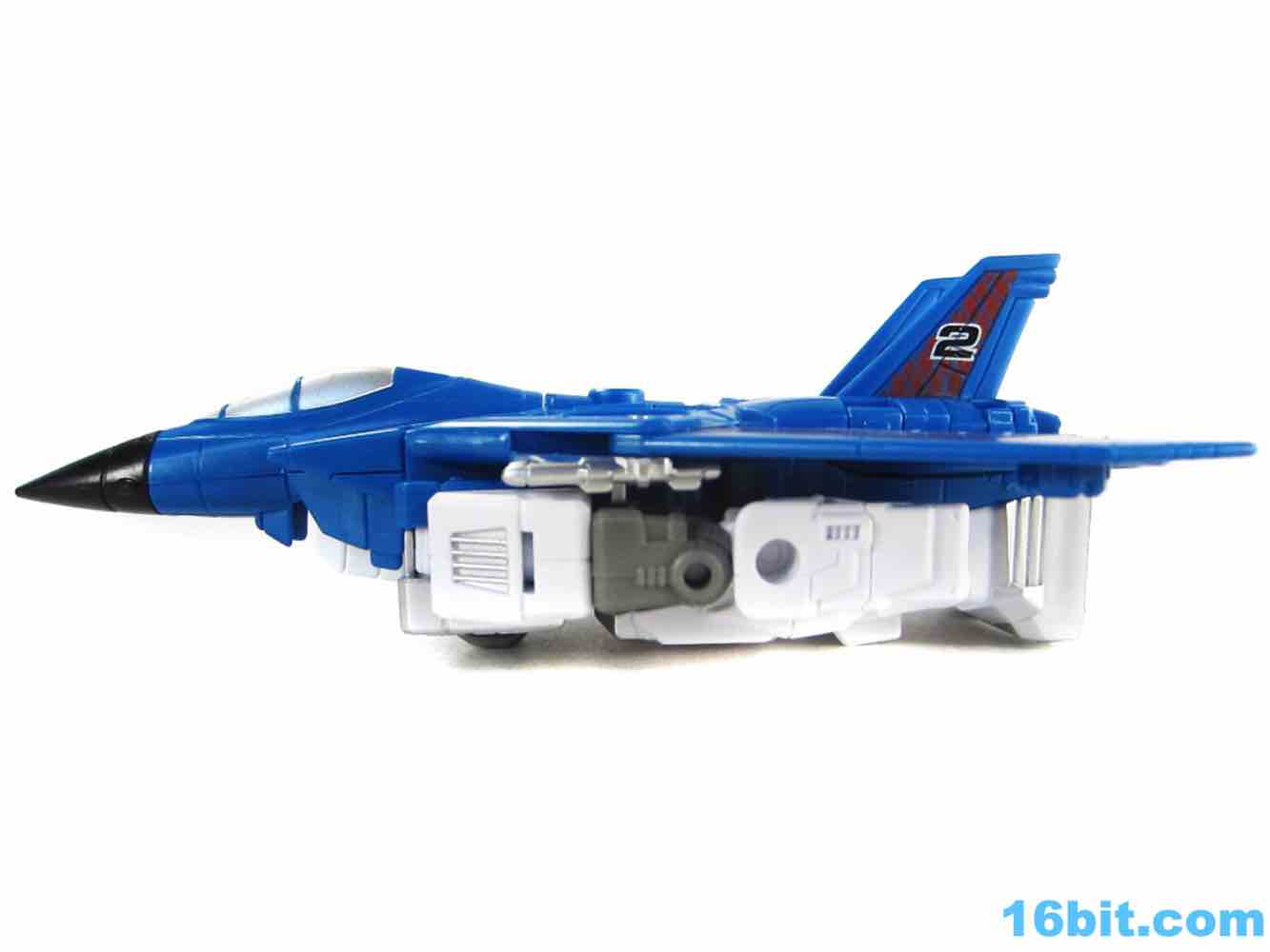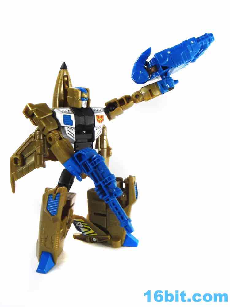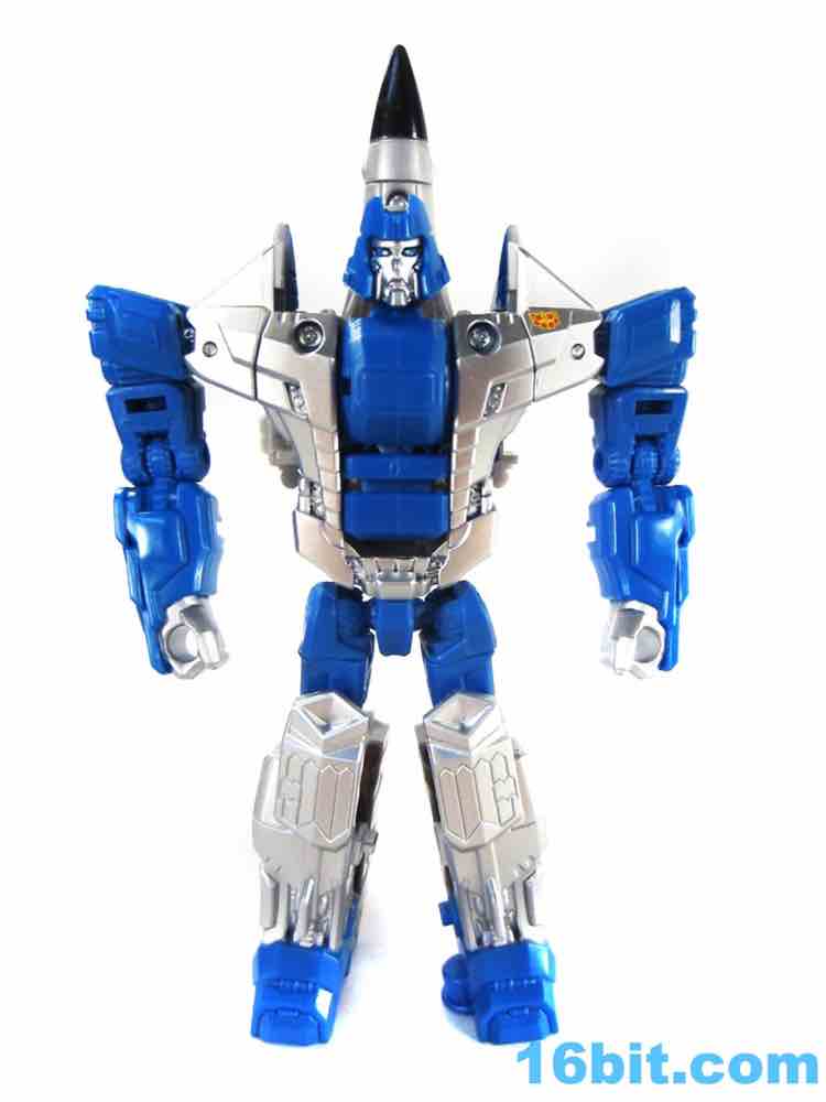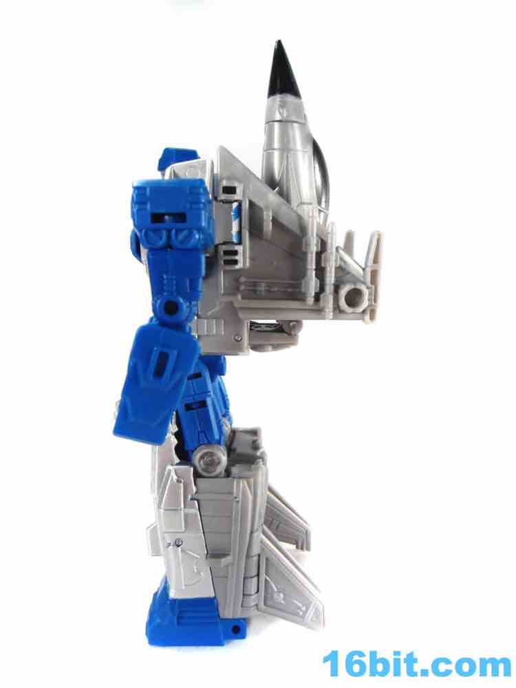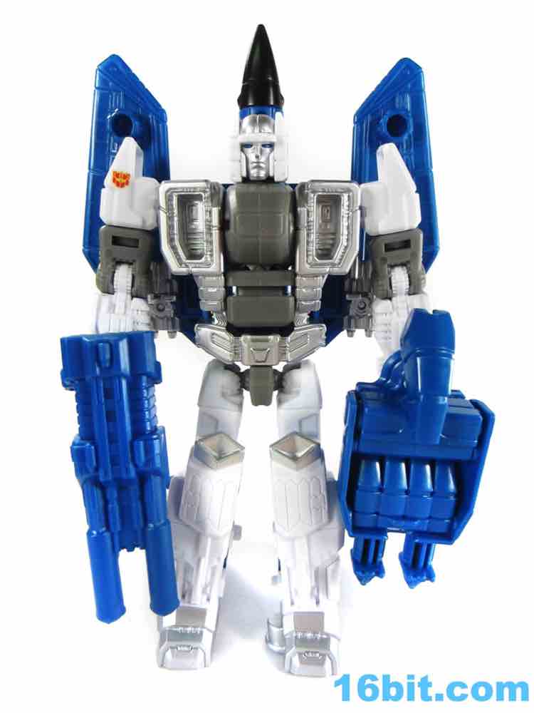 I'm very fond of Air Raid, now a blue jet with a mostly white and silver robot mode. Now, which gun is his? Good question. The official shots shows him holding the blue double-barreled gun. However, he is boxed next to the grey one. The original 1994 toy had a black pistol, so I really don't know what to tell you there - I'm giving him the blue one because it blends in less. The robot itself is pretty sharp, with loads of silver and white. The tiny G2 Autobot logo on his shoulder is terribly small, but at least it's present and colored consistently with his teammates. The toy has the exact same articulation as last year's Air Raid [FOTD #1,159], and feels a little less snazzy than that original release.