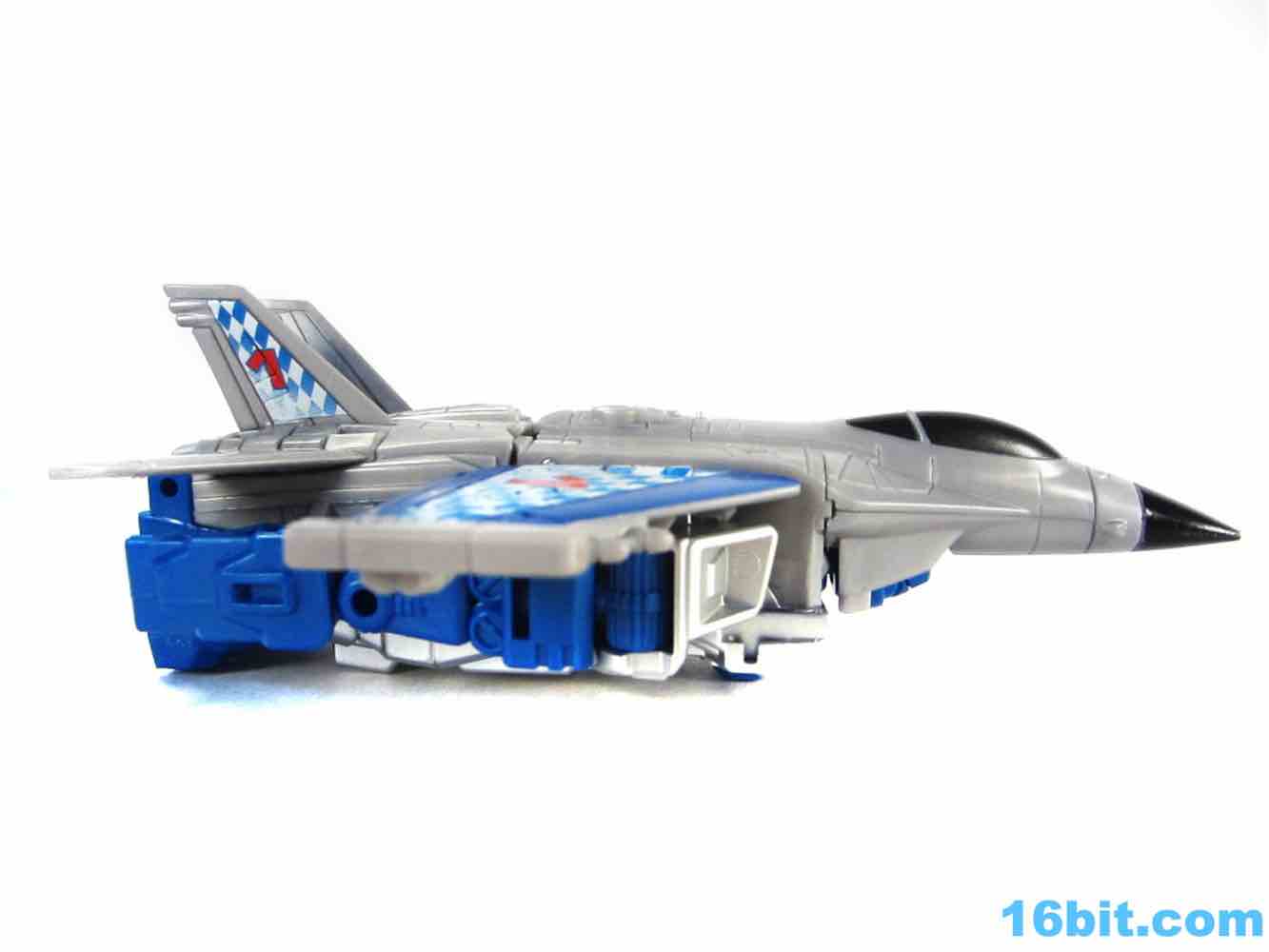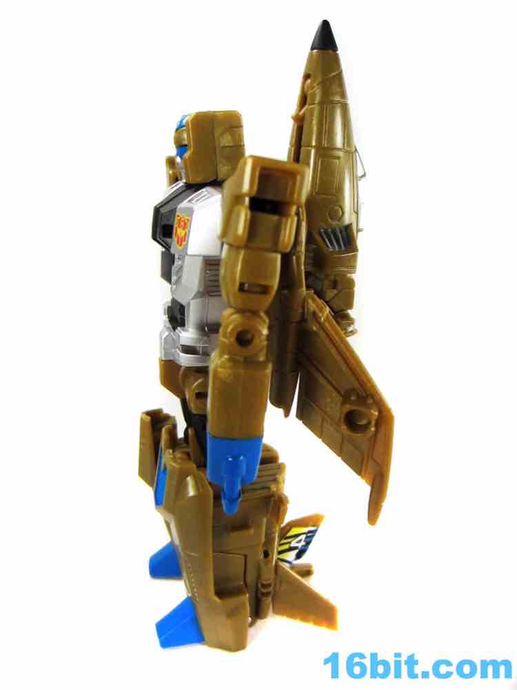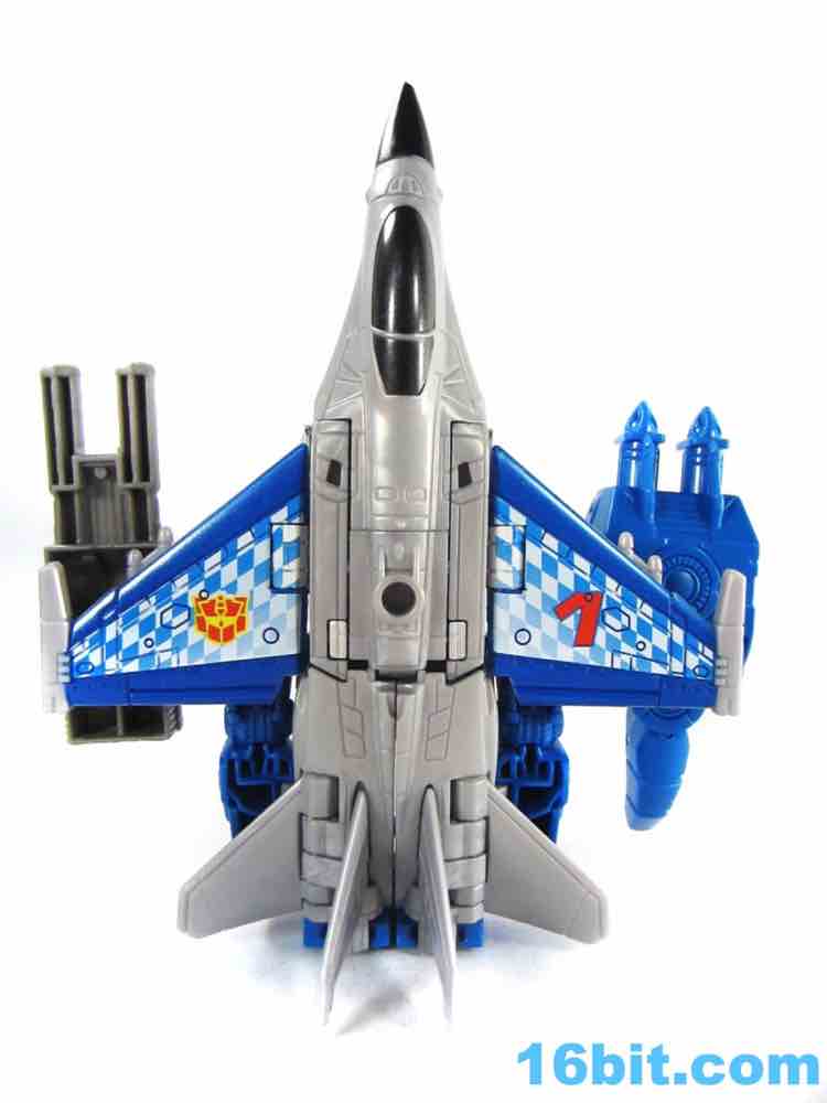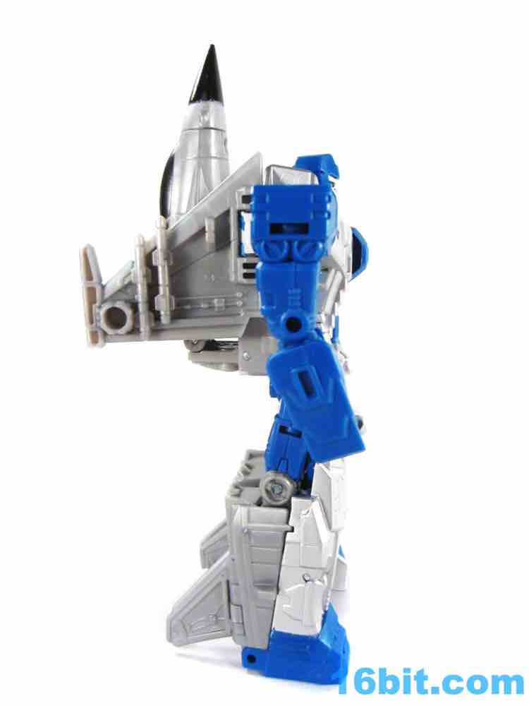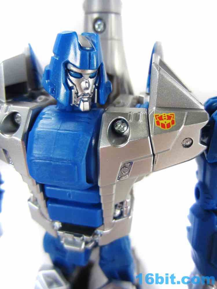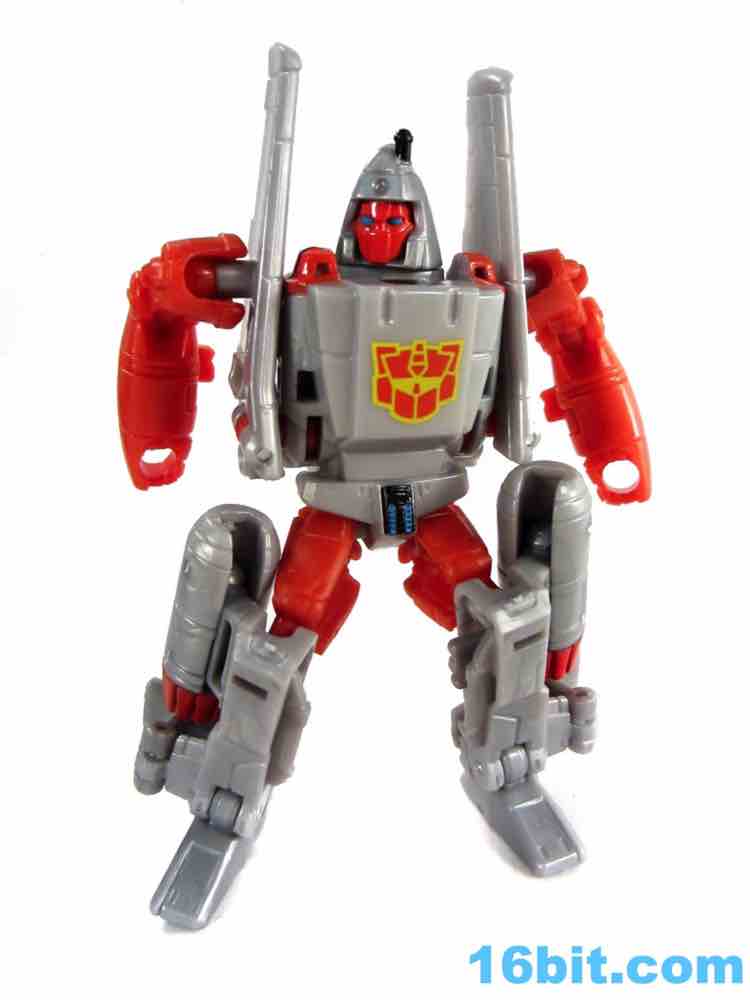 I'm very fond of Air Raid, now a blue jet with a mostly white and silver robot mode. Now, which gun is his? Good question. The official shots shows him holding the blue double-barreled gun. However, he is boxed next to the grey one. The original 1994 toy had a black pistol, so I really don't know what to tell you there - I'm giving him the blue one because it blends in less. The robot itself is pretty sharp, with loads of silver and white. The tiny G2 Autobot logo on his shoulder is terribly small, but at least it's present and colored consistently with his teammates. The toy has the exact same articulation as last year's Air Raid [FOTD #1,159], and feels a little less snazzy than that original release.