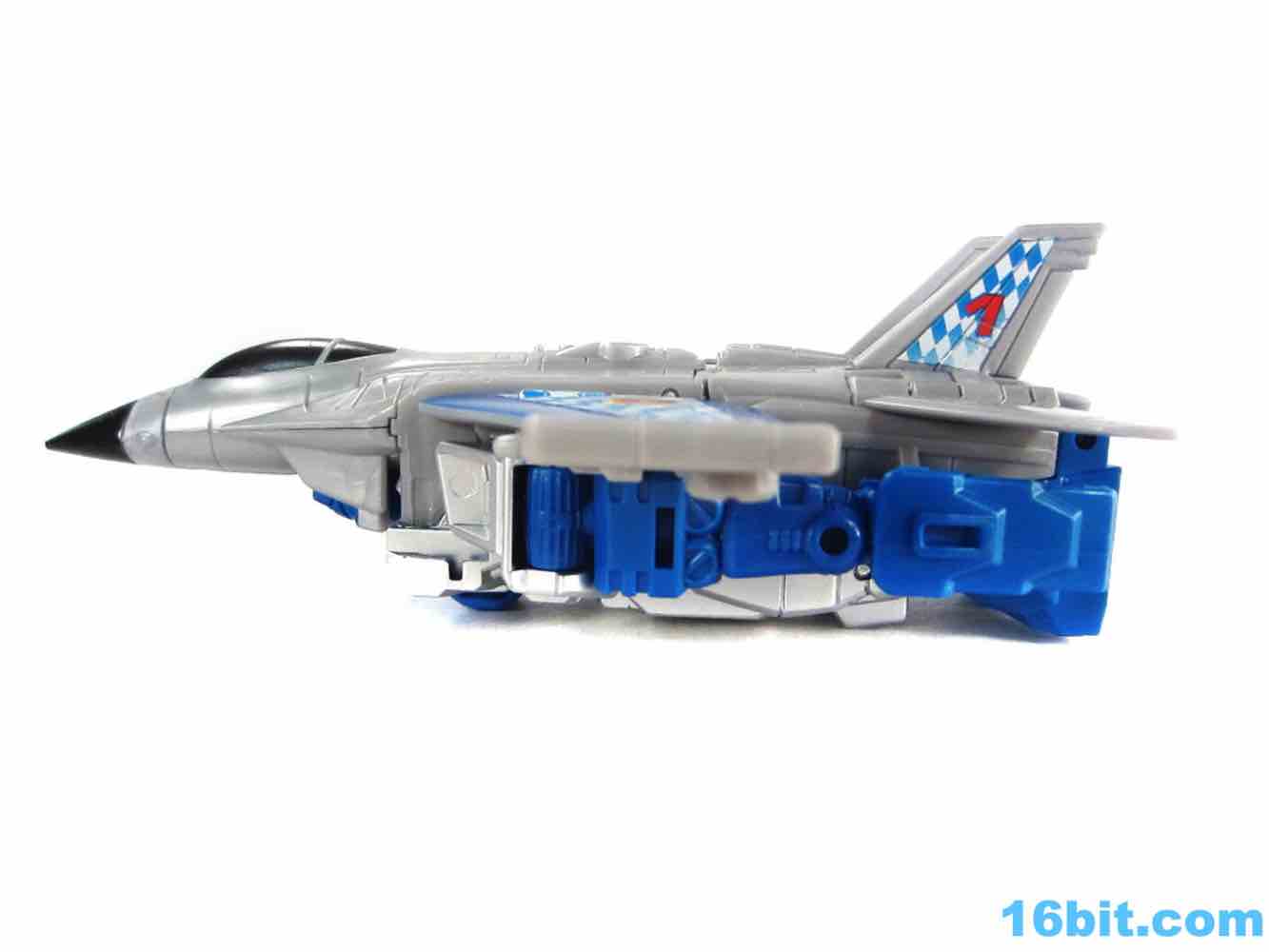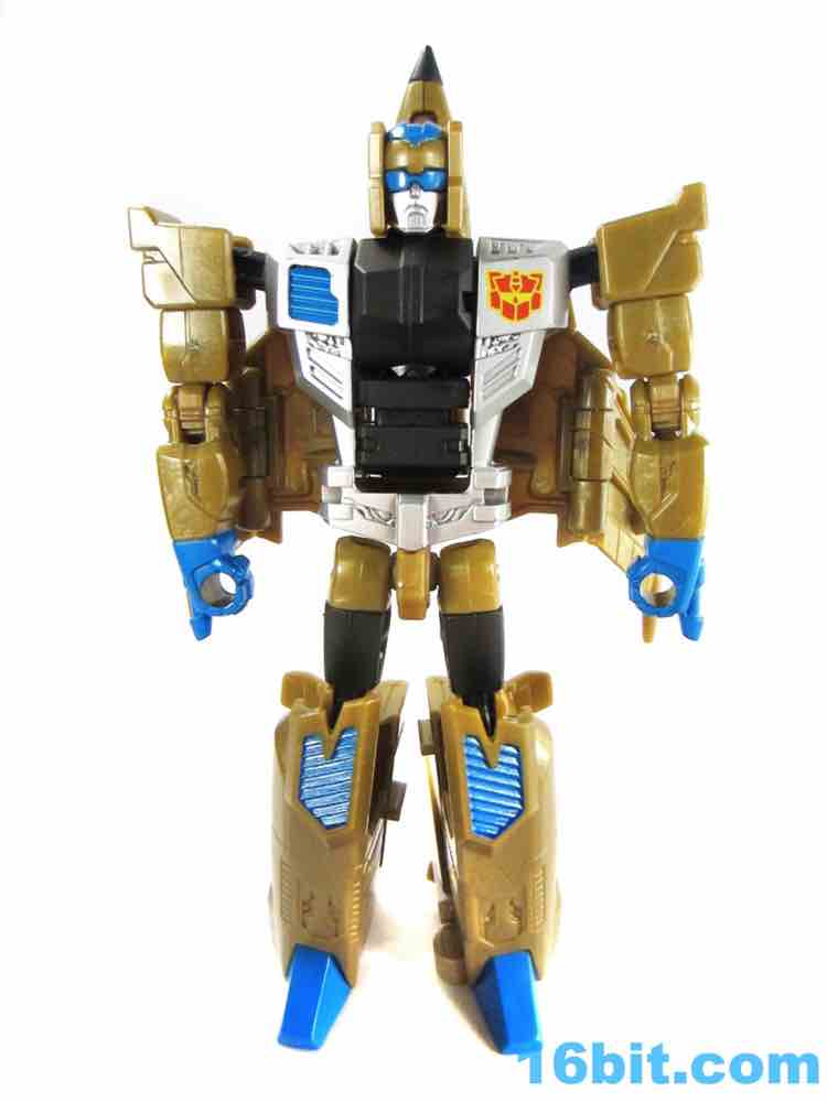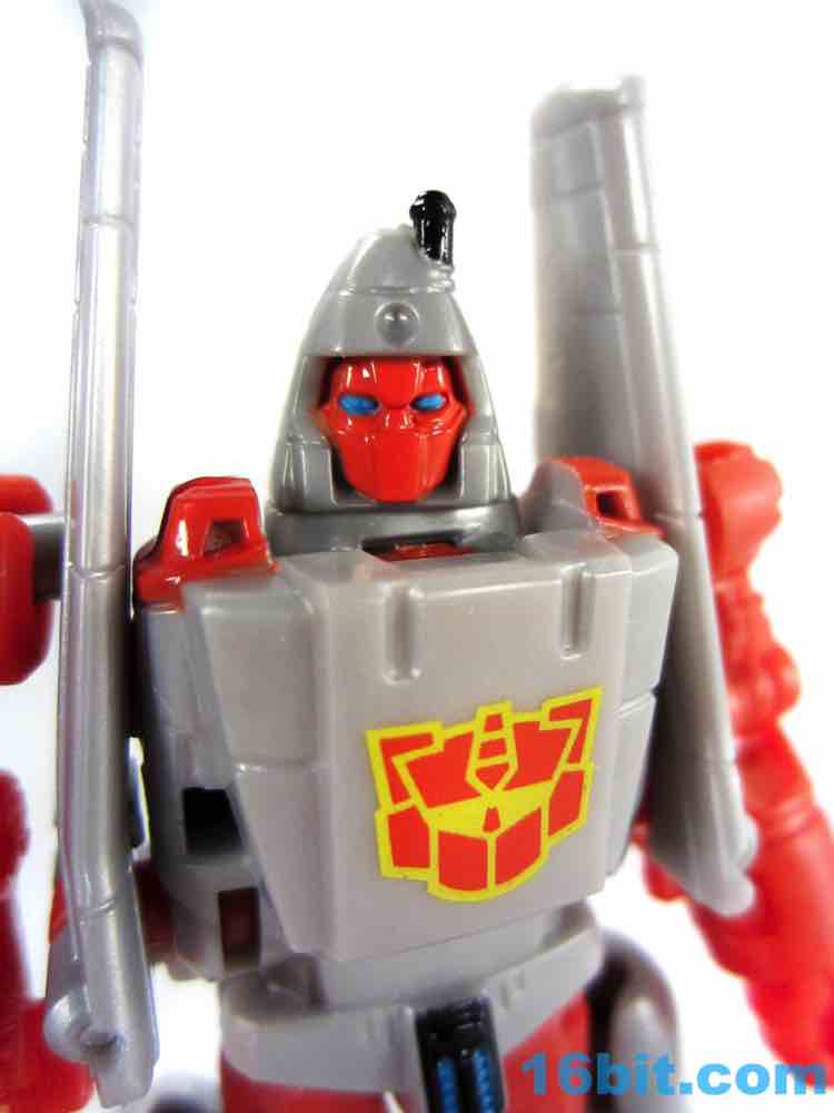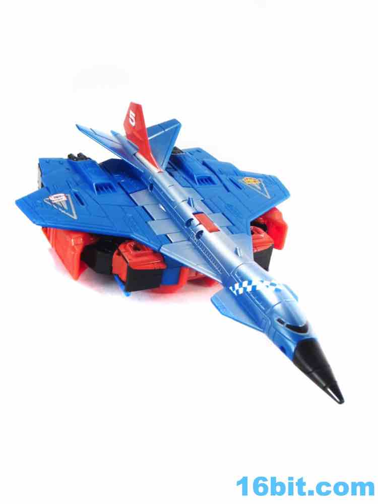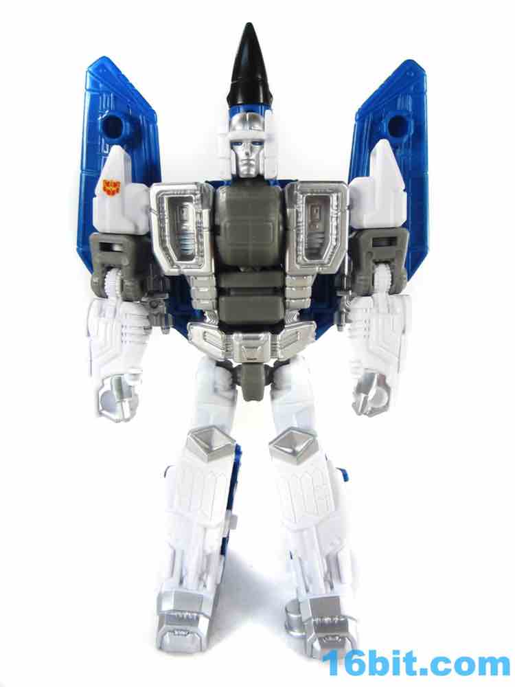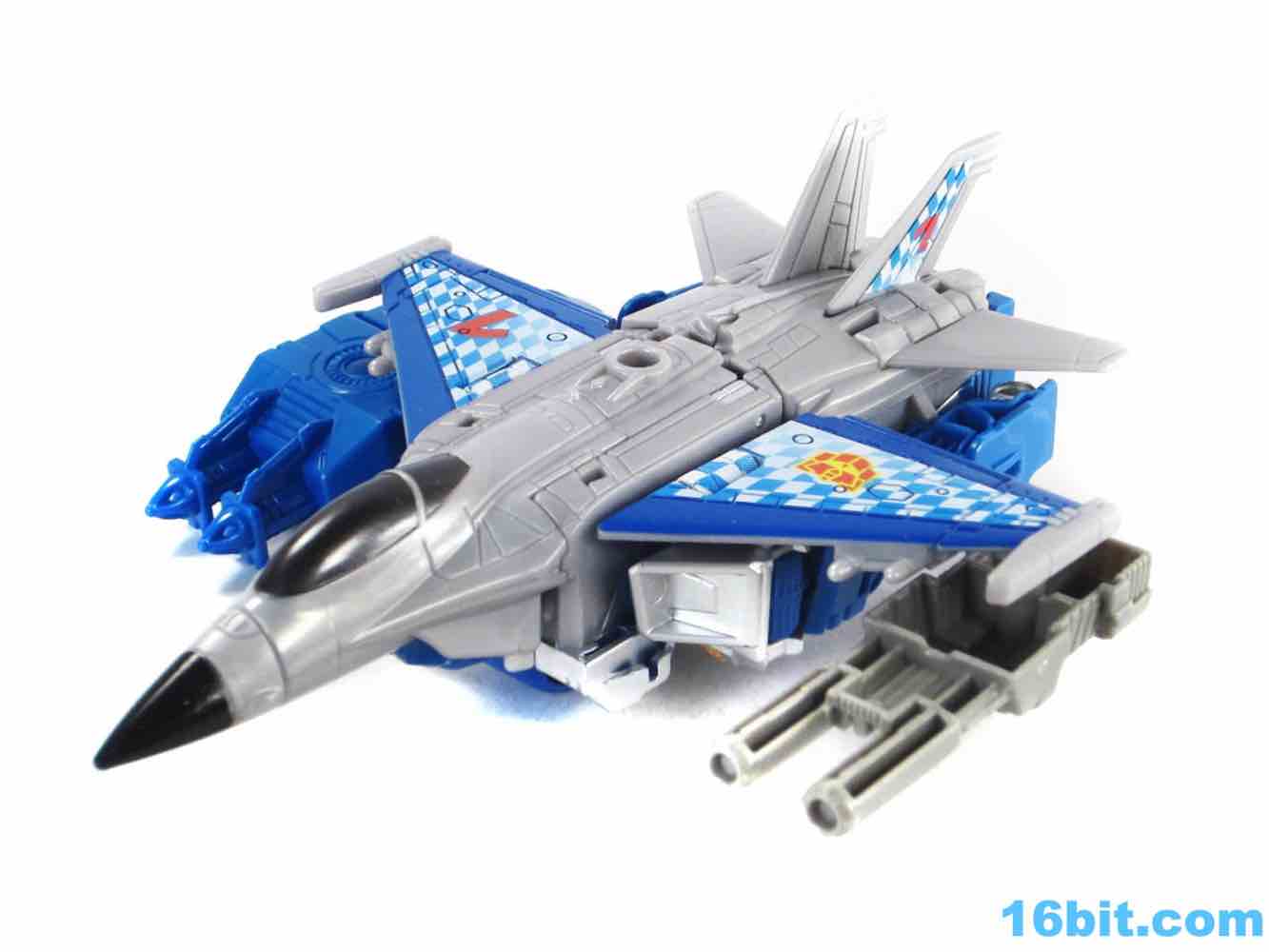 I'm very fond of Air Raid, now a blue jet with a mostly white and silver robot mode. Now, which gun is his? Good question. The official shots shows him holding the blue double-barreled gun. However, he is boxed next to the grey one. The original 1994 toy had a black pistol, so I really don't know what to tell you there - I'm giving him the blue one because it blends in less. The robot itself is pretty sharp, with loads of silver and white. The tiny G2 Autobot logo on his shoulder is terribly small, but at least it's present and colored consistently with his teammates. The toy has the exact same articulation as last year's Air Raid [FOTD #1,159], and feels a little less snazzy than that original release.