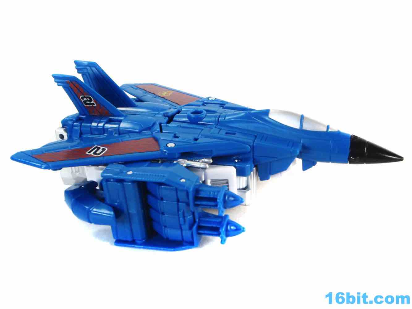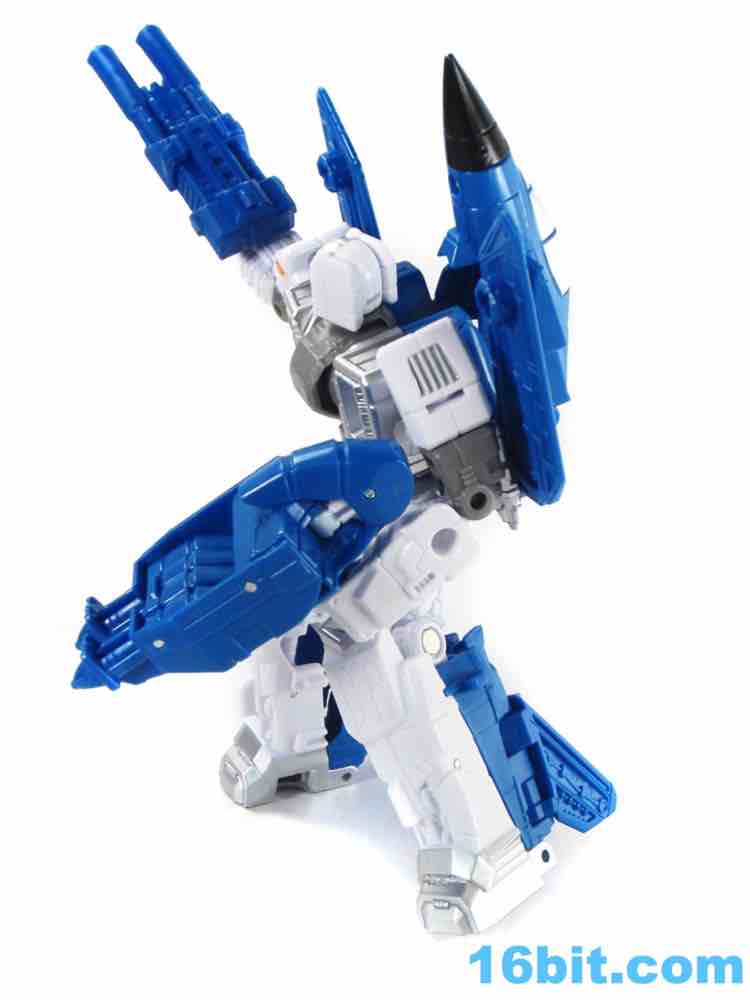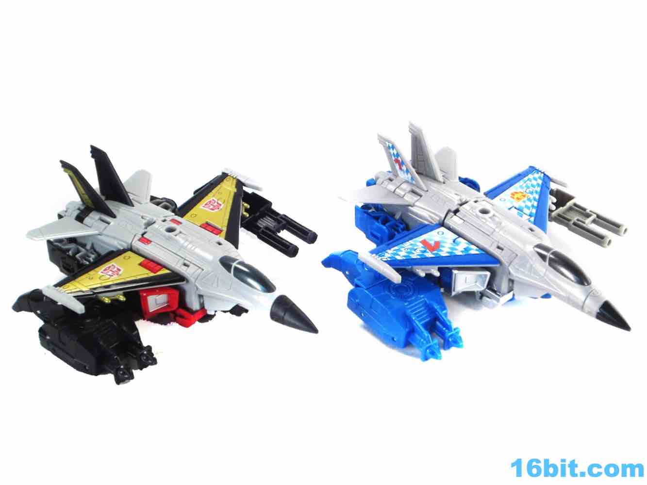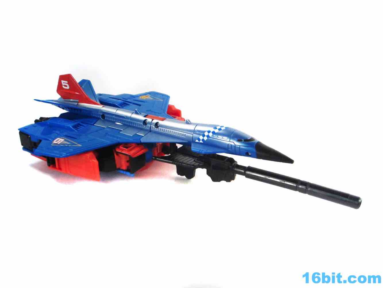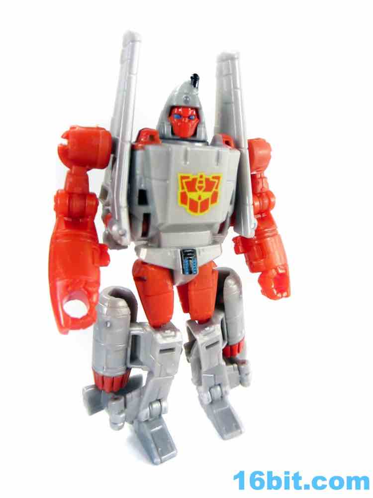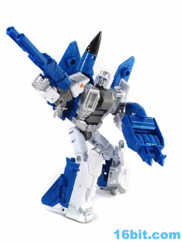 I'm very fond of Air Raid, now a blue jet with a mostly white and silver robot mode. Now, which gun is his? Good question. The official shots shows him holding the blue double-barreled gun. However, he is boxed next to the grey one. The original 1994 toy had a black pistol, so I really don't know what to tell you there - I'm giving him the blue one because it blends in less. The robot itself is pretty sharp, with loads of silver and white. The tiny G2 Autobot logo on his shoulder is terribly small, but at least it's present and colored consistently with his teammates. The toy has the exact same articulation as last year's Air Raid [FOTD #1,159], and feels a little less snazzy than that original release.