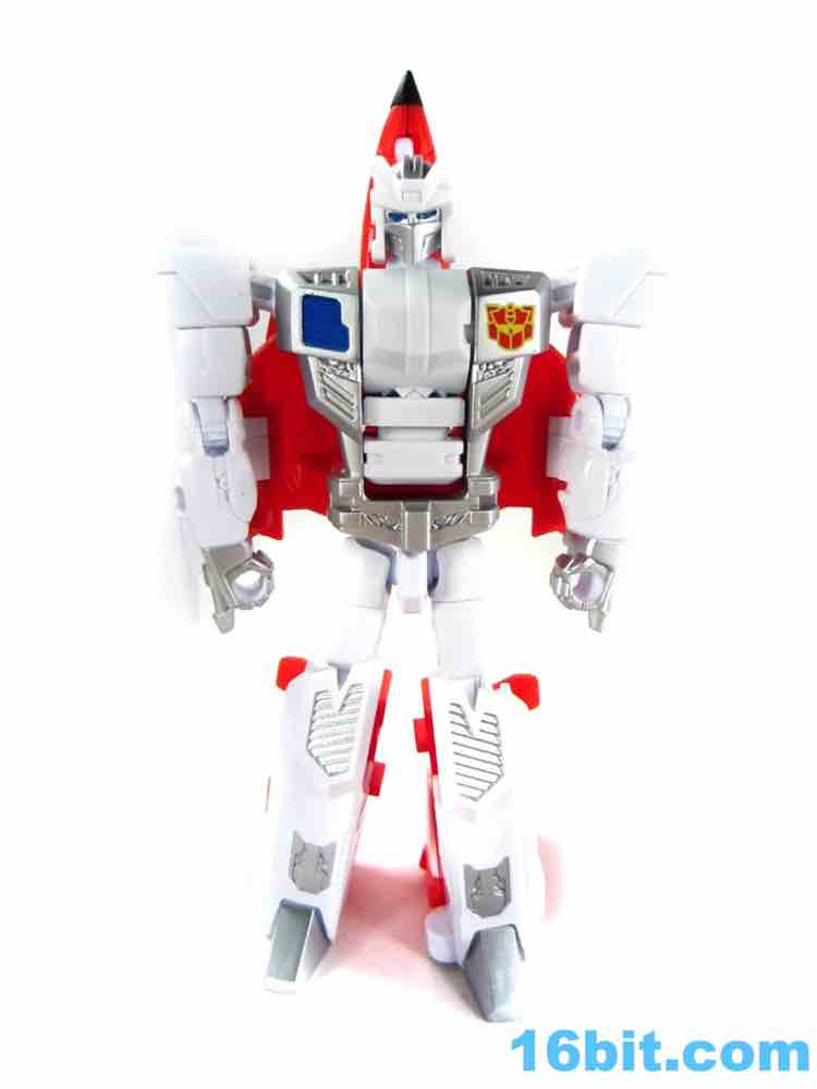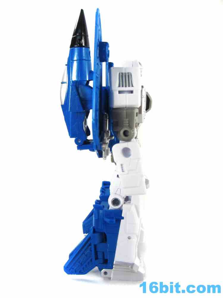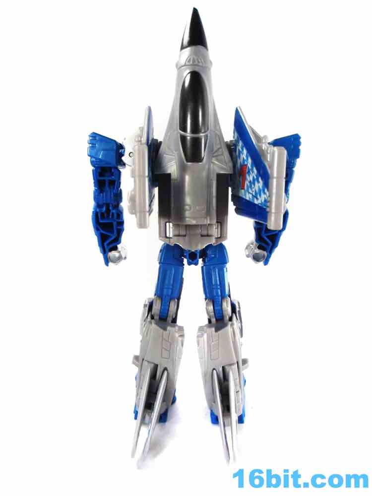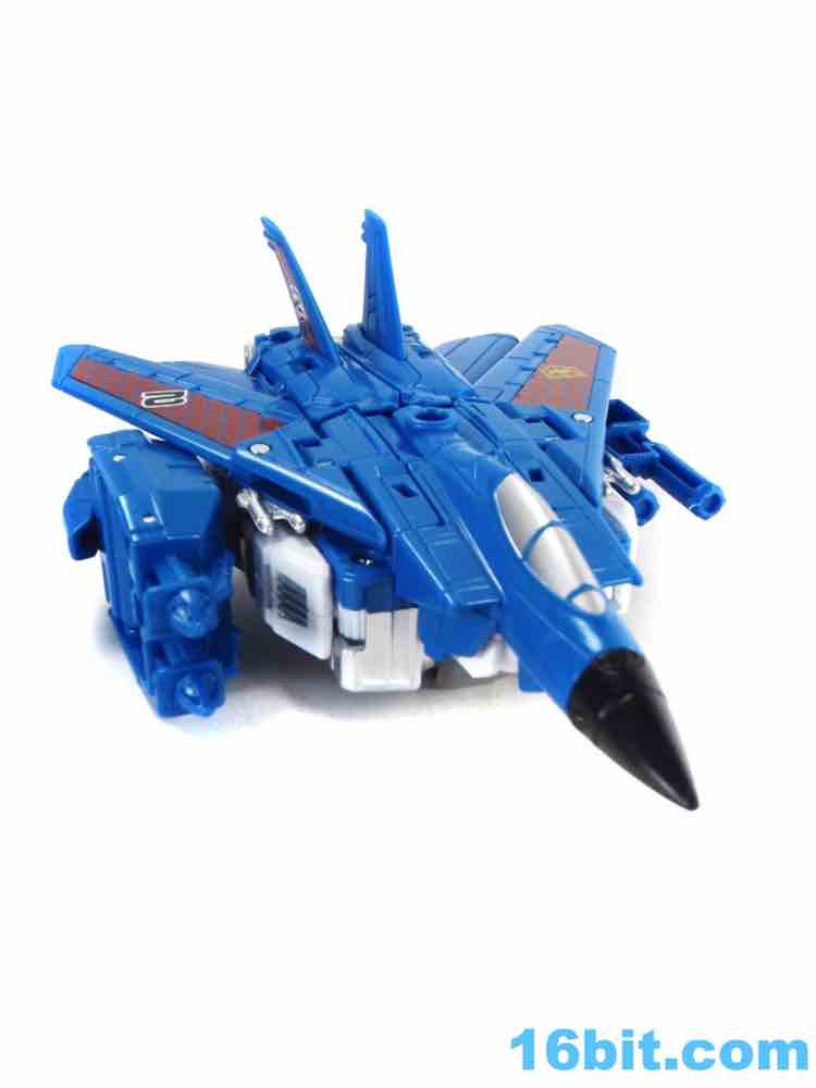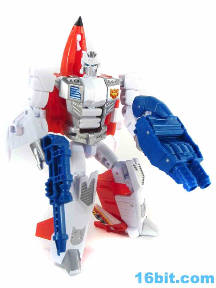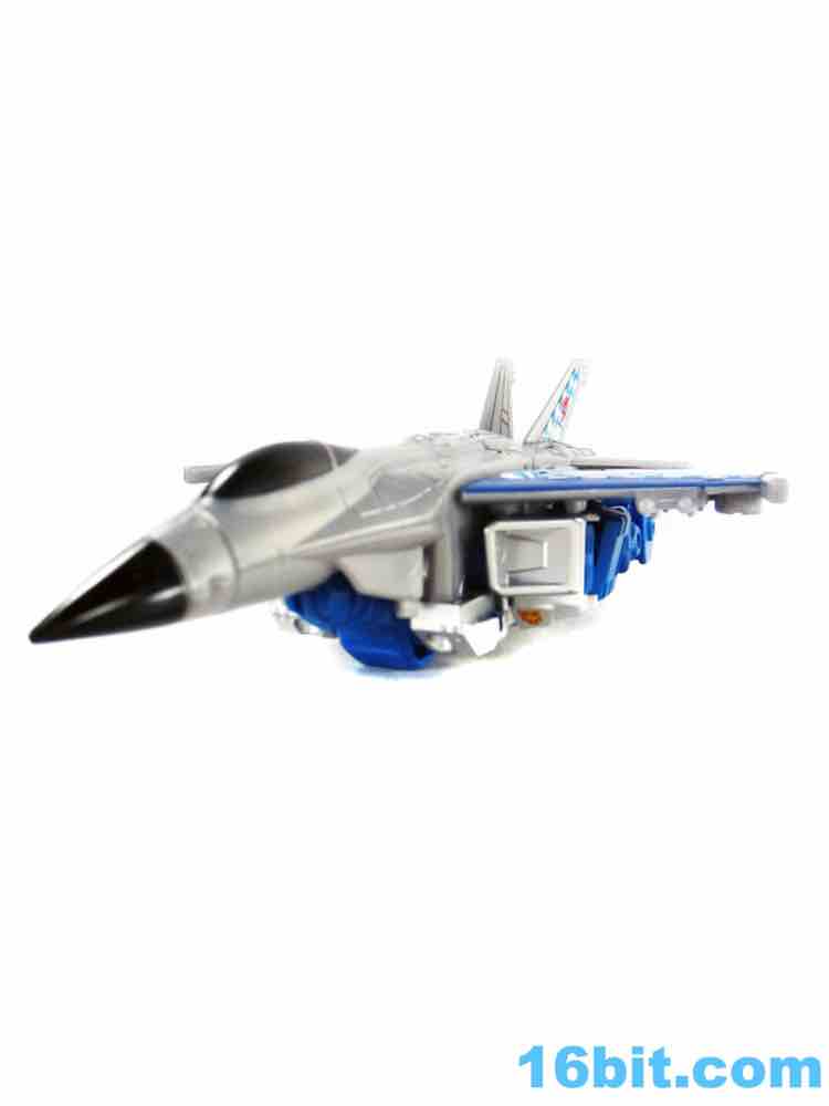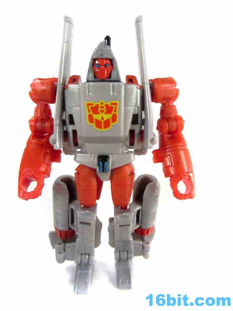 I'm very fond of Air Raid, now a blue jet with a mostly white and silver robot mode. Now, which gun is his? Good question. The official shots shows him holding the blue double-barreled gun. However, he is boxed next to the grey one. The original 1994 toy had a black pistol, so I really don't know what to tell you there - I'm giving him the blue one because it blends in less. The robot itself is pretty sharp, with loads of silver and white. The tiny G2 Autobot logo on his shoulder is terribly small, but at least it's present and colored consistently with his teammates. The toy has the exact same articulation as last year's Air Raid [FOTD #1,159], and feels a little less snazzy than that original release.