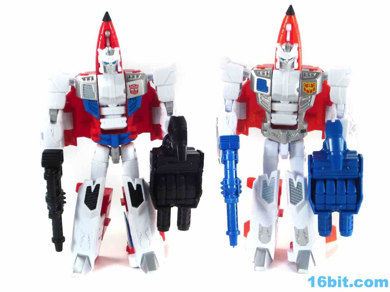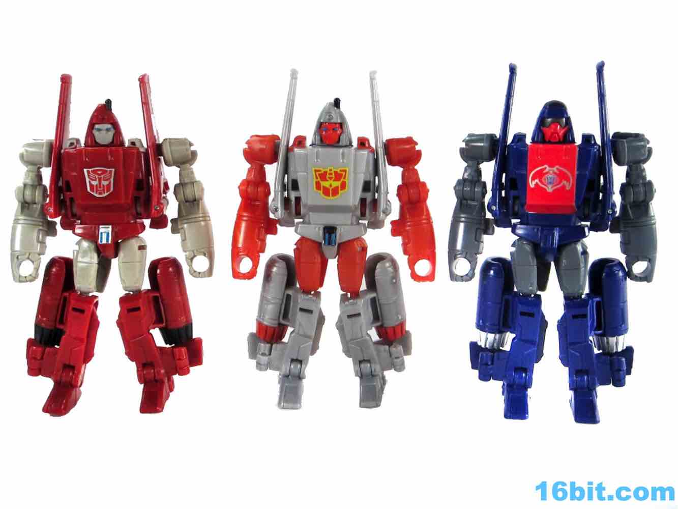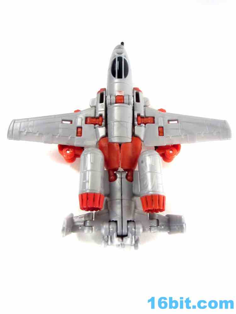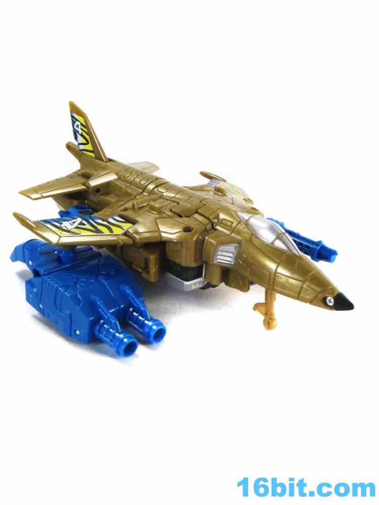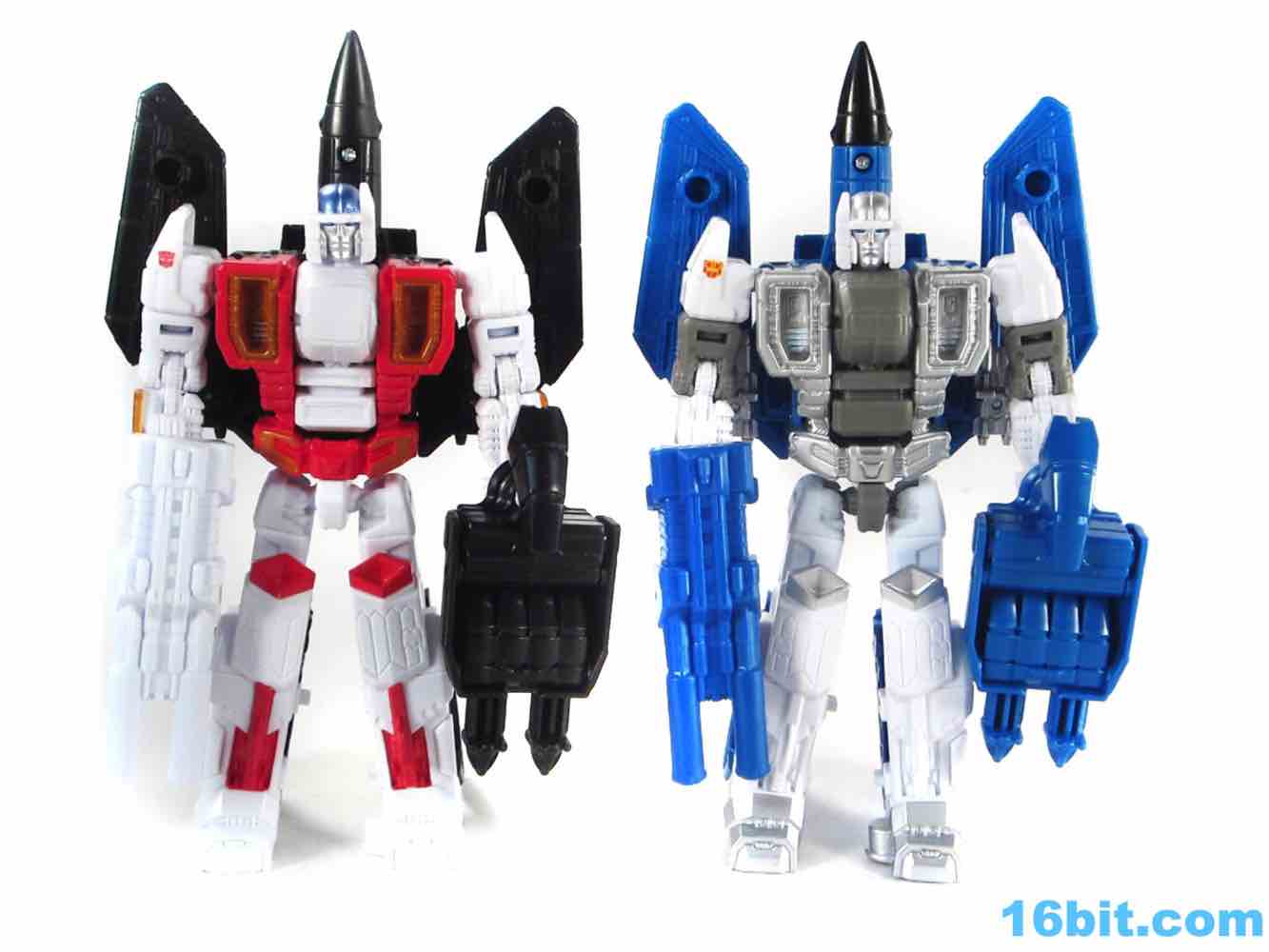 I'm very fond of Air Raid, now a blue jet with a mostly white and silver robot mode. Now, which gun is his? Good question. The official shots shows him holding the blue double-barreled gun. However, he is boxed next to the grey one. The original 1994 toy had a black pistol, so I really don't know what to tell you there - I'm giving him the blue one because it blends in less. The robot itself is pretty sharp, with loads of silver and white. The tiny G2 Autobot logo on his shoulder is terribly small, but at least it's present and colored consistently with his teammates. The toy has the exact same articulation as last year's Air Raid [FOTD #1,159], and feels a little less snazzy than that original release.