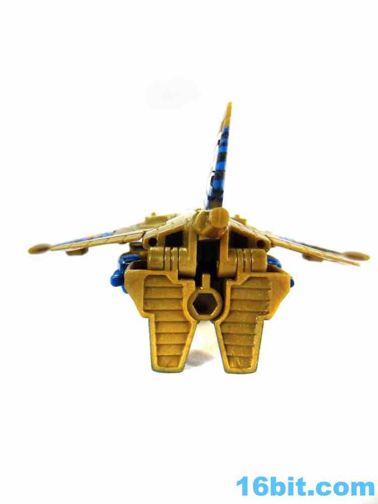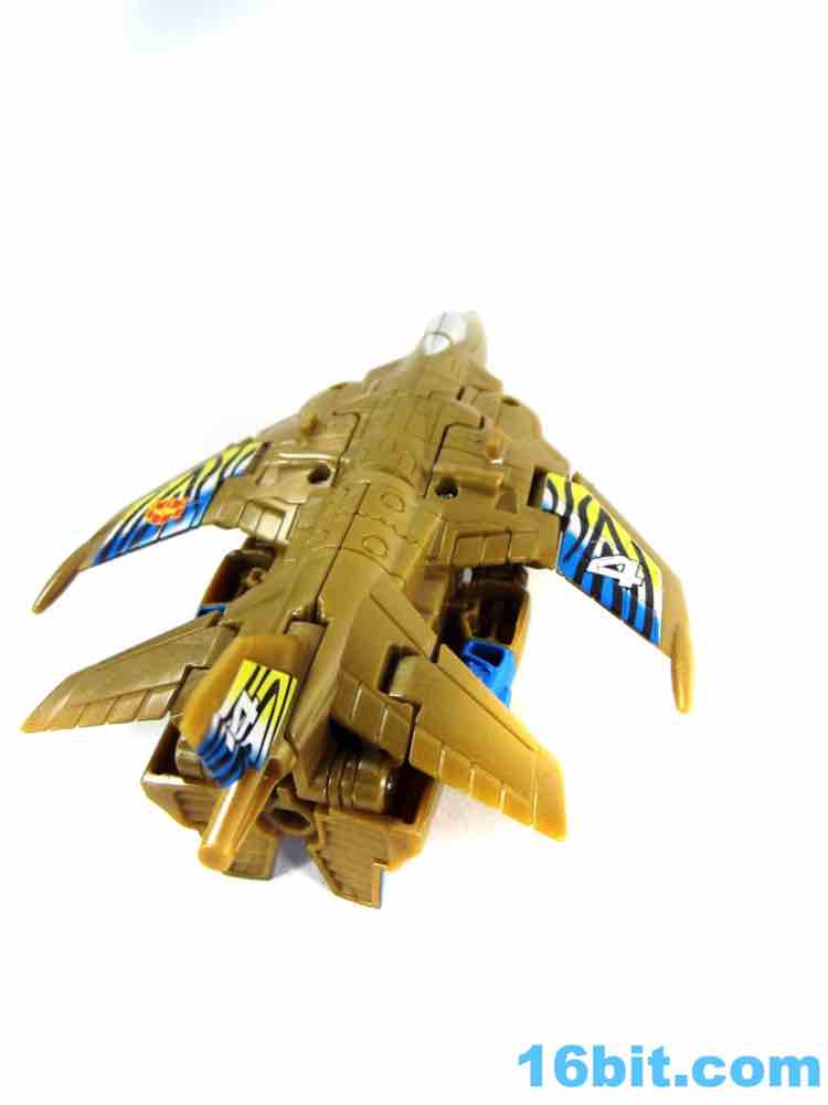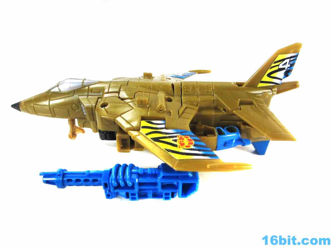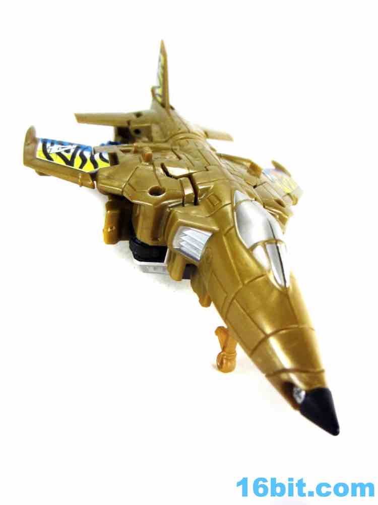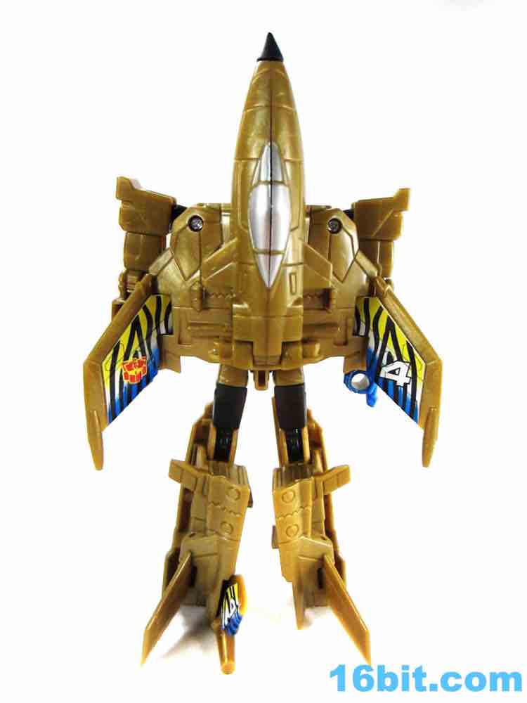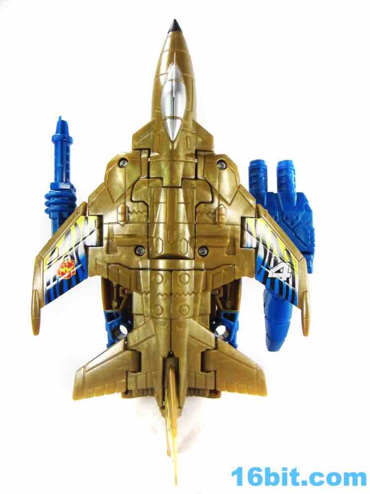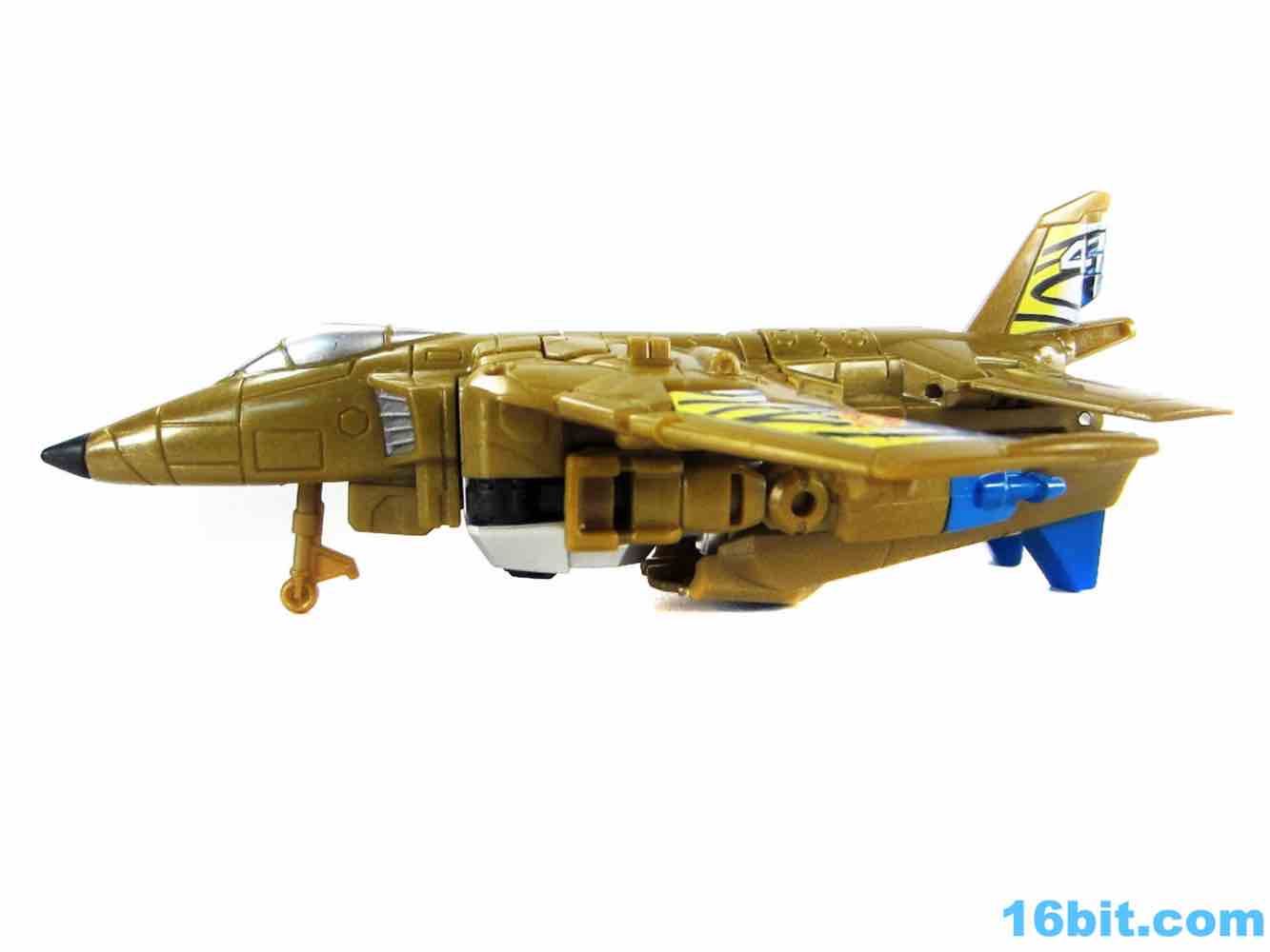 The odd jet out is Quickslinger. This is an update of the original Slingshot, which was notorious for shattering with age through something called Gold Plastic Syndrome, which Hasbro says this toy should not have. This isn't a swirly gold plastic, so hopefully it will hold up to the ages. The jet mode is nice, essentially taking that Firefly body and giving it a silver and gold finish. It's a little gaudy, and it doesn't quite match the rest of the set, but I like it. The wings have a nice tampo with a "4" on it, and these resemble the original toy's labels. These toys all lack the word "AUTOBOT" or "SLINGSHOT" like we saw on the originals.