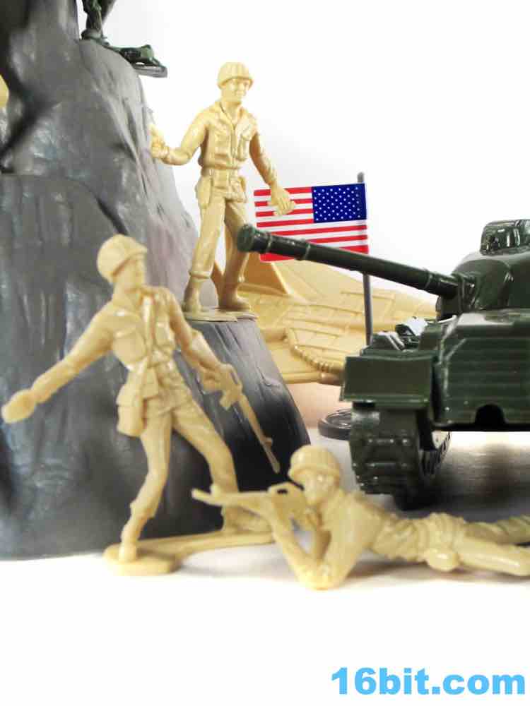 When I got the 60mm Tan vs. Green Soldiers Bucket Figure Set in the mail, I was pretty excited to see how the mountain and vehicles turned out, and if the figures were any different. Well, the good news is the tanks are the same quality as the Desert Tank Command and the figures are similar to the bag we looked at earlier - and joining them are a couple of tan jets, a mountain, and two mounted flags. Is it worth $35 just for these new parts? Not really - but if you don't have any of this stuff in other colors, this is the set to start with.