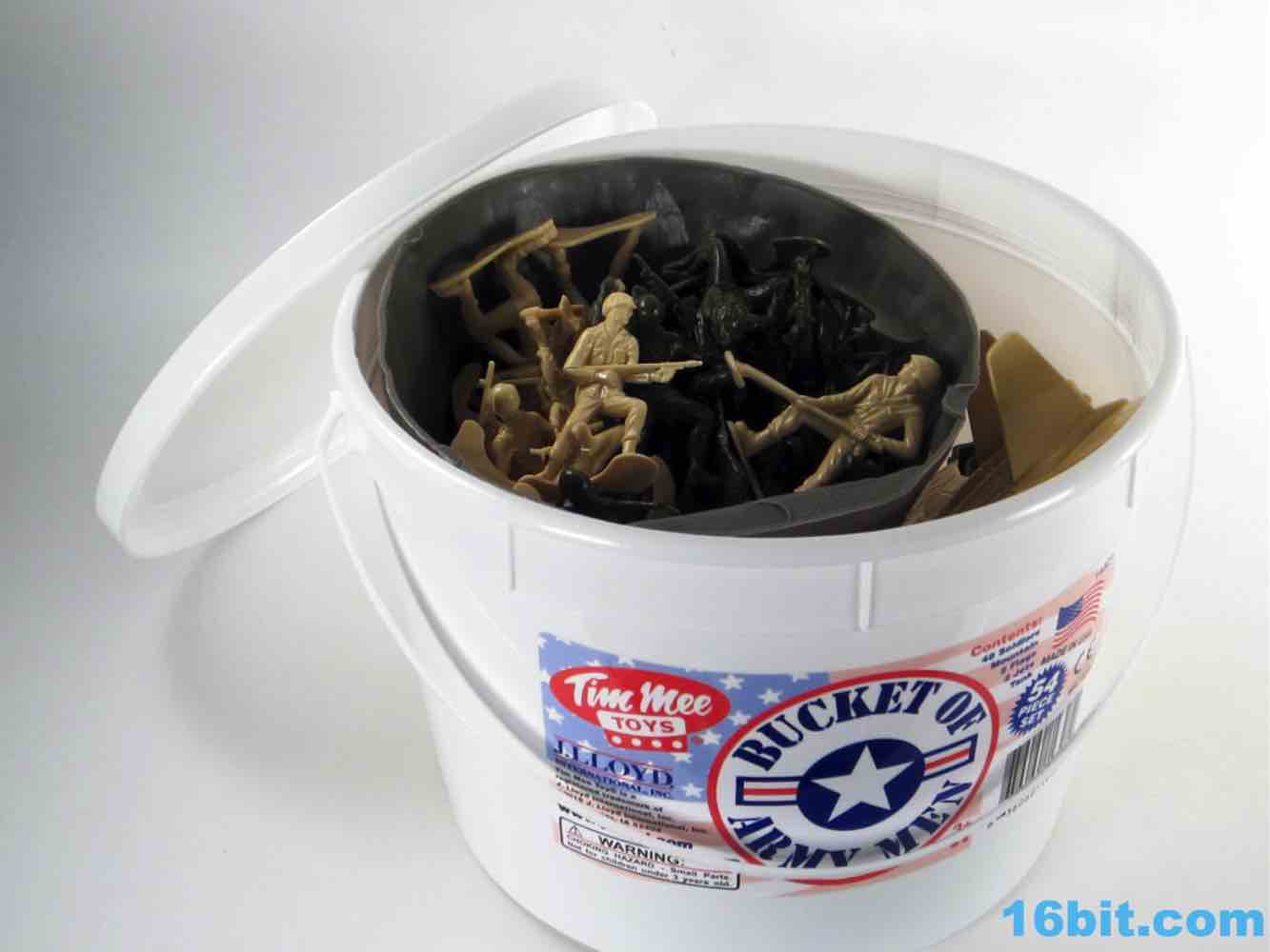 That's pretty much it - what you've got here is a good, but not exactly value-packed bucket of toys. If you want a large amount of variety, this set provides it nicely - and let's be honest, any collector of small figures would probably shell out ten bucks just for the silly little mountain. Right now (as I write this) a 100-figure tan vs. green army man bag is $13.24 ($0.132 cents per figure), the 3-pack of green tanks is $17.40 ($5.80 per tank), and the mountain and jets aren't available elsewhere. At this rate, you've got $6.35 in Army Men, $5.80 worth of tanks, and the remaining $22.85 nets you 2 jets, 2 flags, and a mountain. If this were offset by more soldiers, I'd say this is a fantastic deal. As it is, I'll say it's decent as a collector set. It looks cheap, but it doesn't feel cheap - it also isn't cheap, nor are there lots of the mountains to be had on eBay. (At press time, there are none.) I know it's sounding like I'm waffling, because I am - I'd steer you toward the cheaper sets first, especially the sci-fi and fantasy ones that aren't sold in other configurations. If you like the dinosaurs or the Galaxy Laser Team and want more of this kind of thing, come back and try the bucket. It's a decent sampler platter, and I hope to see more stuff like this. Heck, I'd dream of new stuff like this but it's hard to come by.