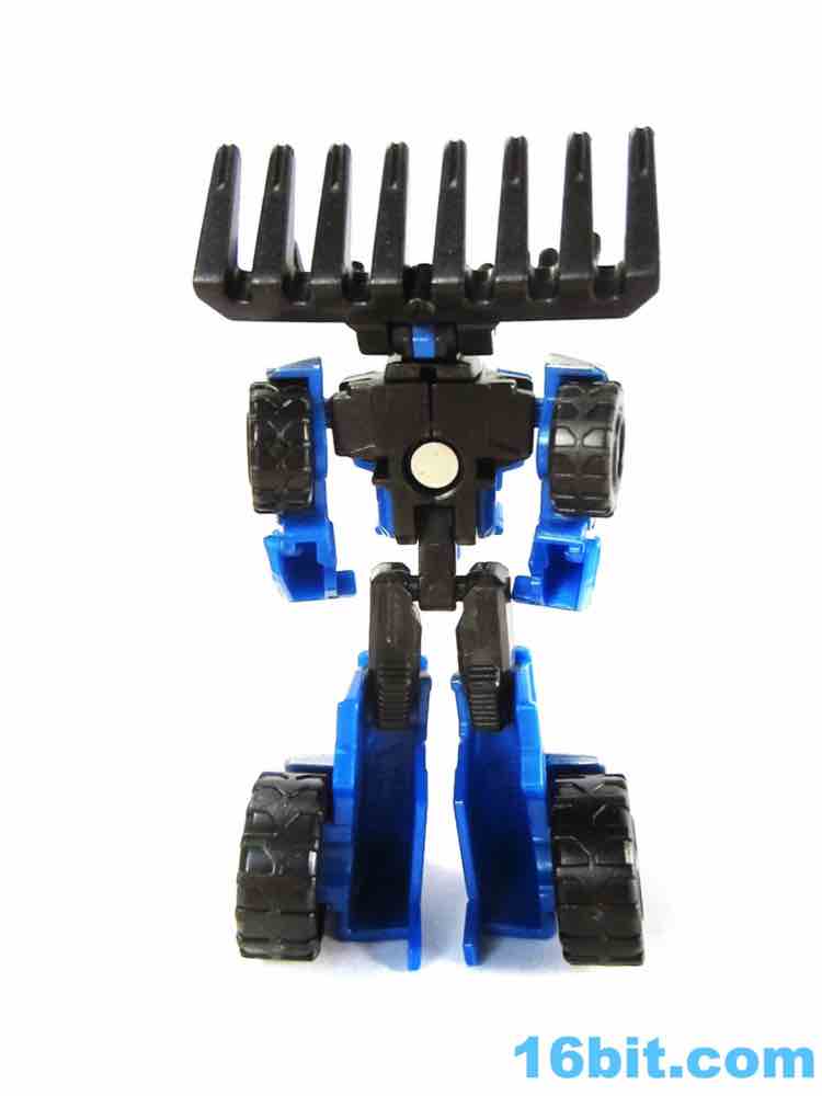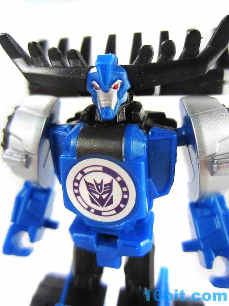 This tiny Decepticon borrows animal elements for its robot mode, specifically adding antlers so someone can giggle about John Deere or some such. In the cartoon they play this feature up so Thunderhoof can impersonate a piece of local folklore, but you'll just appreciate that the plow and antlers successfully serve a dual function.