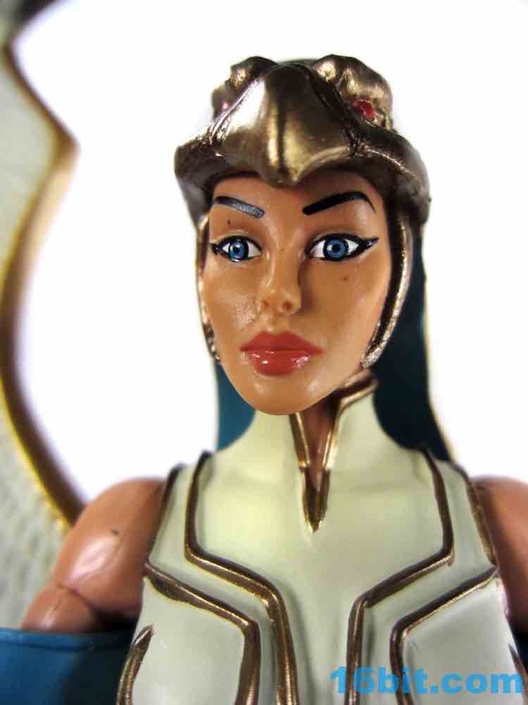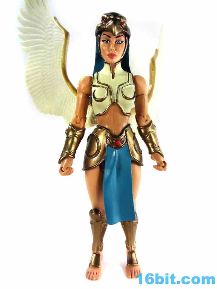 This character didn't get a lot of face time on the cartoon, but fans of any series tend to identify "important" characters - even if they have no screen time or minimal dialogue - and inflate their importance to grandiose levels. King Grayskull didn't do a heck of a lot either, and oddly, we got his lion before his lady friend. That seems kinda wrong, but such is the way of toy lines. We're pretty lucky we got Veena at all, and she sports the tone, bare-midriff, crop top look that wasn't totally uncommon on TV and music videos at the time. A golden "skirt" with some blue cloth and a red gem is offset by an off-white top with gold trim - and matching articulated wings. The armor on the arms is new (and awesome), the sandals are new, the greaves are new... this is a quality product. There's a reason it jumped in value considerably after launch, unlike other figures which stayed at issue price or even dropped.